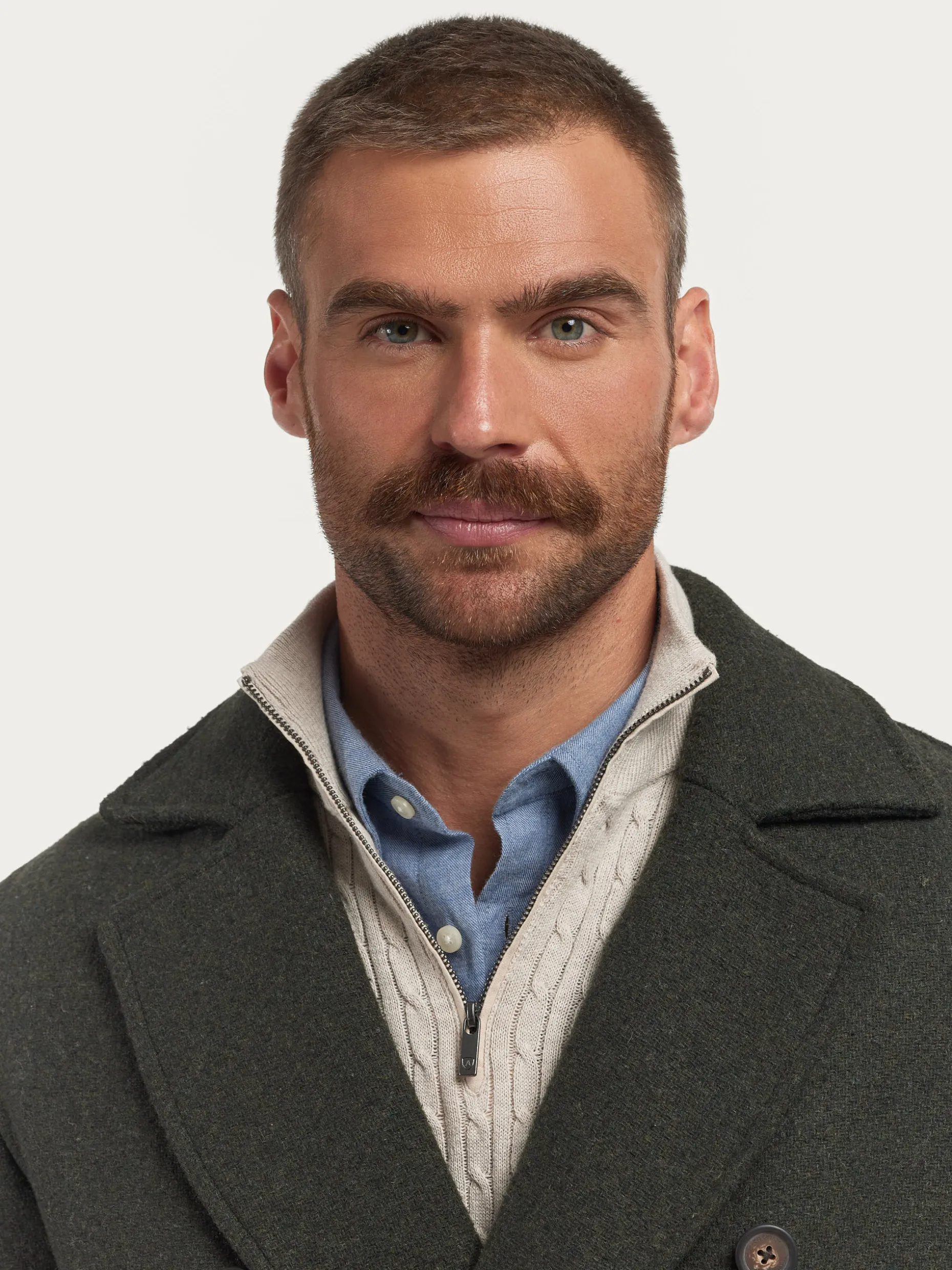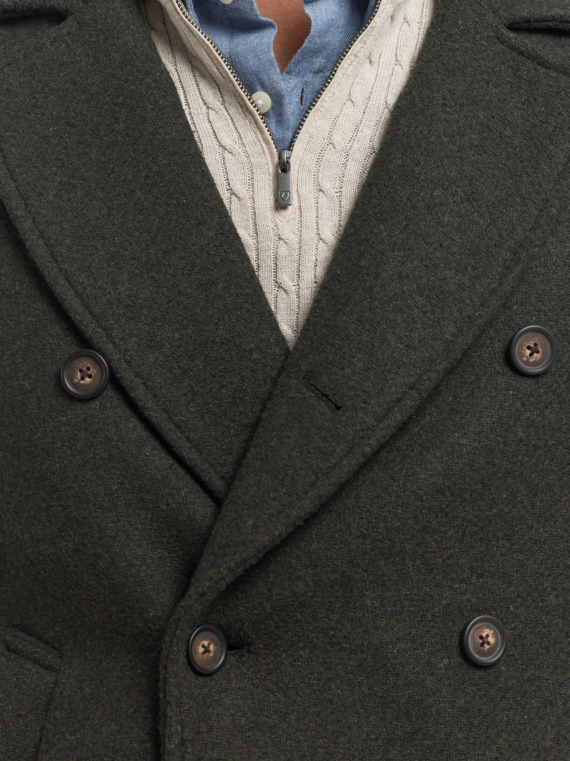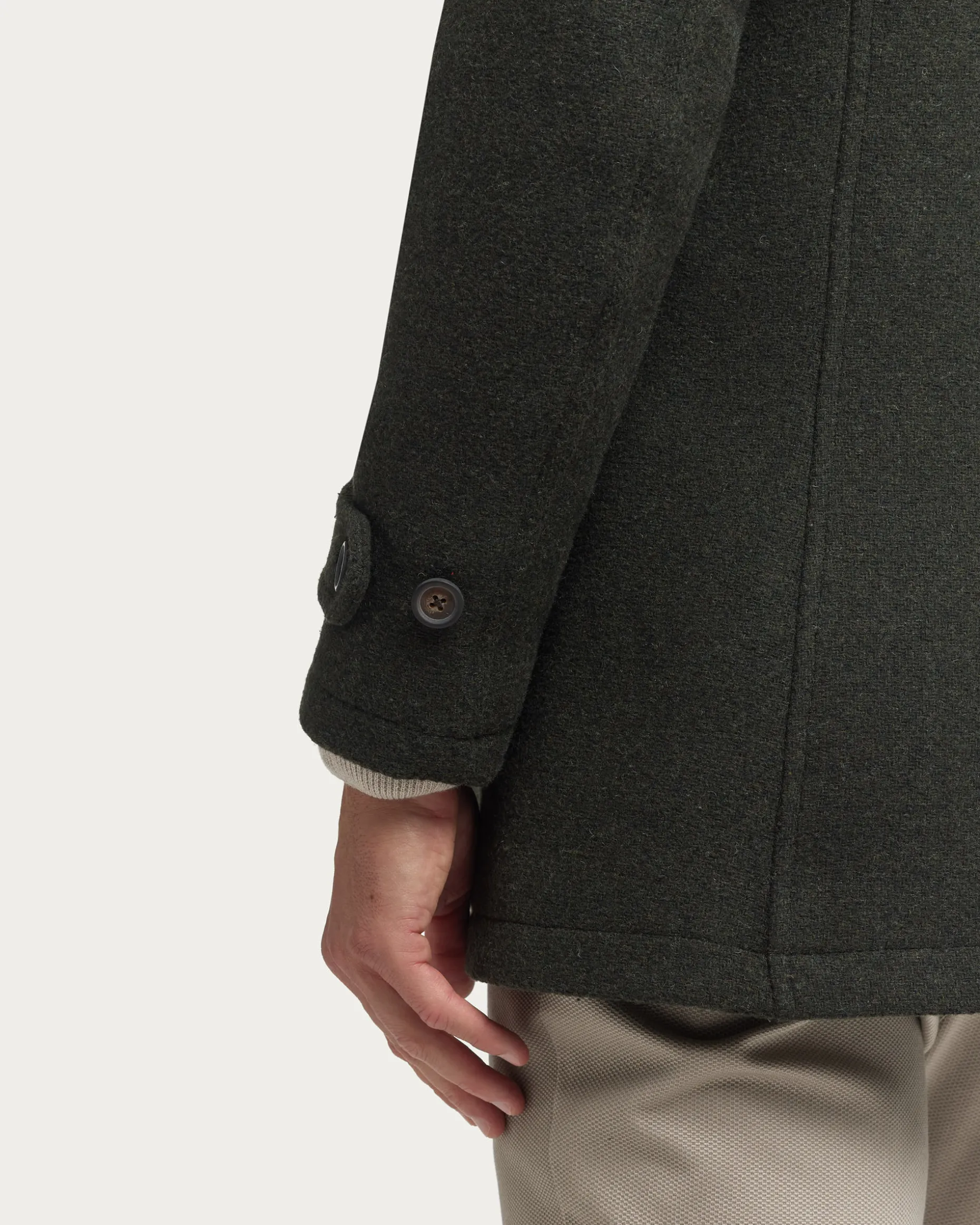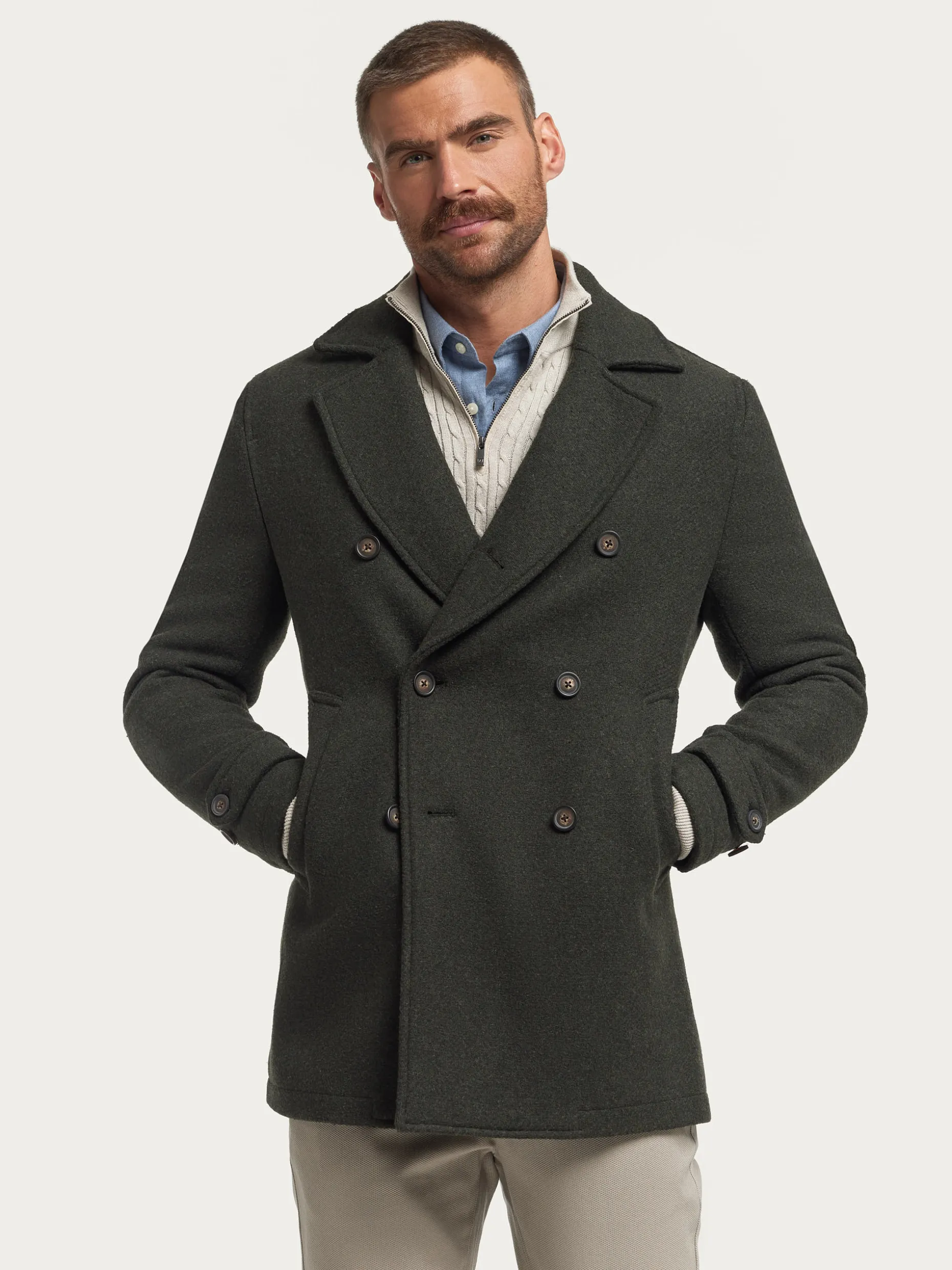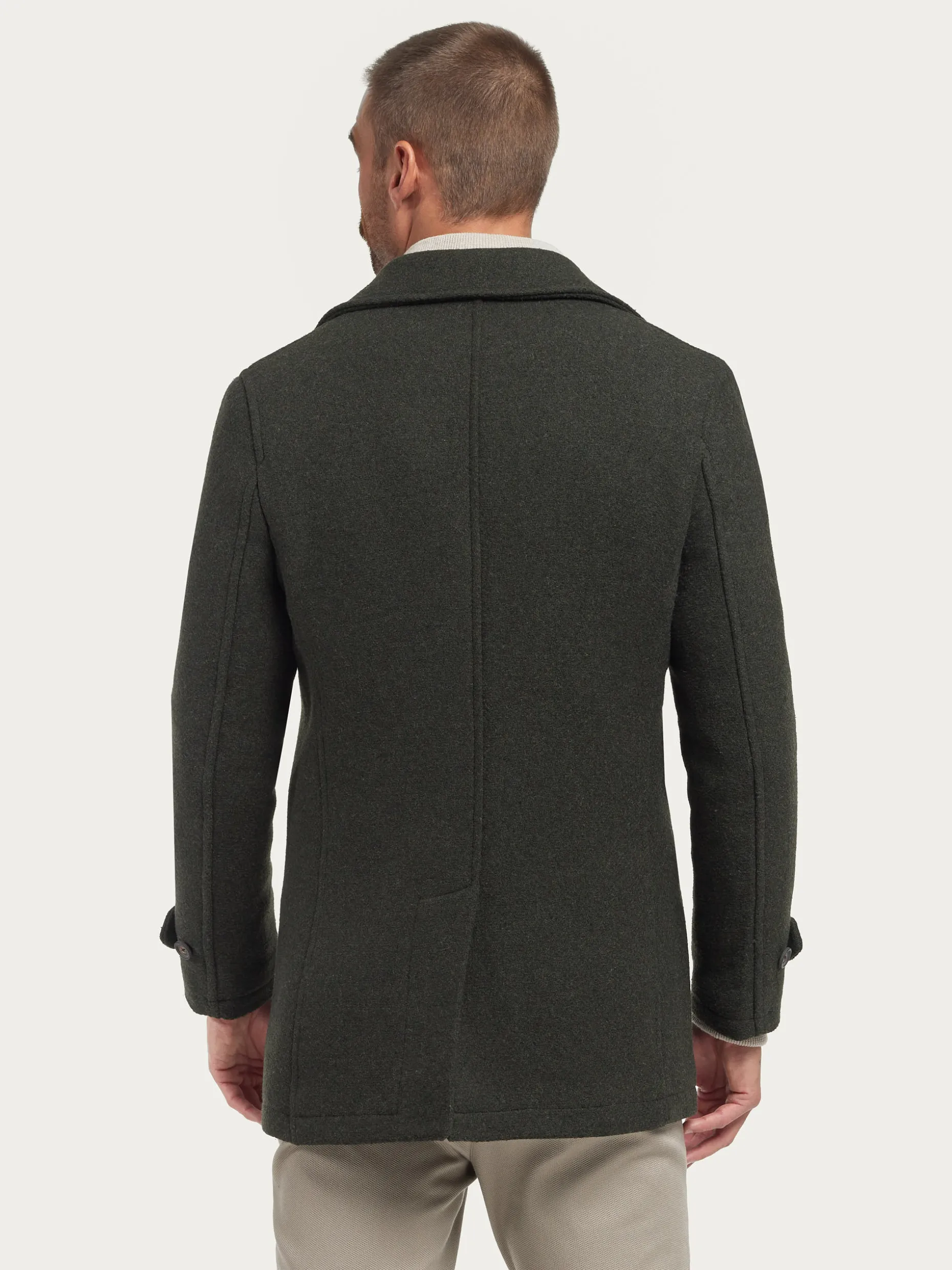 Abrigo de corte regular fit que cuenta con cuello y solapa, cierre central cruzado mediante botonadura en efecto madera y dos bolsillos en la cintura. Abertura en el centro de la espalda. Forrado en su interior con dos bolsillos.