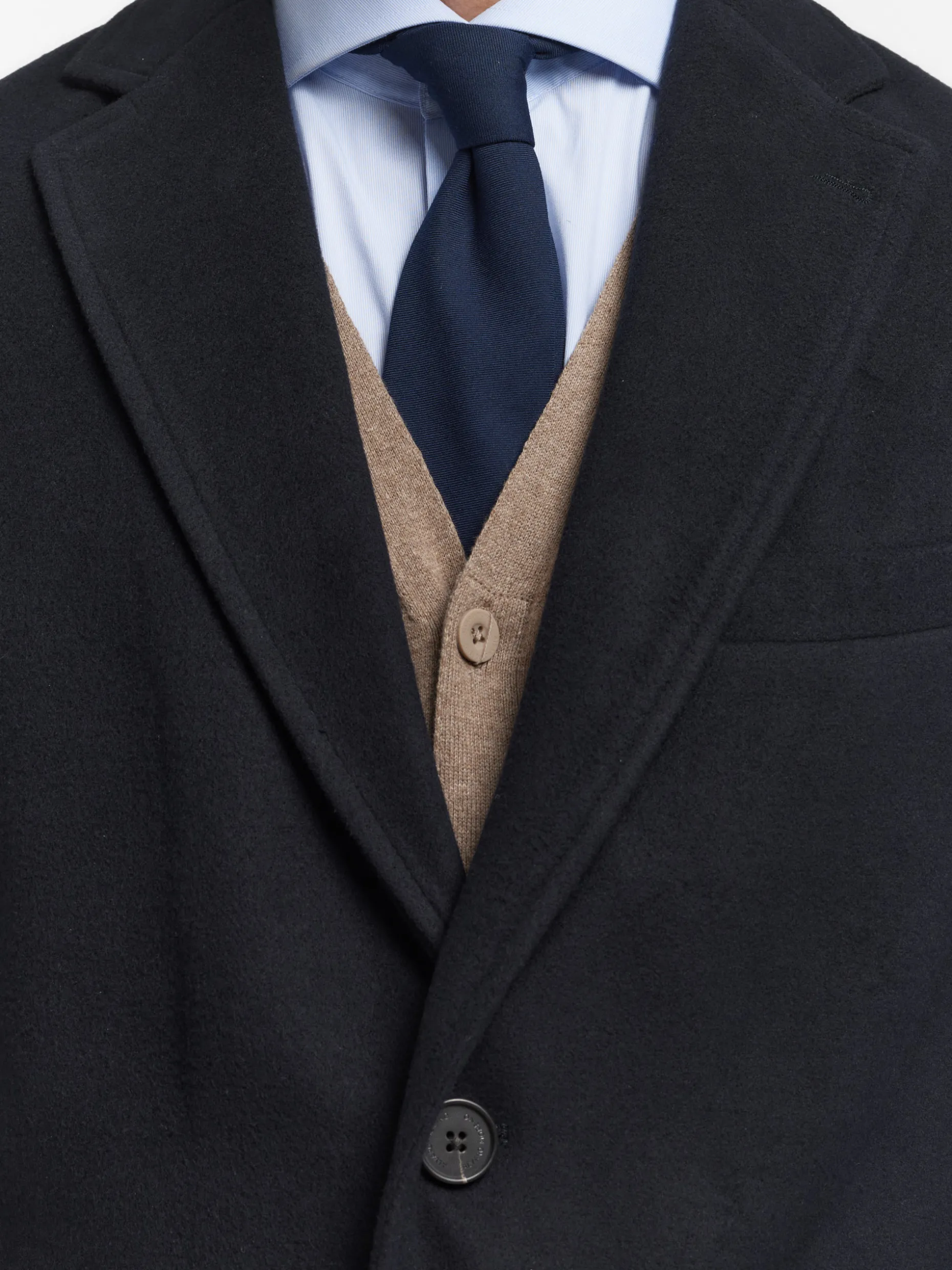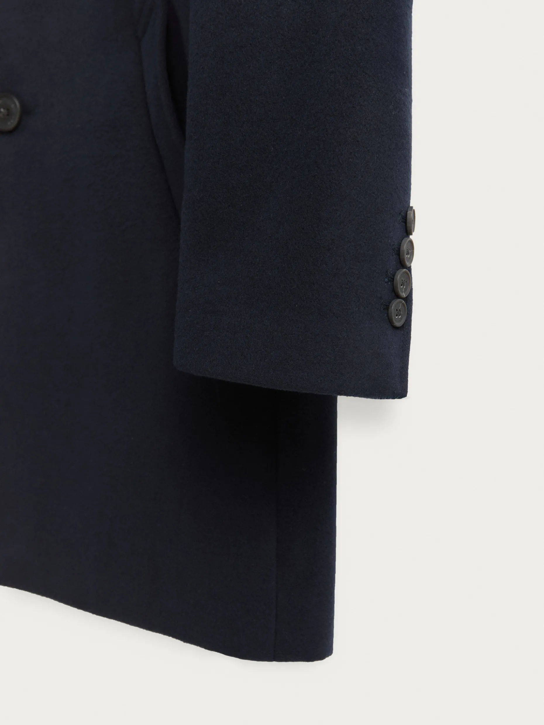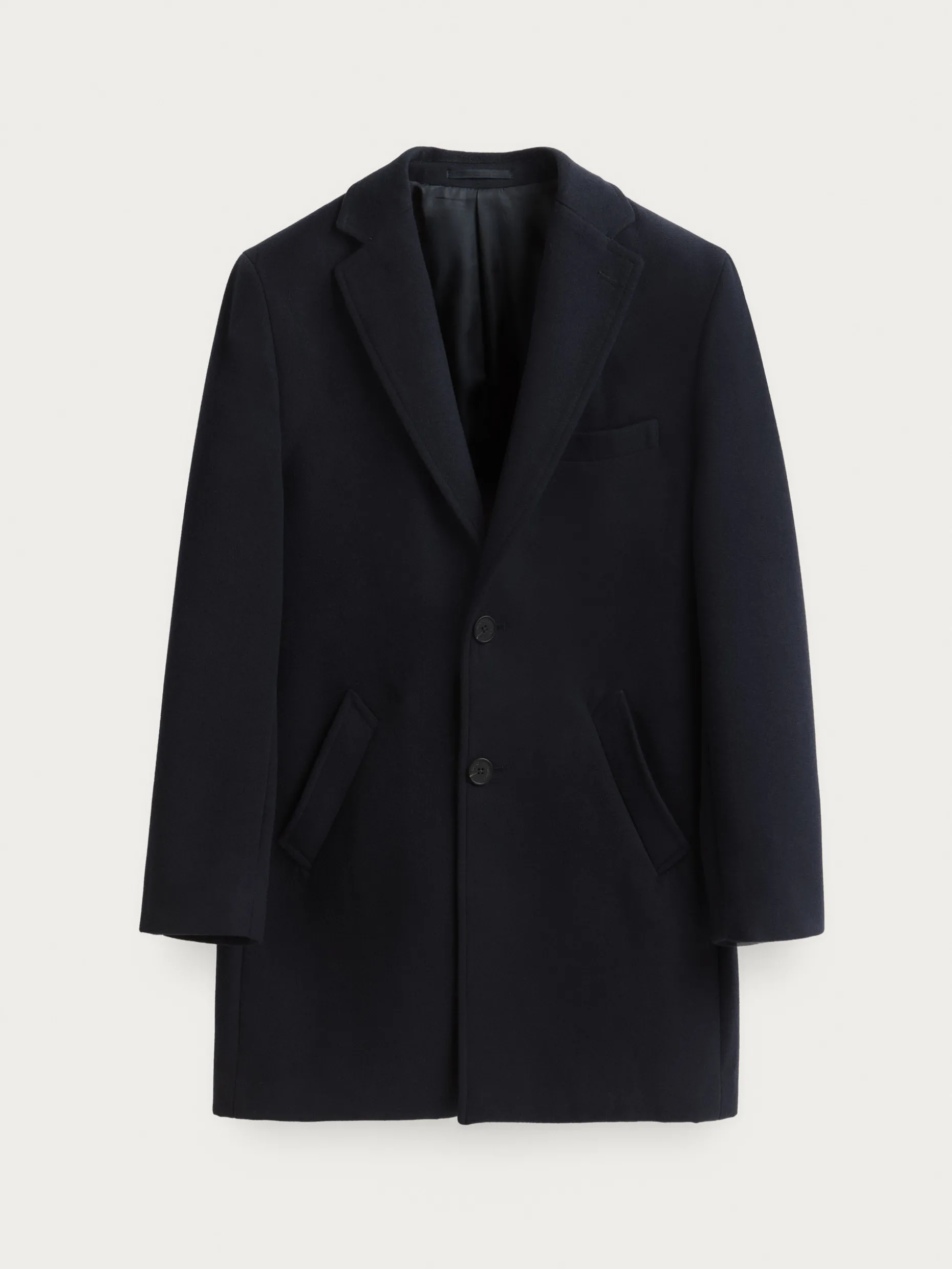 Abrigo de paño liso con cuello y solapa. Cierre central mediante botones, manga larga con botones en su terminación y dos bolsillos a la altura de la cintura. Abertura central en el bajo de la espalda. Corte regular fit.