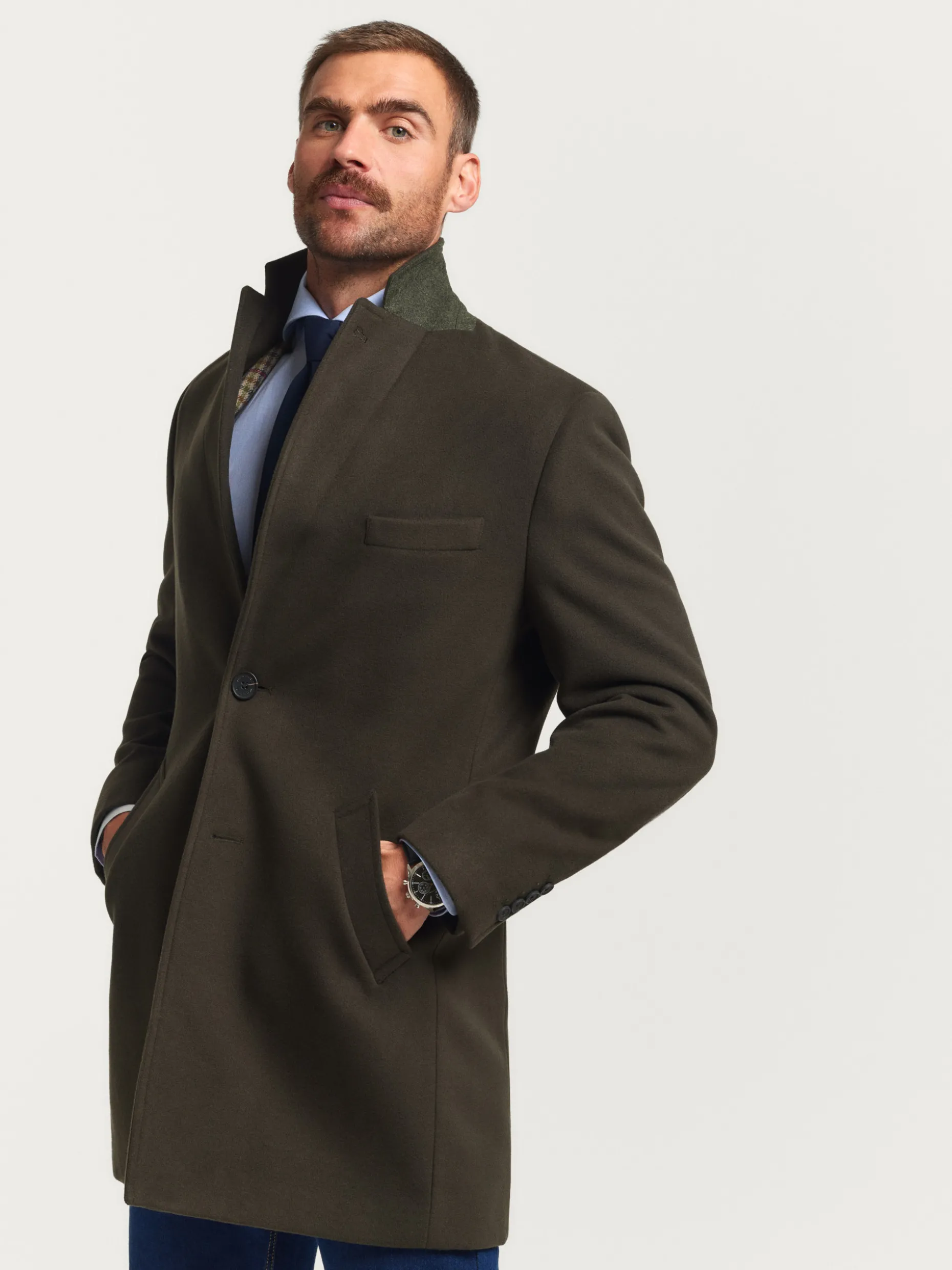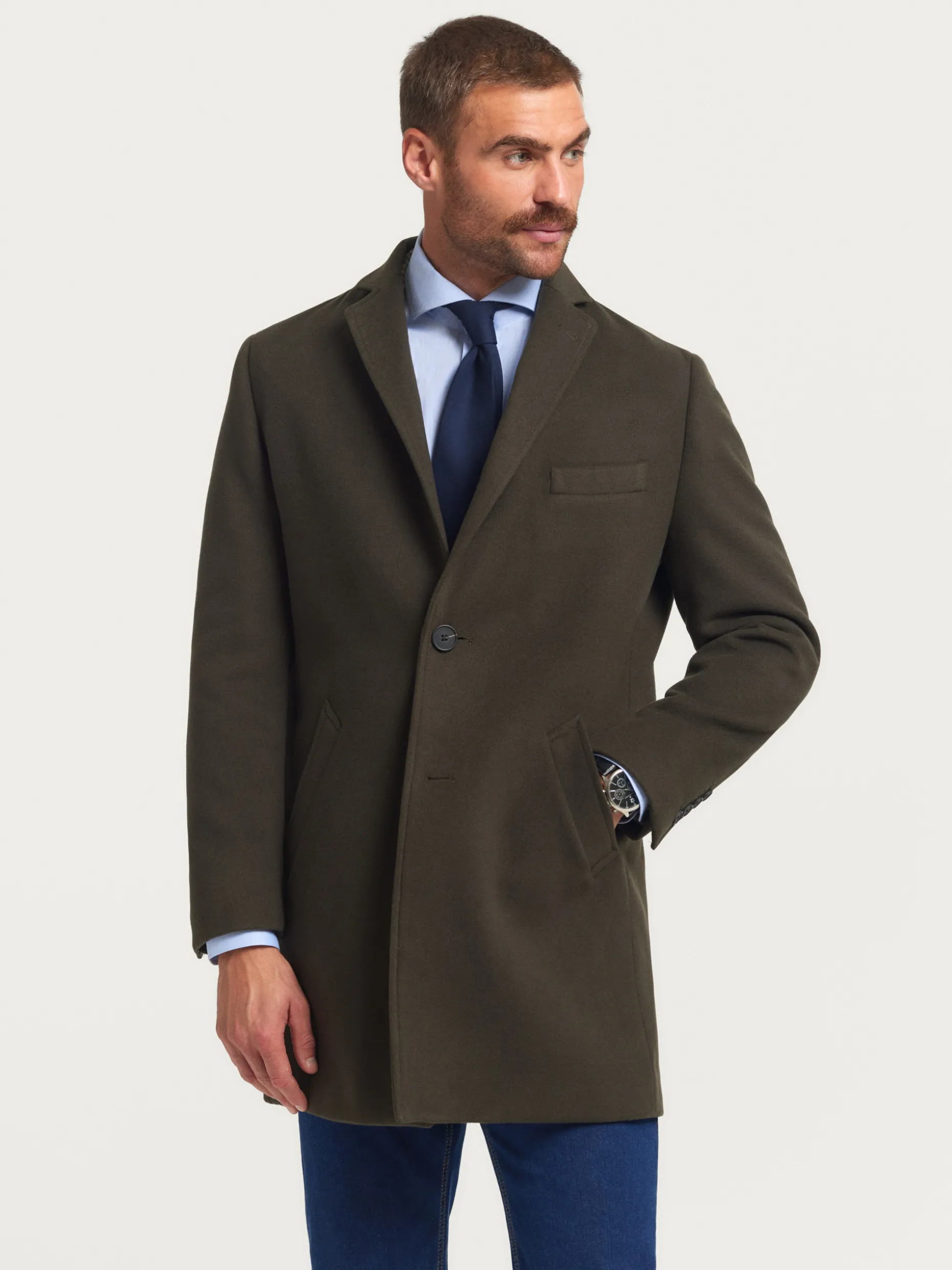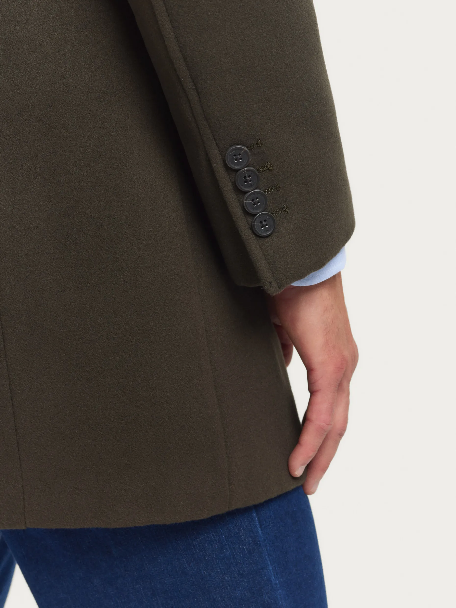 Abrigo de paño liso con cuello y solapa. Cierre central mediante botones, manga larga con botones en su terminación y dos bolsillos a la altura de la cintura. Abertura central en el bajo de la espalda. Corte regular fit.