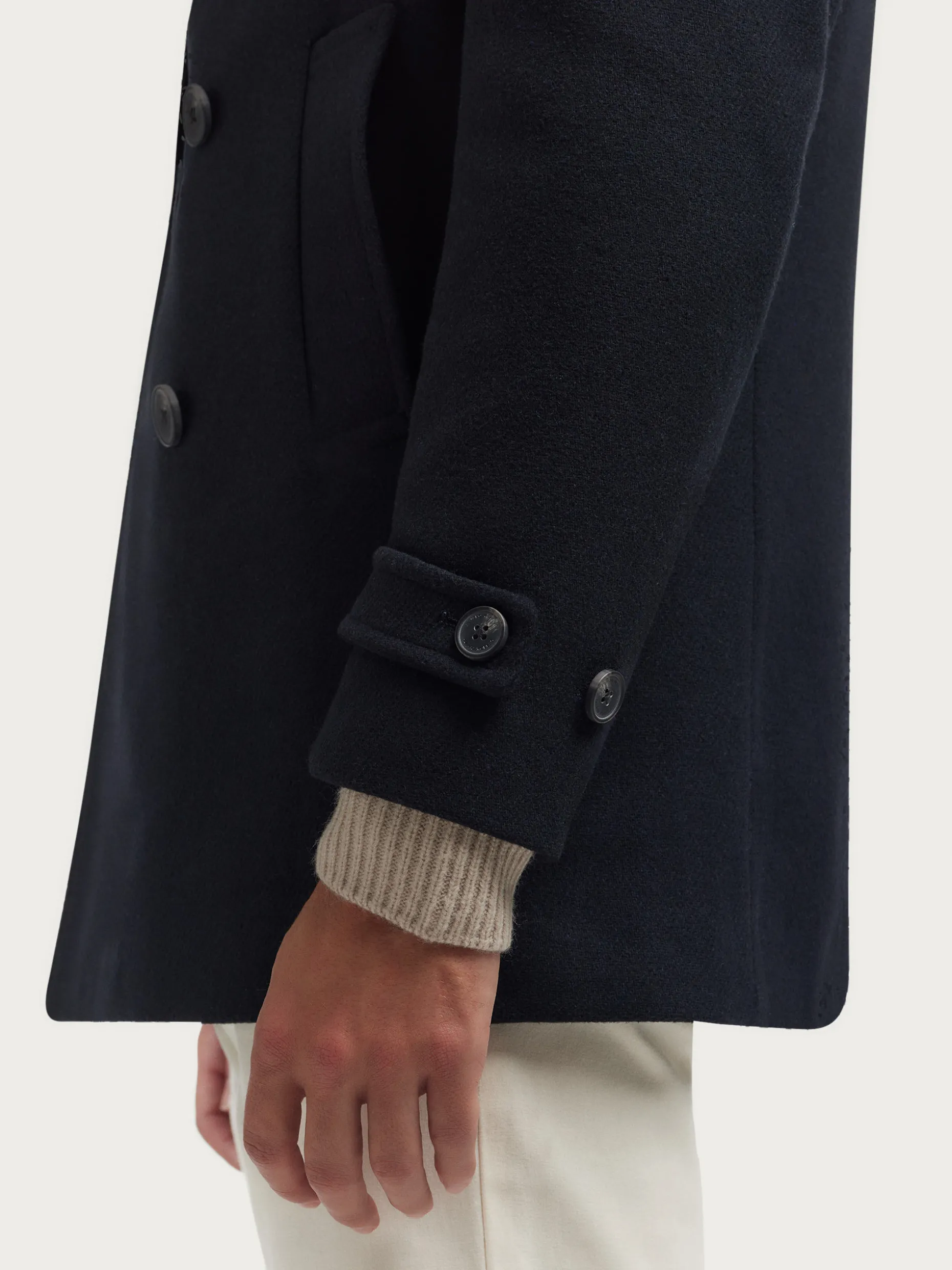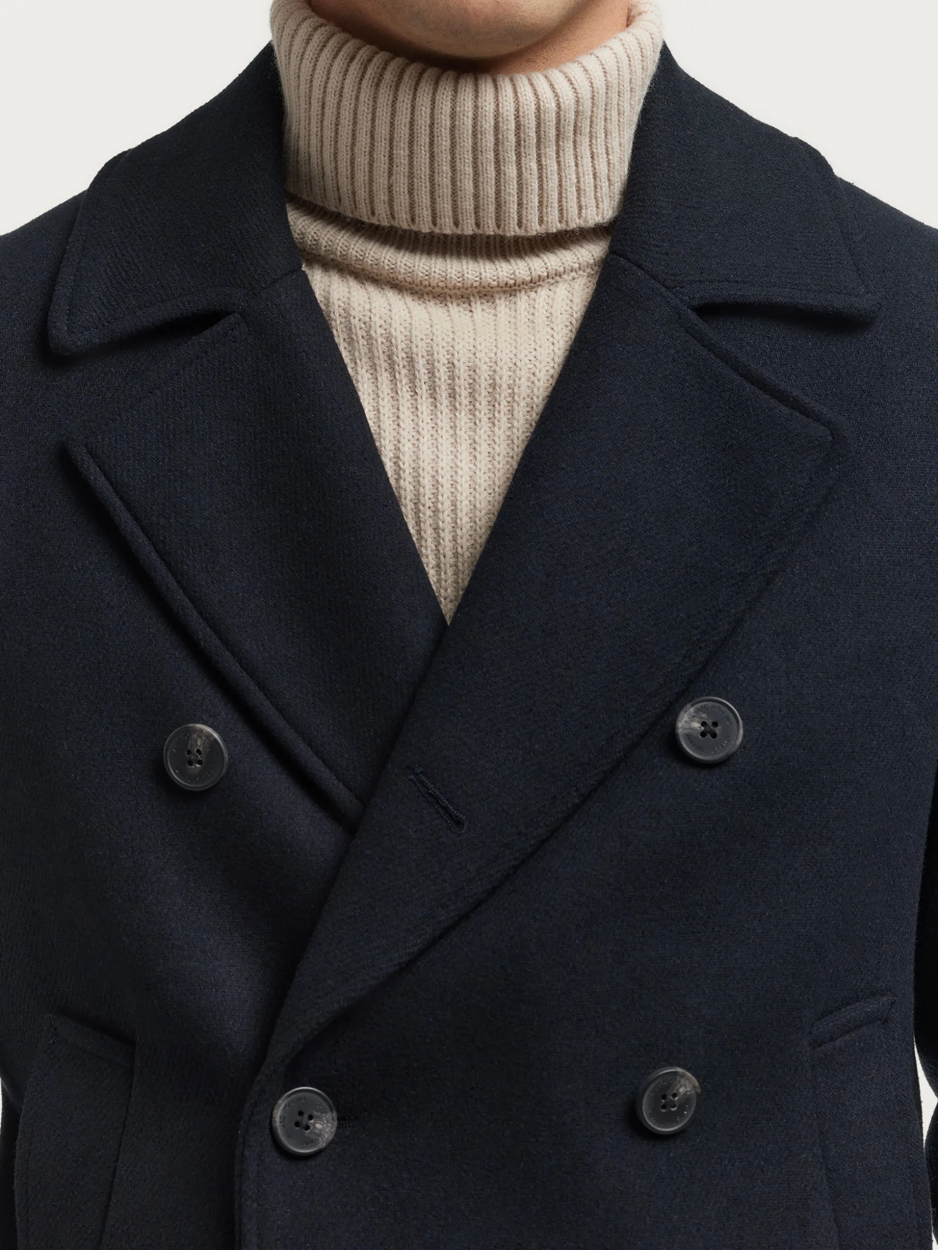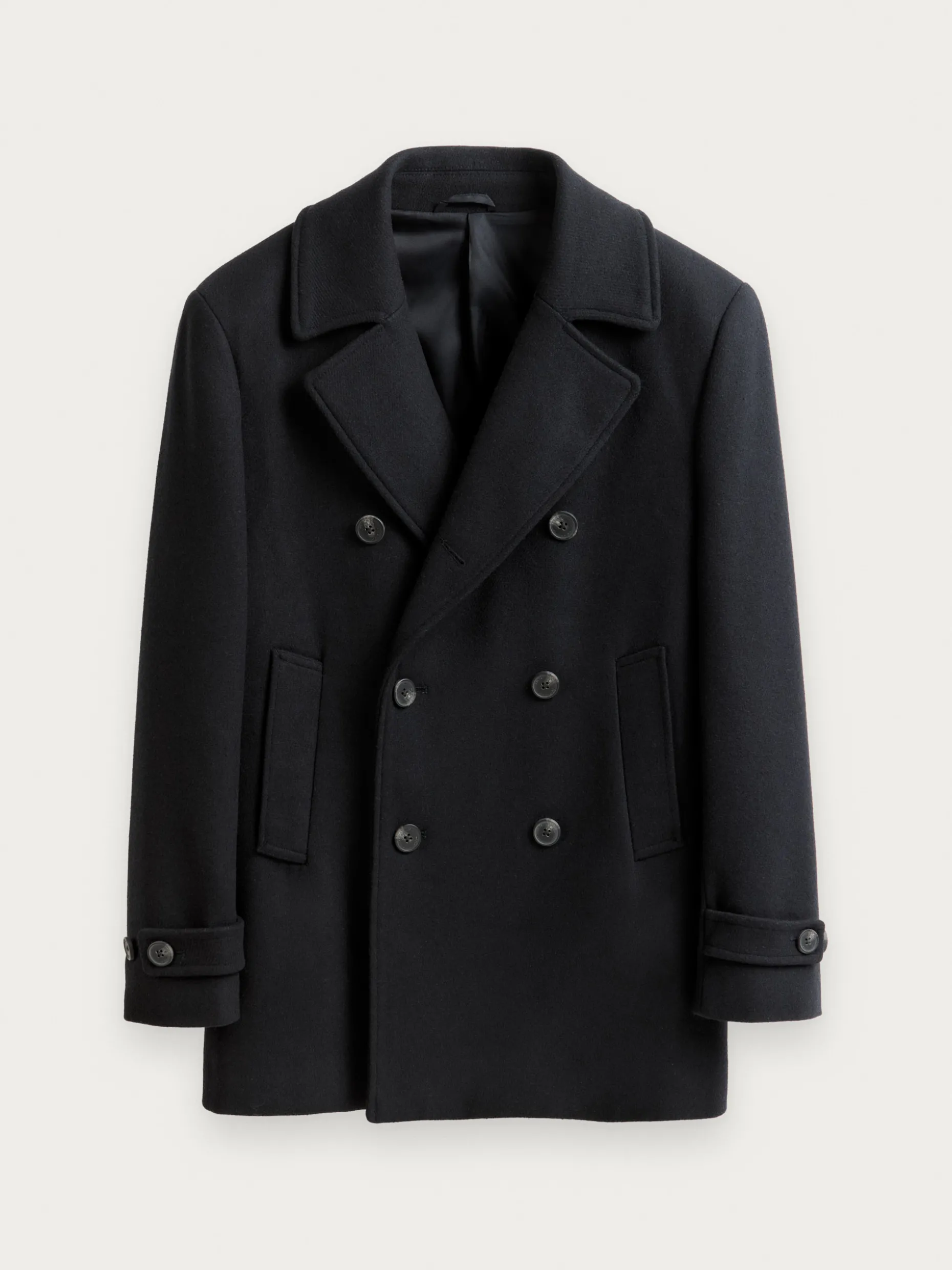 Abrigo de corte regular fit confeccionado en diferentes materiales de los cuales destaca la lana. Cuenta con cuello y solapa, cierre central cruzado, dos bolsillos en la cintura, abertura en el bajo de la espalda y detalle con dos botones en el puño de las mangas. Forrado en su interior con dos bolsillos.