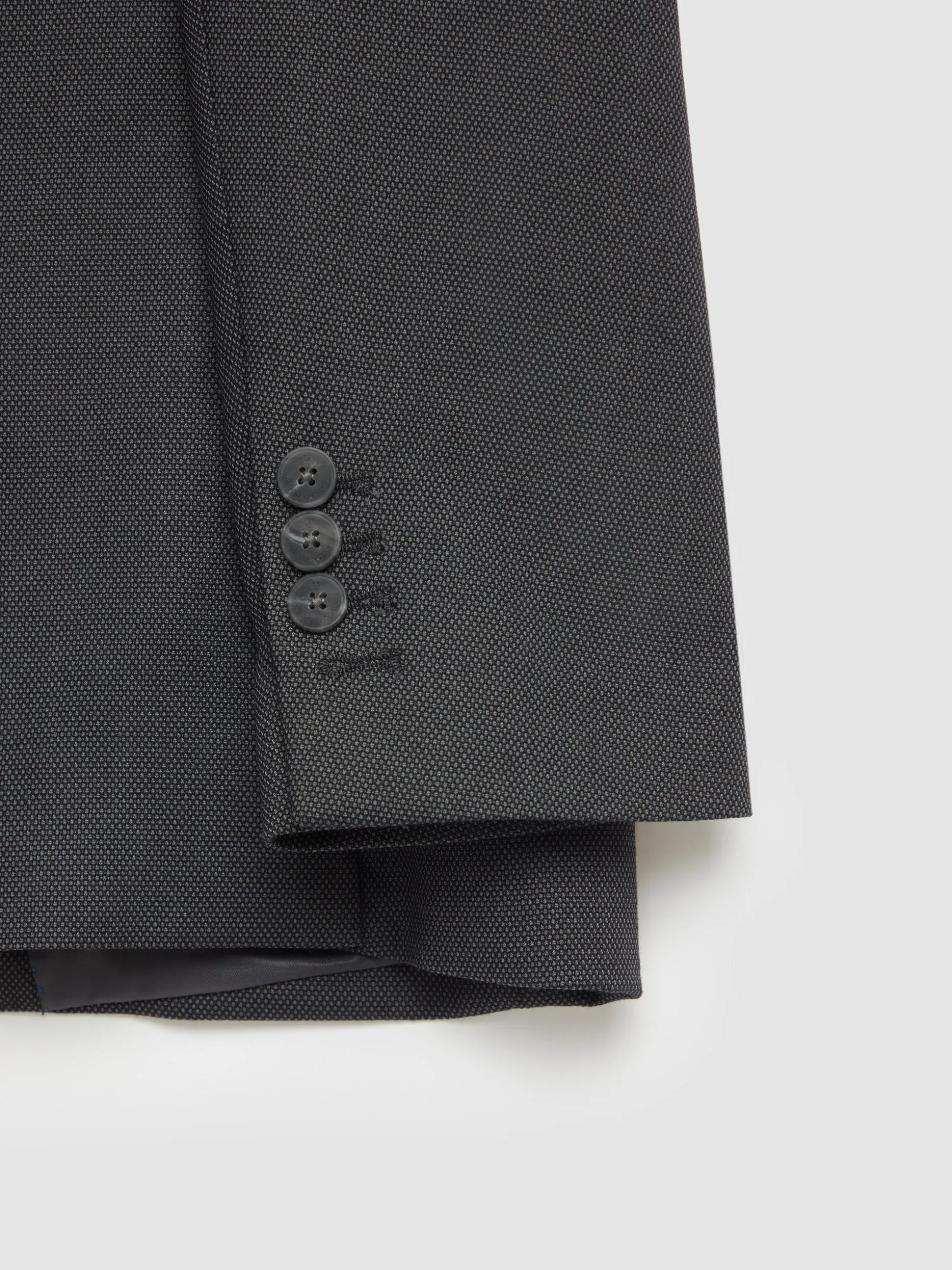 Americana con cuello y solapa en tejido de ojo de perdiz. Cierre central mediante botones, bolsillo de ojal en el pecho, tres bolsillos de solapa en la cintura y puños con botones decorativos. Interior forrado y con bolsillos.