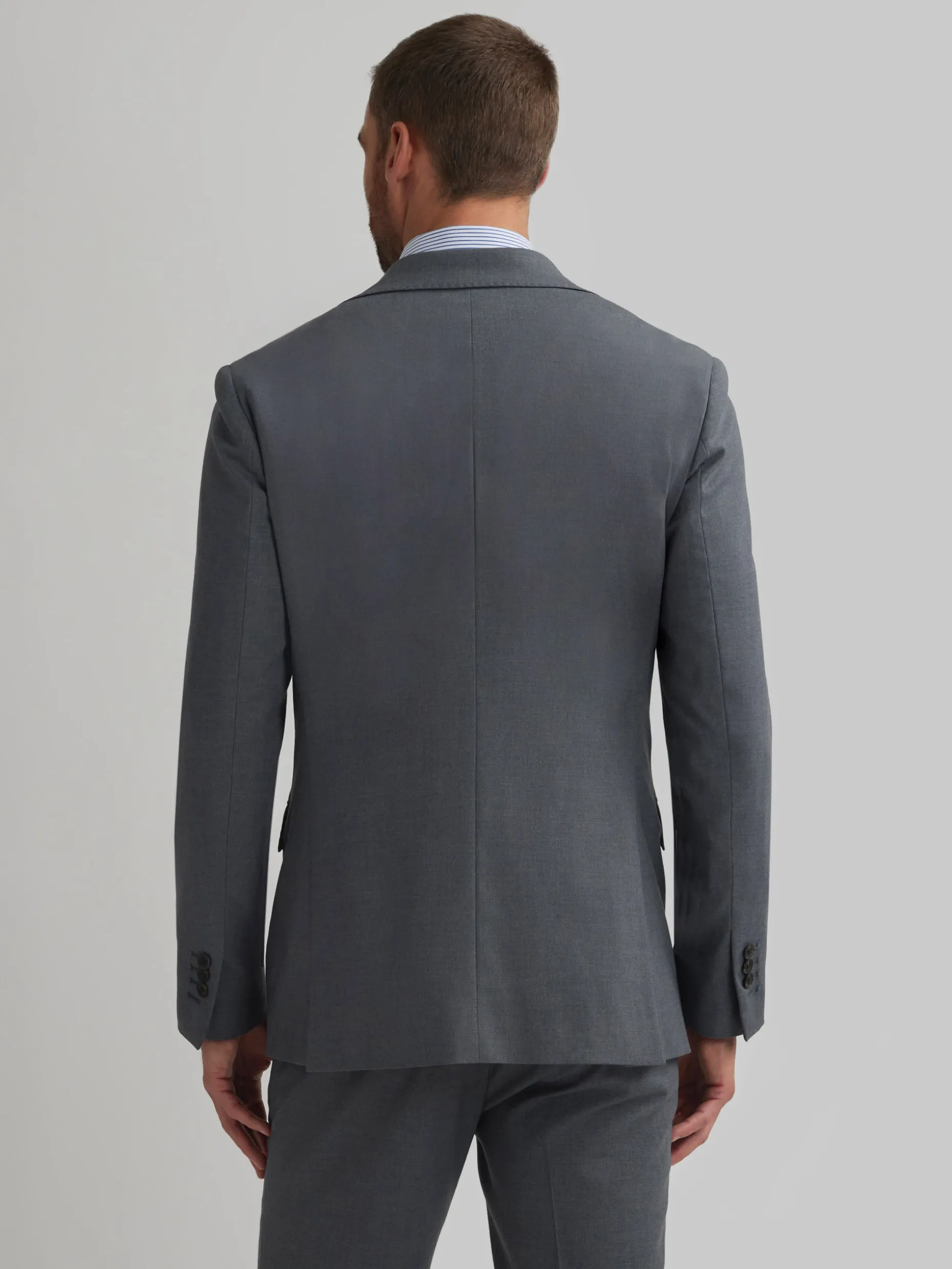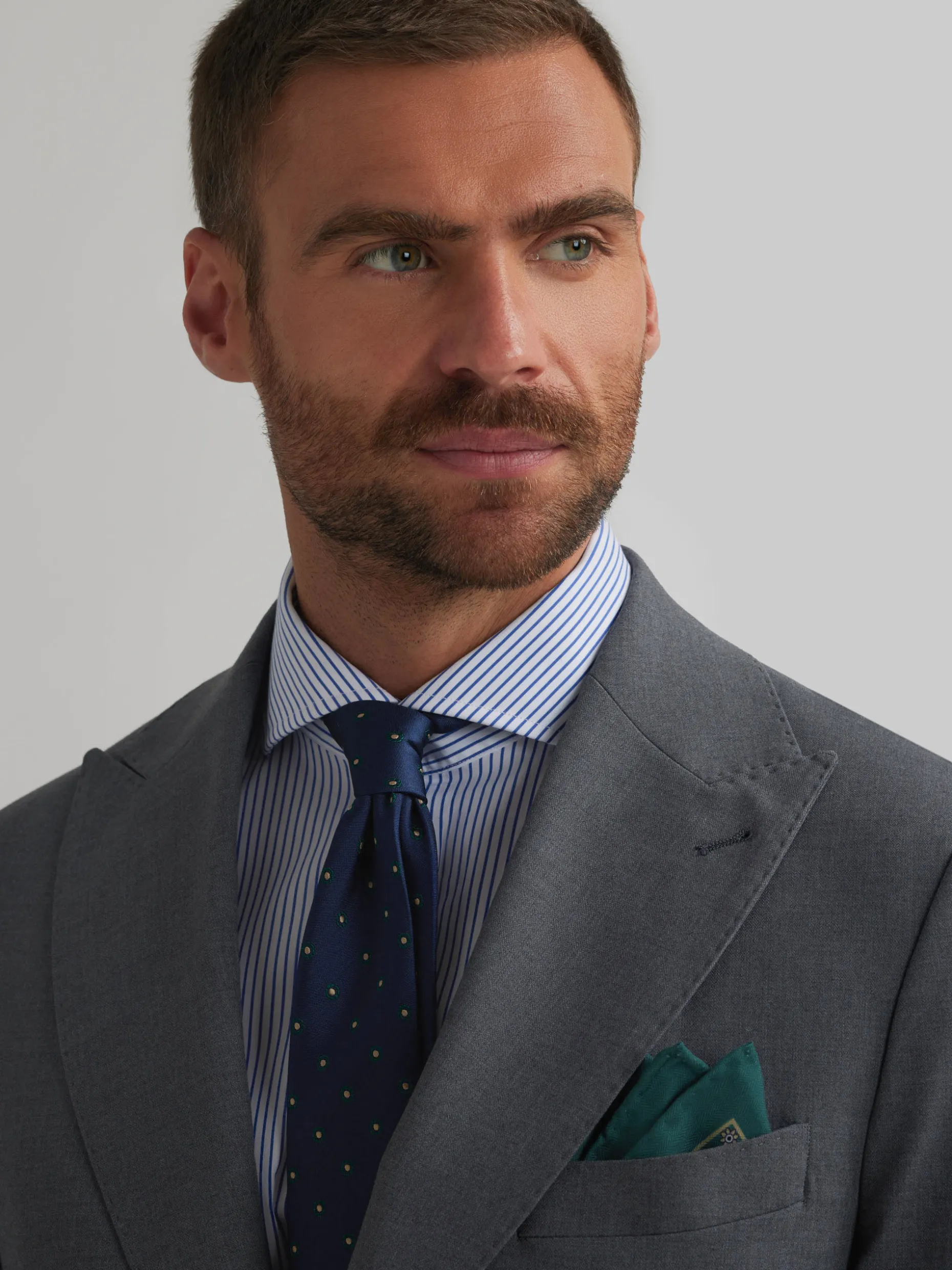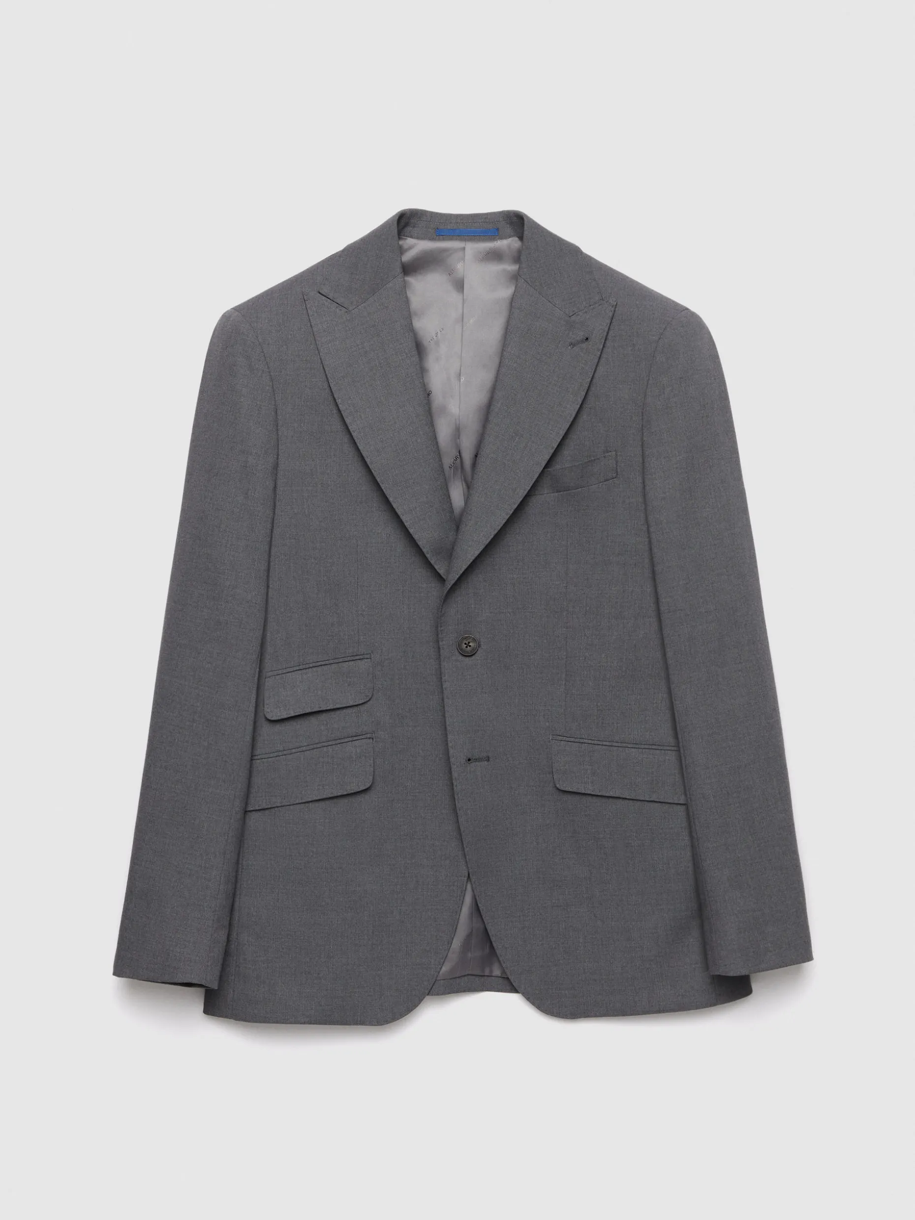 Americana de diseño fil a fil con un corte más relajado y con cuello y solapa ligeramente más ancha de estilo punta de lanza. Cierre central simple, bolsillo a la altura del pecho, tres bolsillos de solapa en la cintura con una leve inclinación y puños con terminación de botones. Interior forrado y con bolsillos.