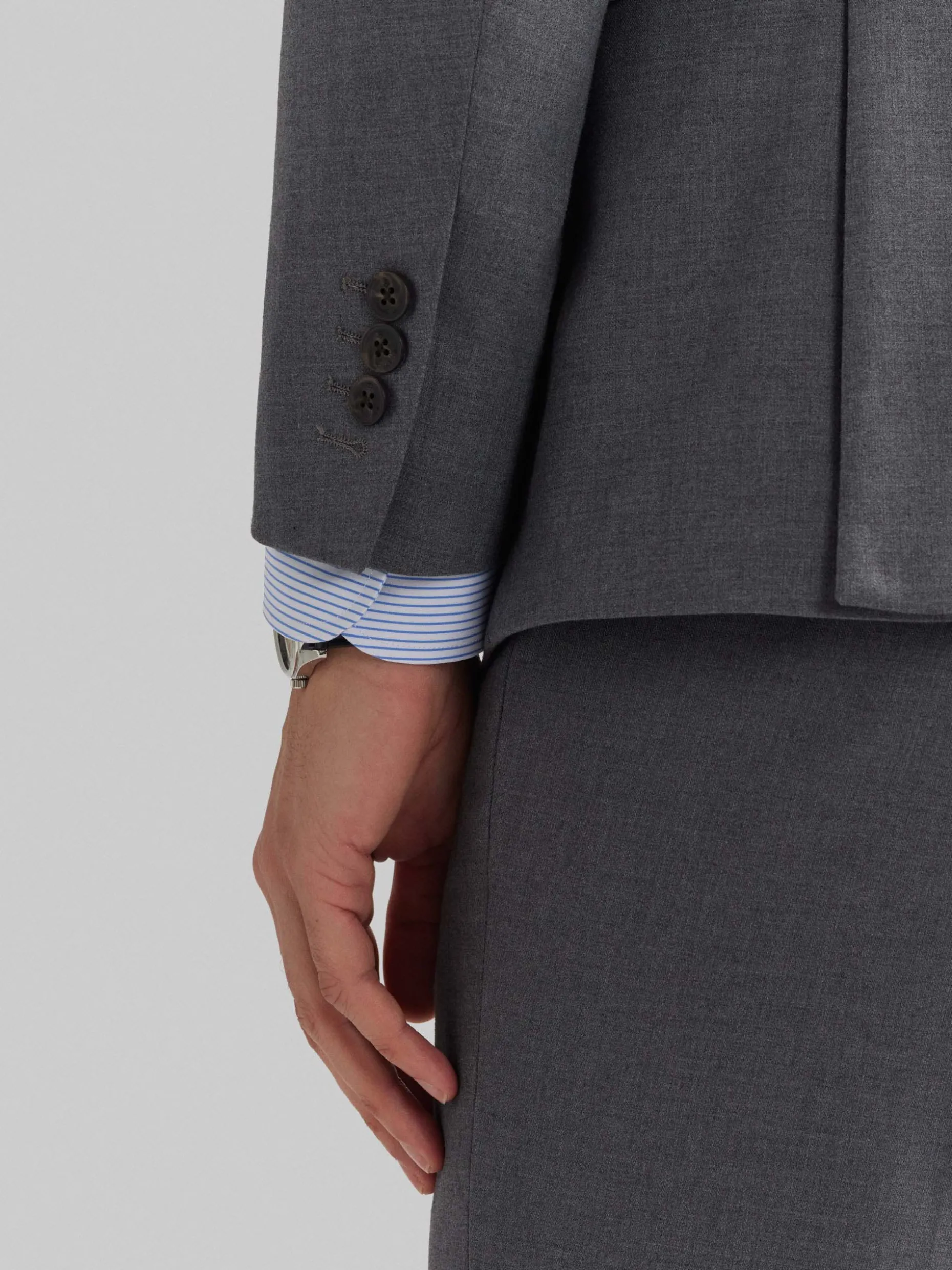 Americana de corte regular fit confeccionada en tejido liso con cuello y solapa ligeramente más anchos. Cierre central cruzado mediante cuatro botones. Bolsillo en el pecho, tres bolsillos de solapa en la cintura y puños con botones en su terminación. Pinzas en el delantero. Interior forrado y con bolsillos.