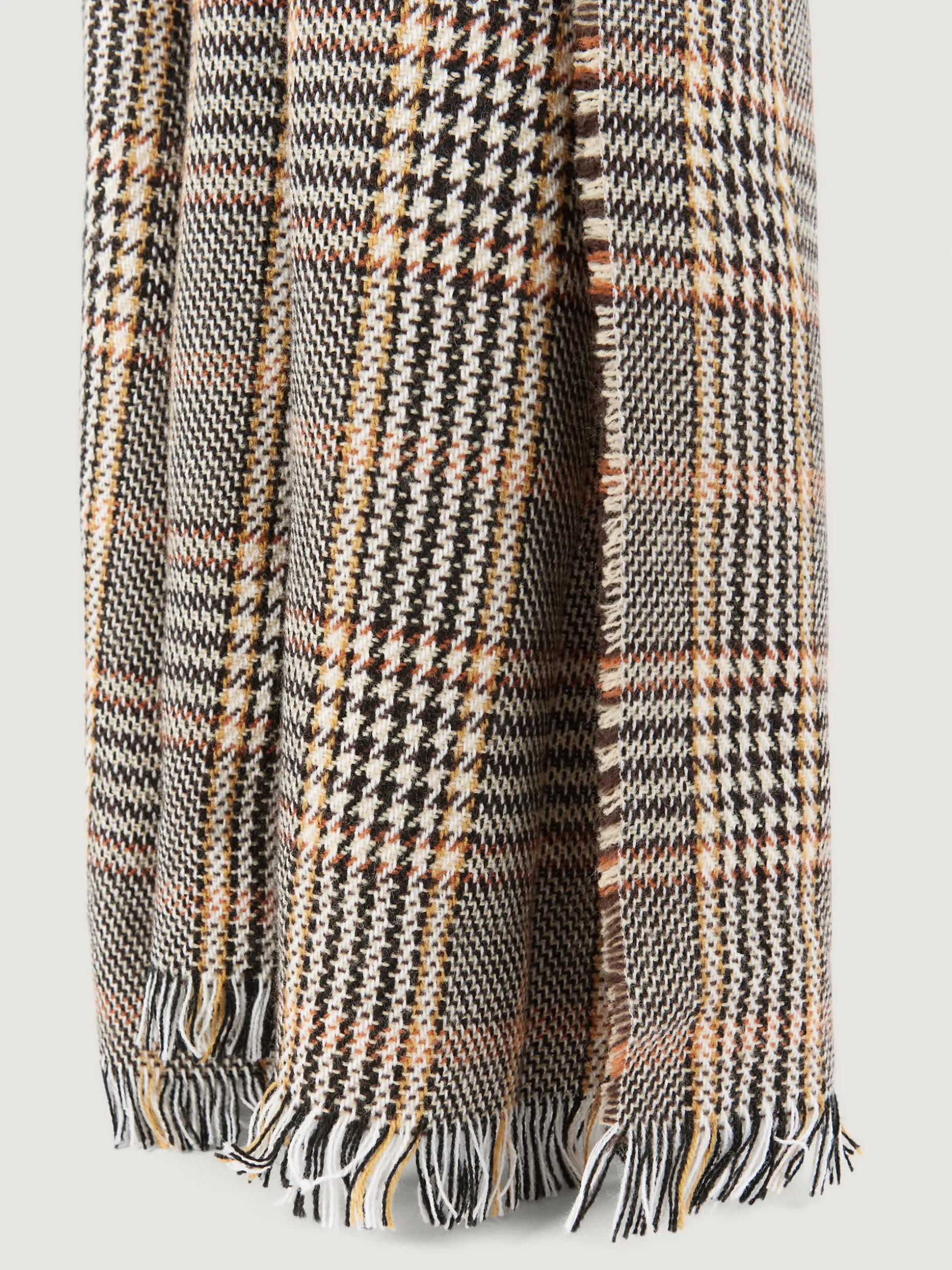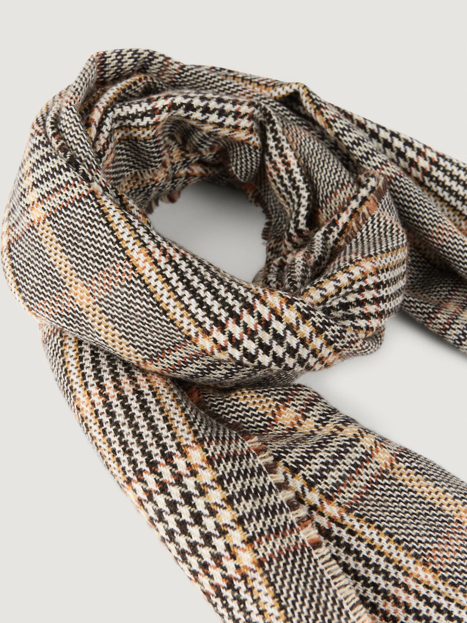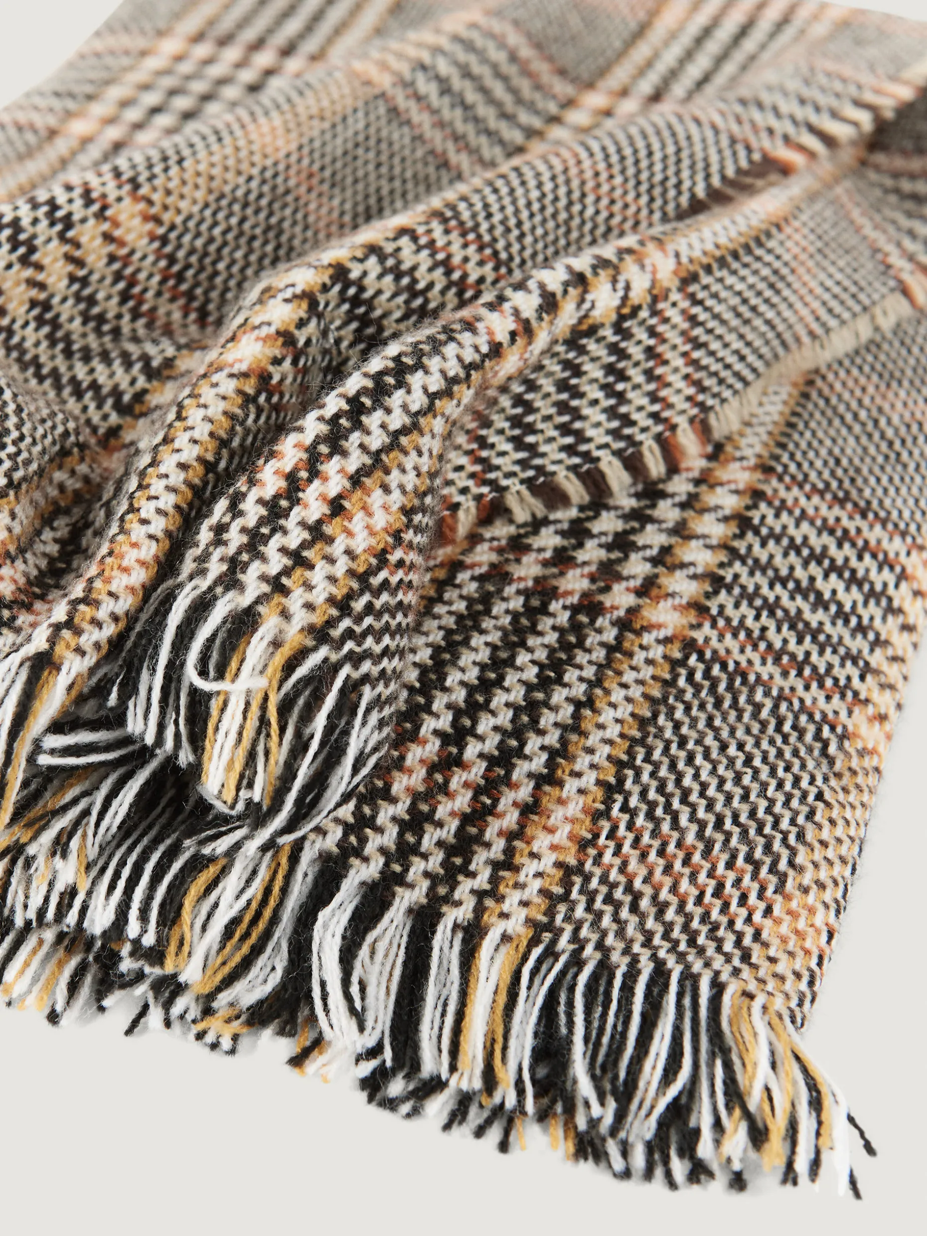 Bufandas con diseño de cuadros confeccionada en 100% acrílico. Terminación de flecos decorativos y tacto suave.