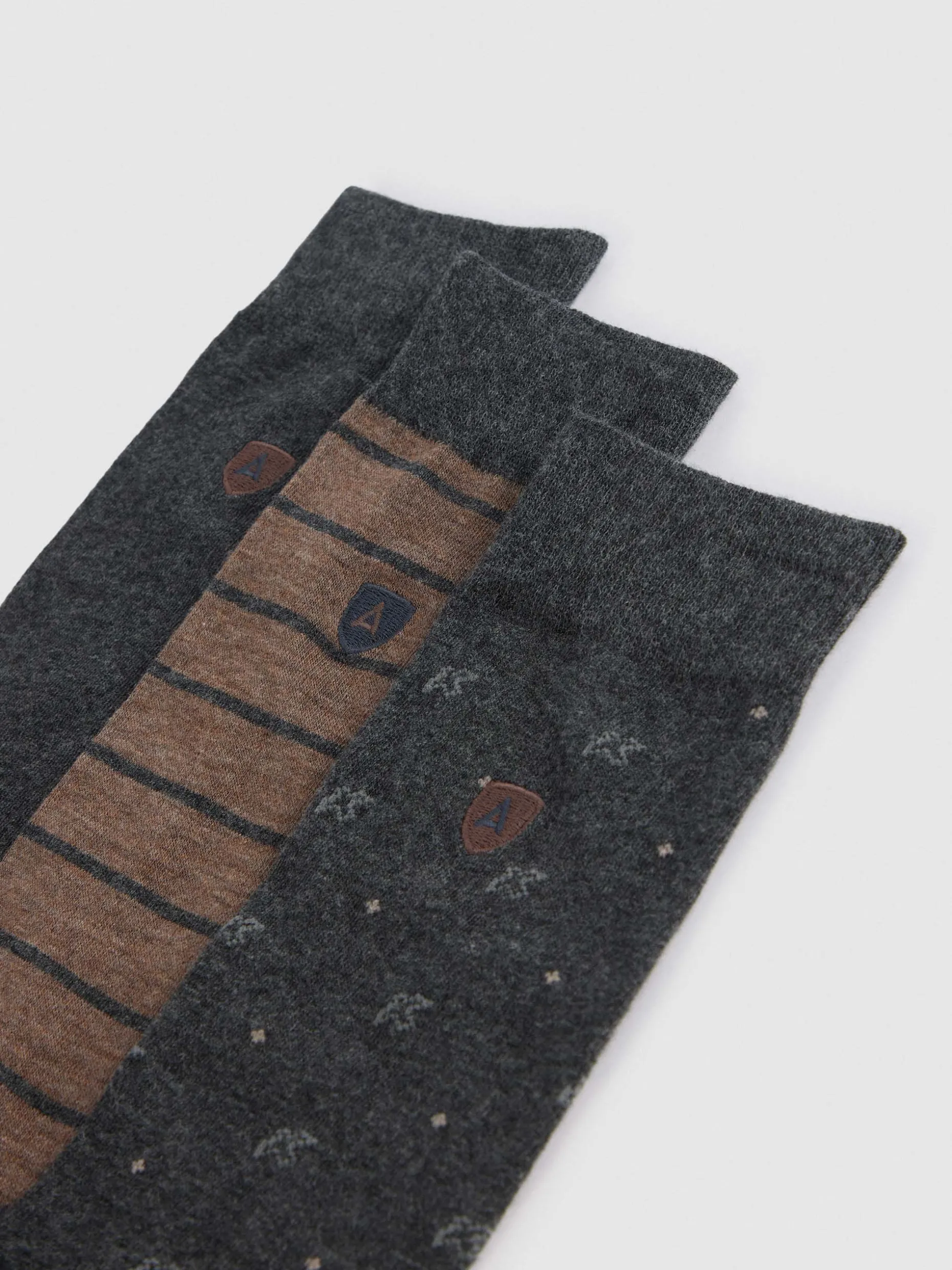 Pack de 3 calcetines de caña media confeccionados en algodón con diferentes diseños lisos, con líneas o detalles estampados. El complemento ideal para aportarnos personalidad en nuestros looks. ¡Elige tus favoritos!