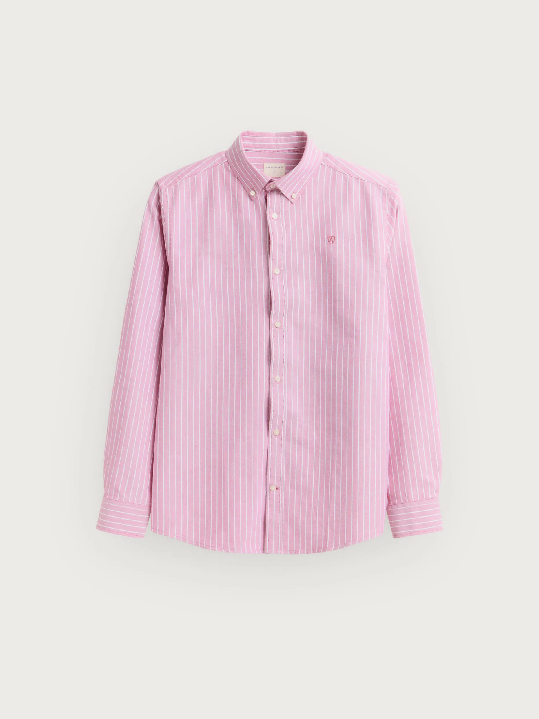 Camisa a rayas confeccionada en algodón con cuello clásico de botón, manga larga con puños simples y logo de la marca grabado en el frontal al tono. Corte regular fit.