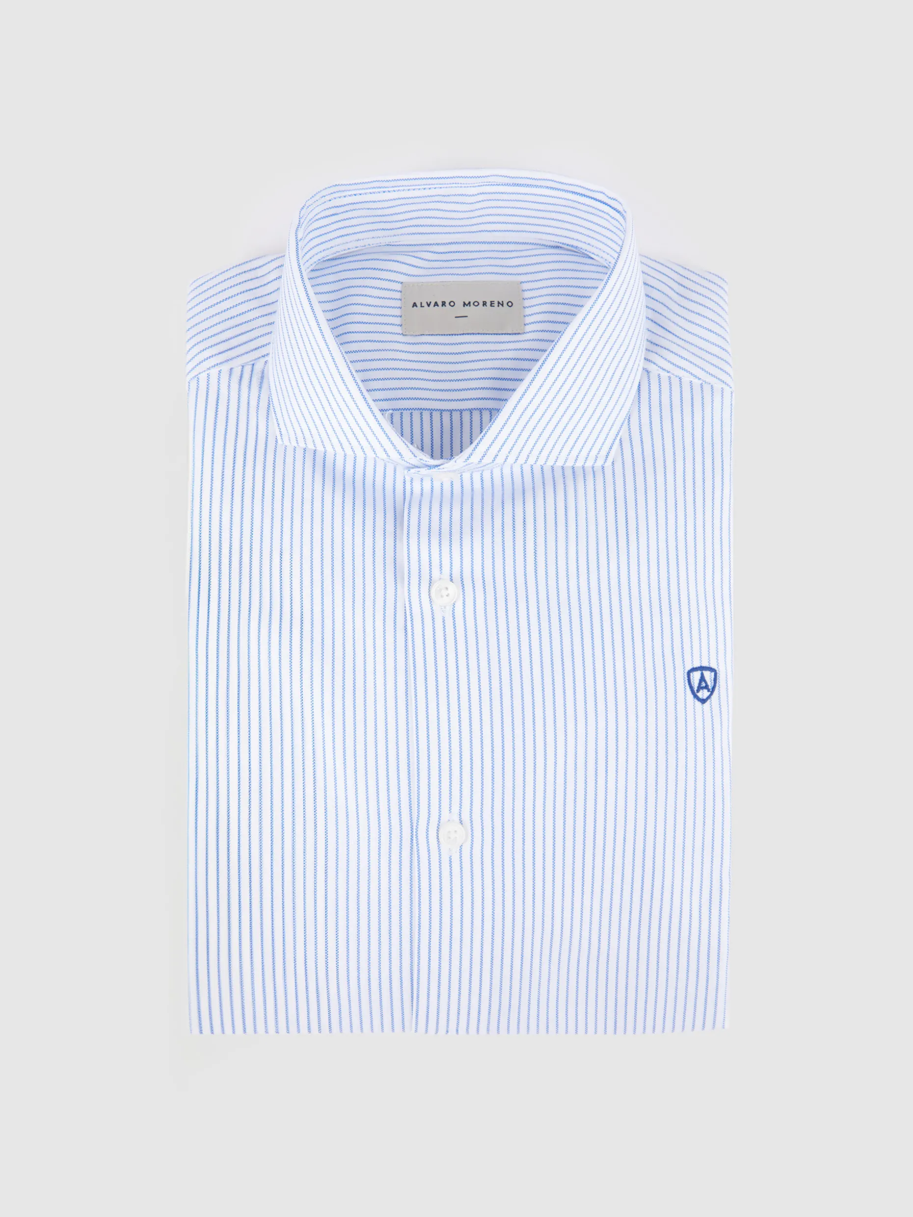 Camisa de vestir con tejido a rayas. Cuenta con cuello italiano, manga larga con puños simples y logo de la marca grabado en el frontal. Corte slim fit.