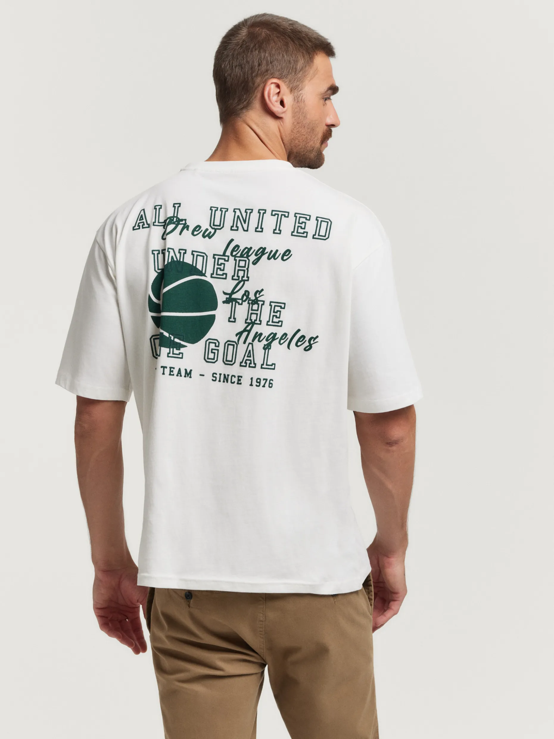 Camiseta de corte relaxed fit aportando un corte más relajado. Cuenta con estampado personalizado en el frontal y en la parte trasera, cuello redondo y manga corta ligeramente más anchas y largas.