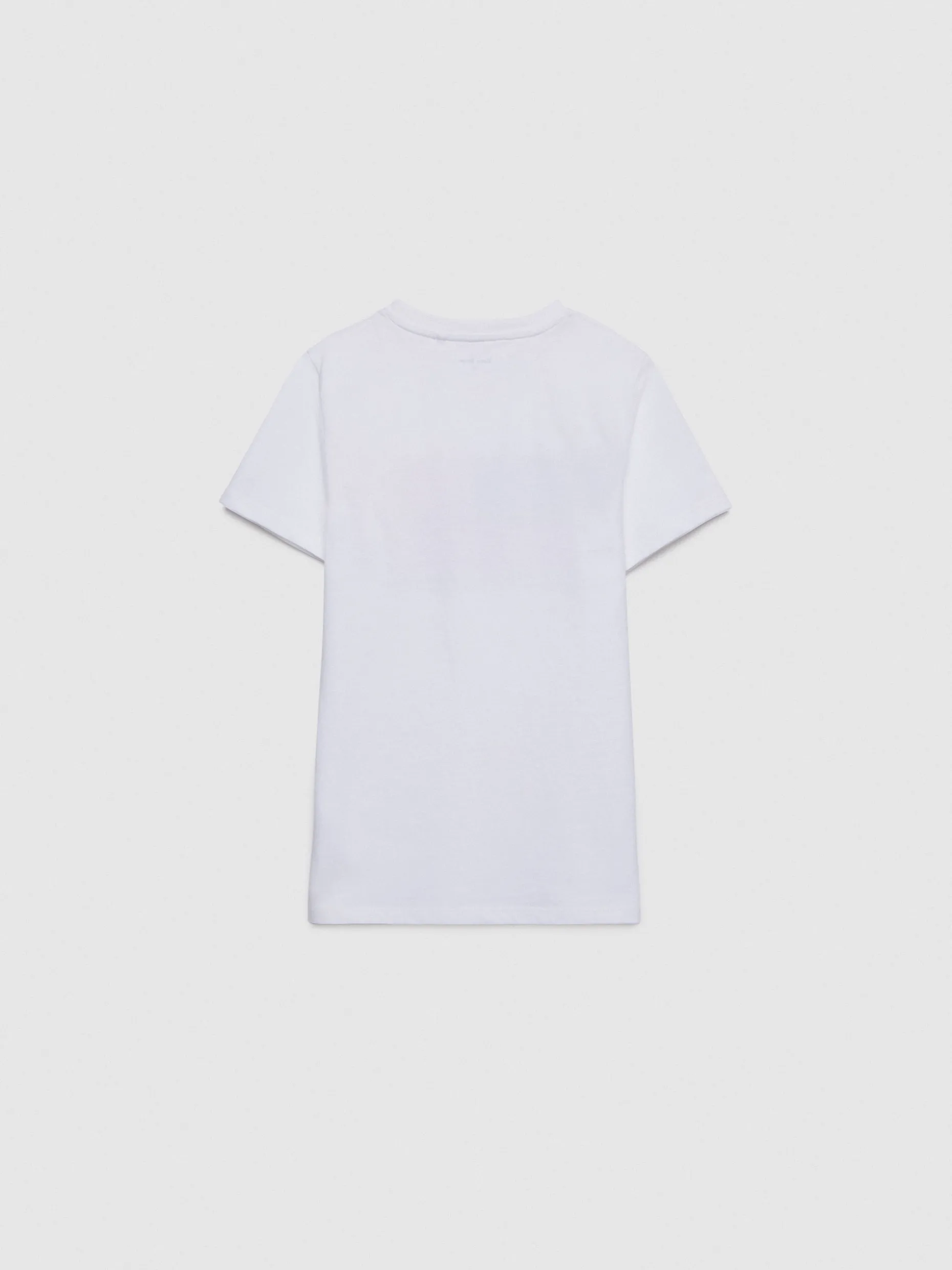 Camiseta con estampado personalizado grabado en el frontal. Cuenta con cuello redondo, manga corta y etiqueta personalizada en el lateral. Corte regular fit.