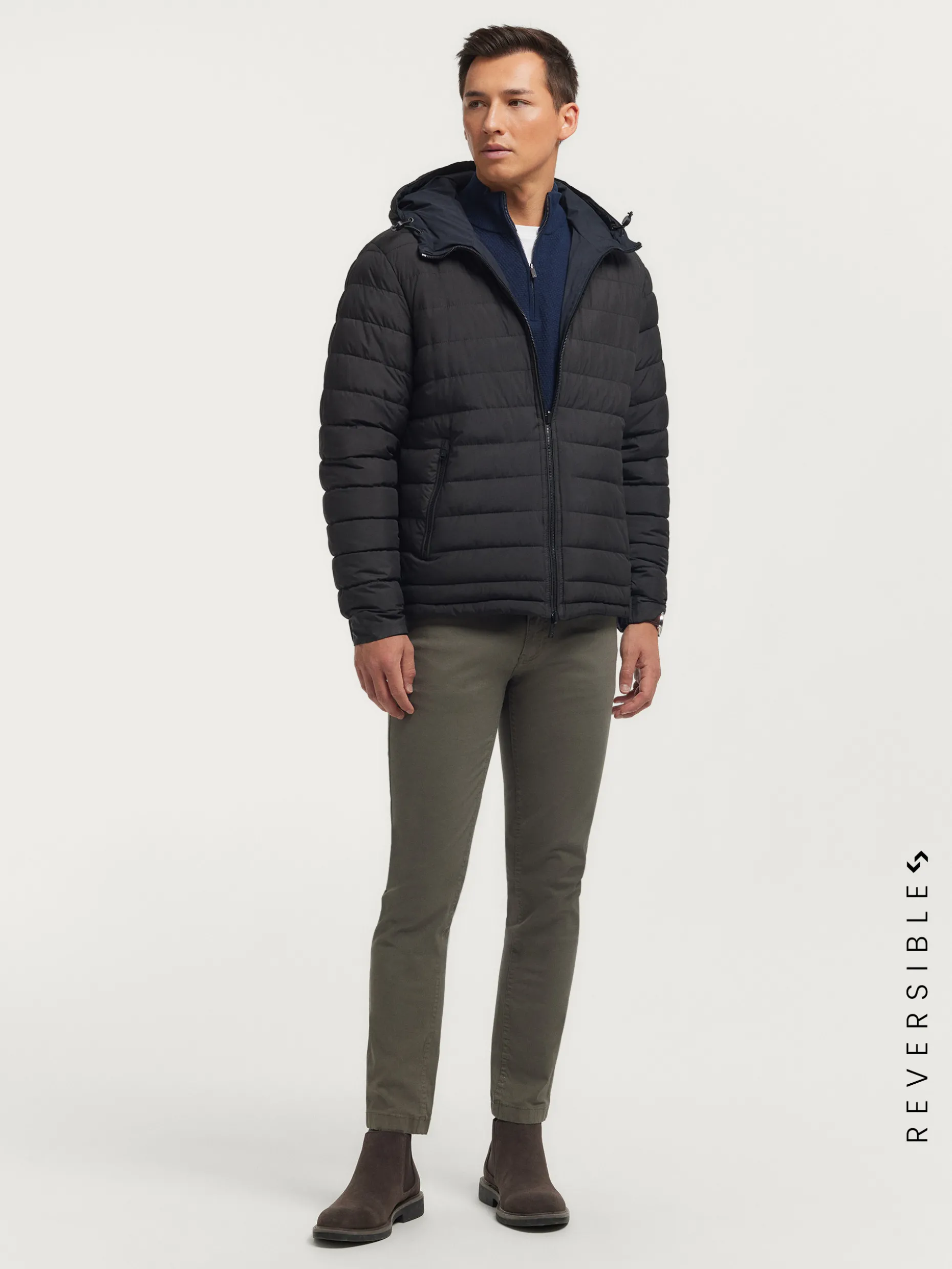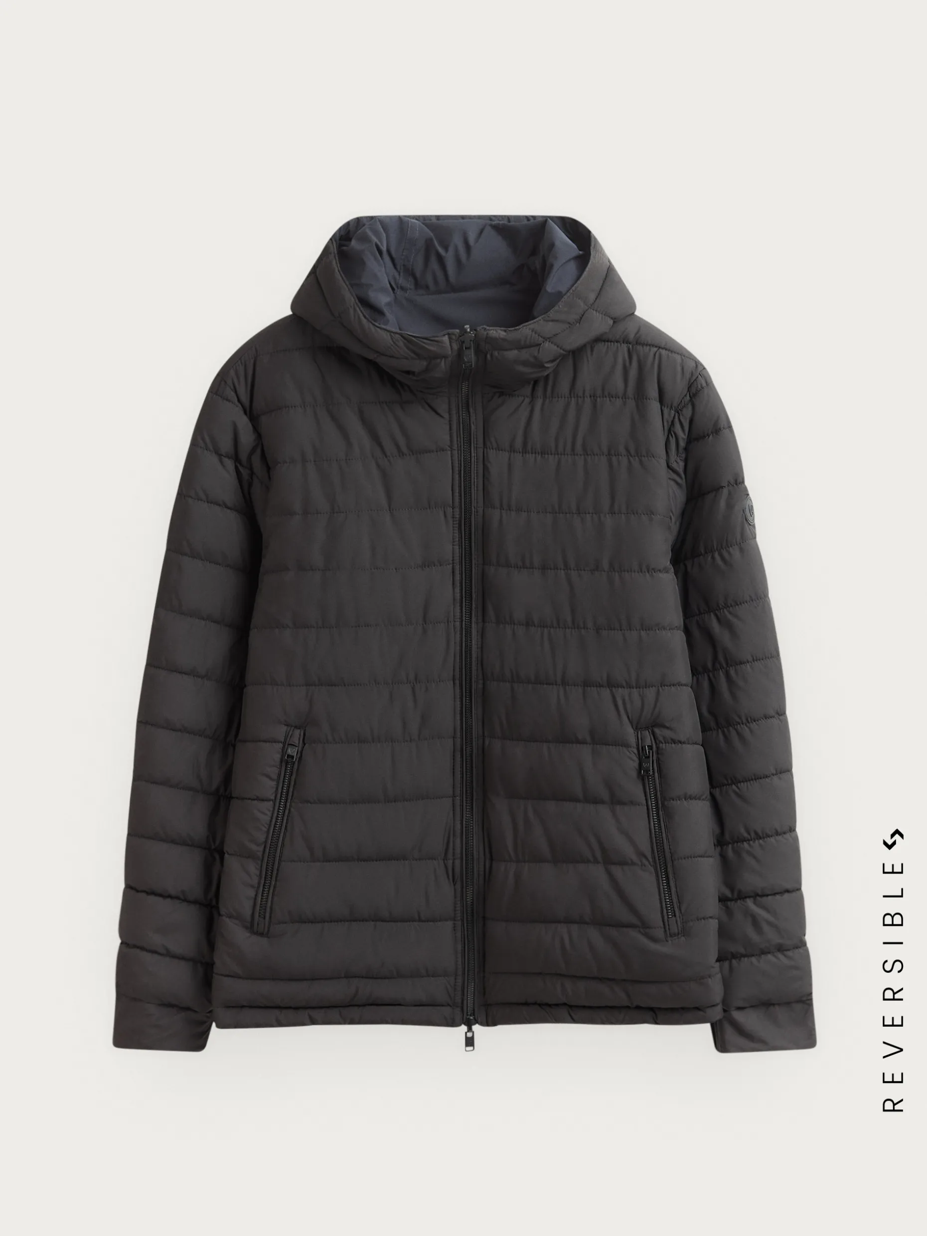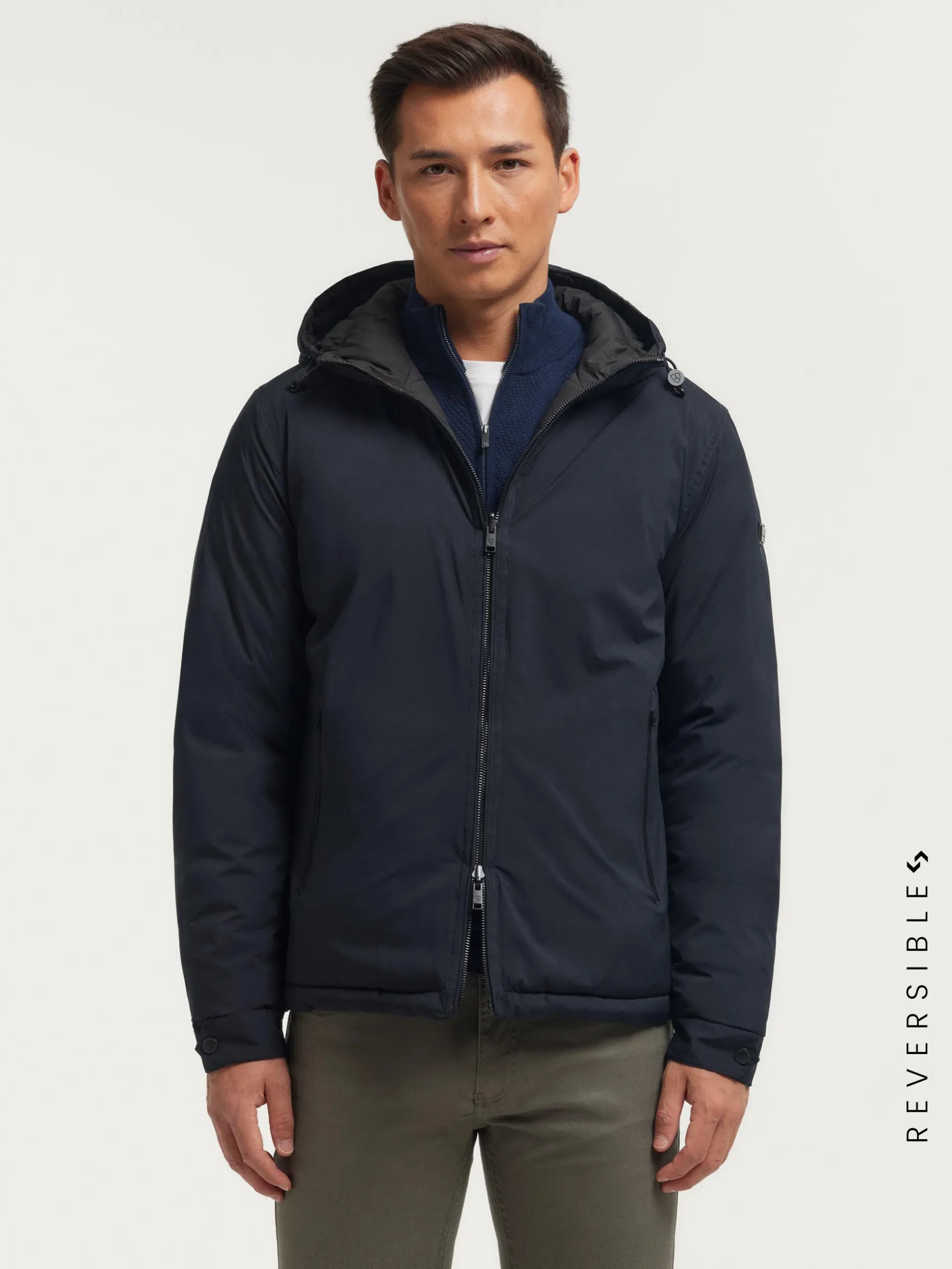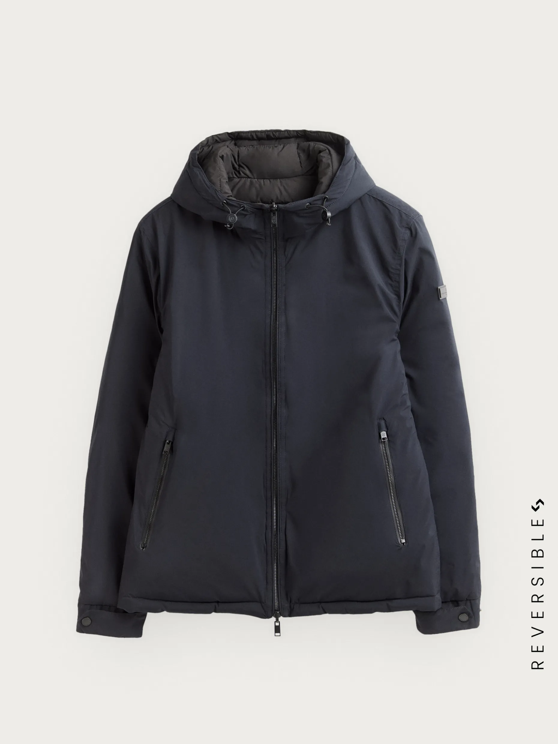 Cazadora reversible acolchada con gorro ajustable. Cierre central mediante cremallera, dos bolsillos en el frontal de ambos lados y manga larga con puños ajustables. Detalle personalizado en una de las mangas.