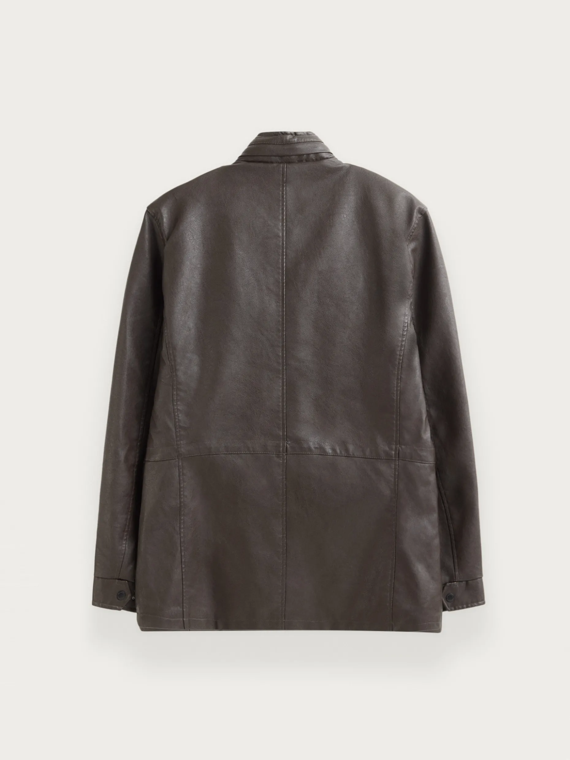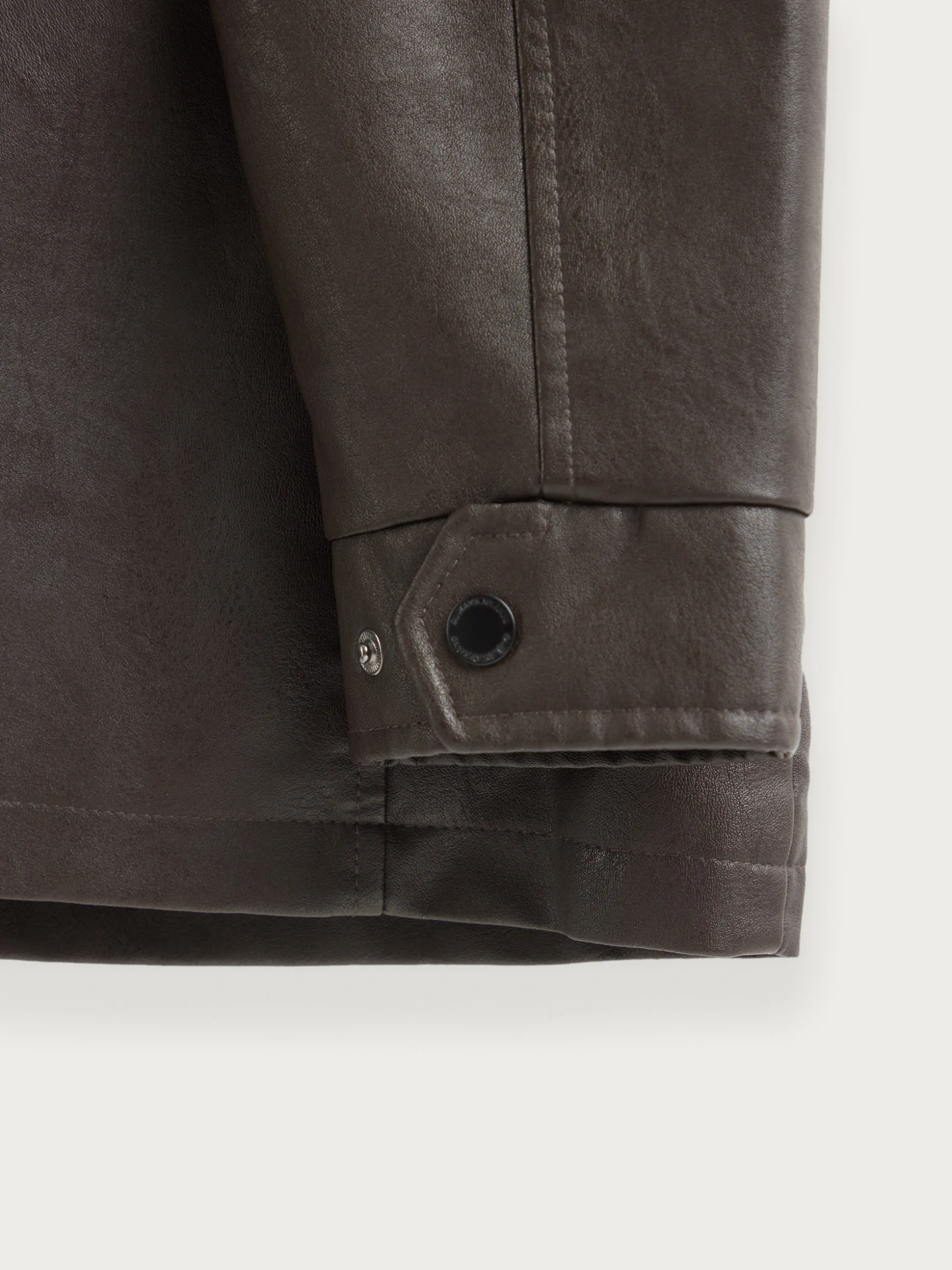 Cazadora confeccionada en símil piel con cuello subido y cuatro bolsillos de solapa en el frontal. Cierre central mediante cremallera oculta por tapeta de botones a presión, manga larga con puños ajustables y detalle personalizado en una de las mangas. Bolsillo en el interior.