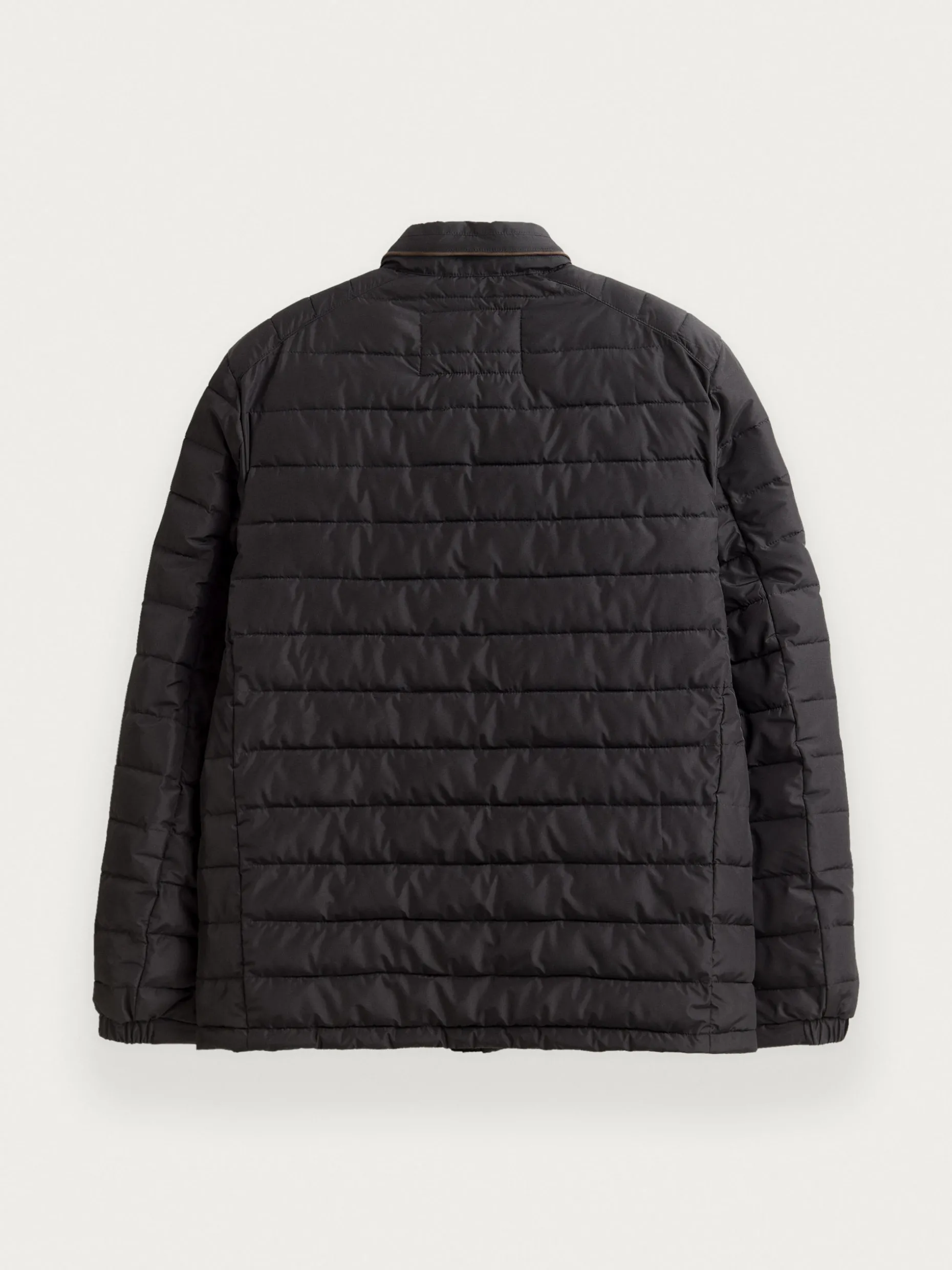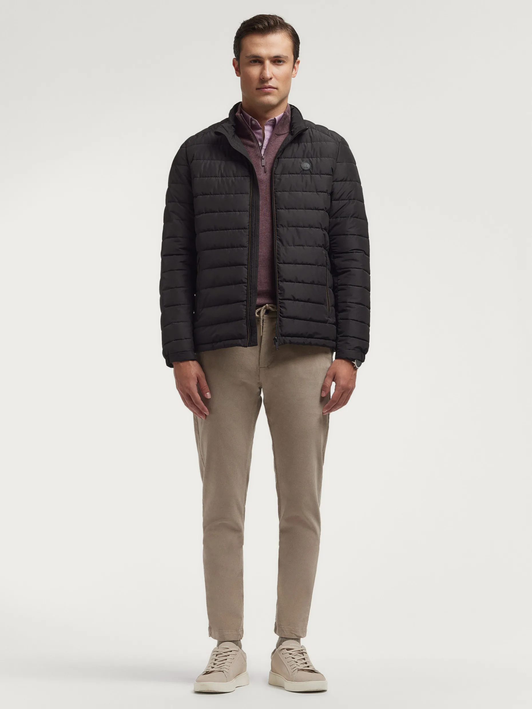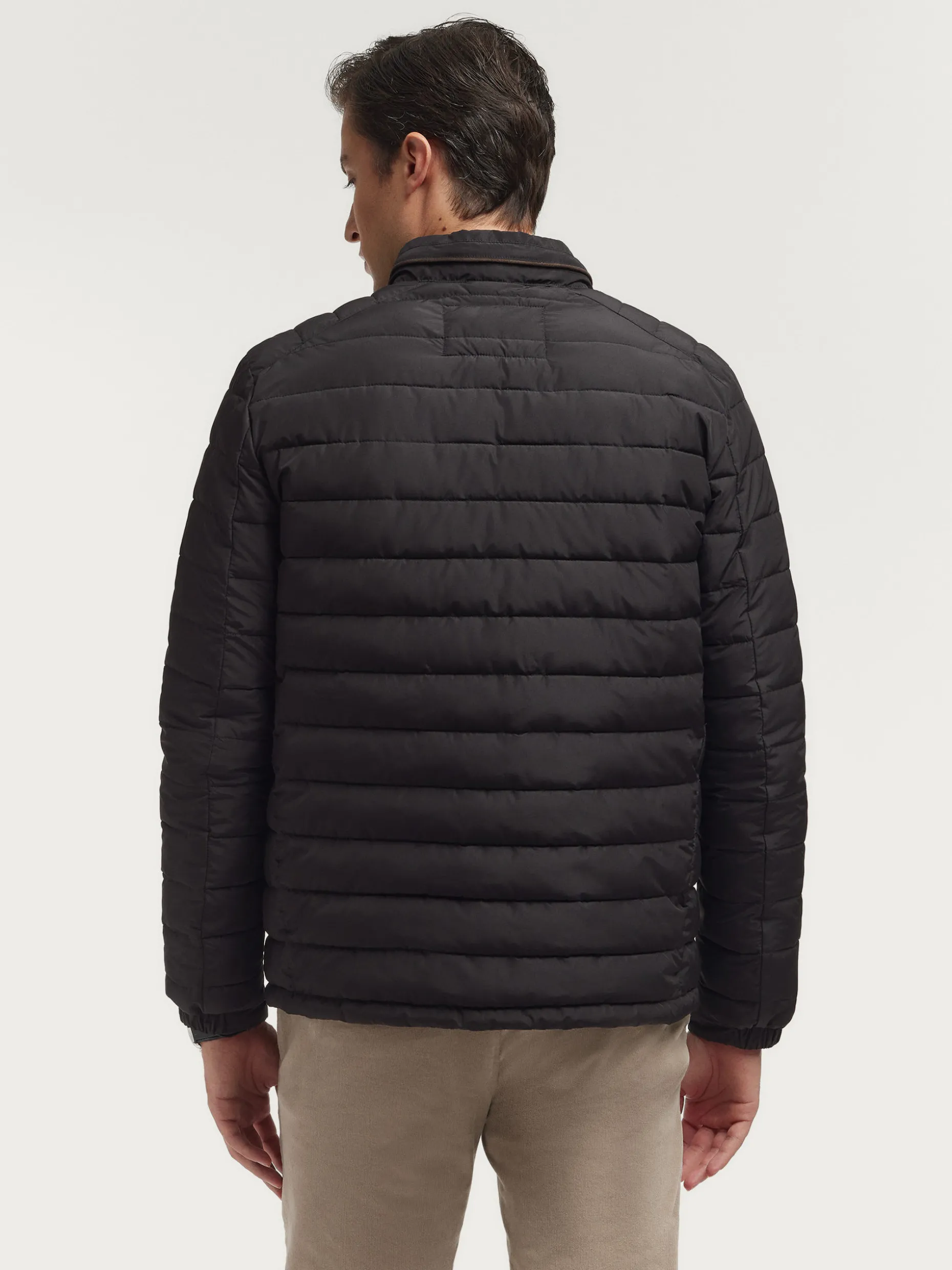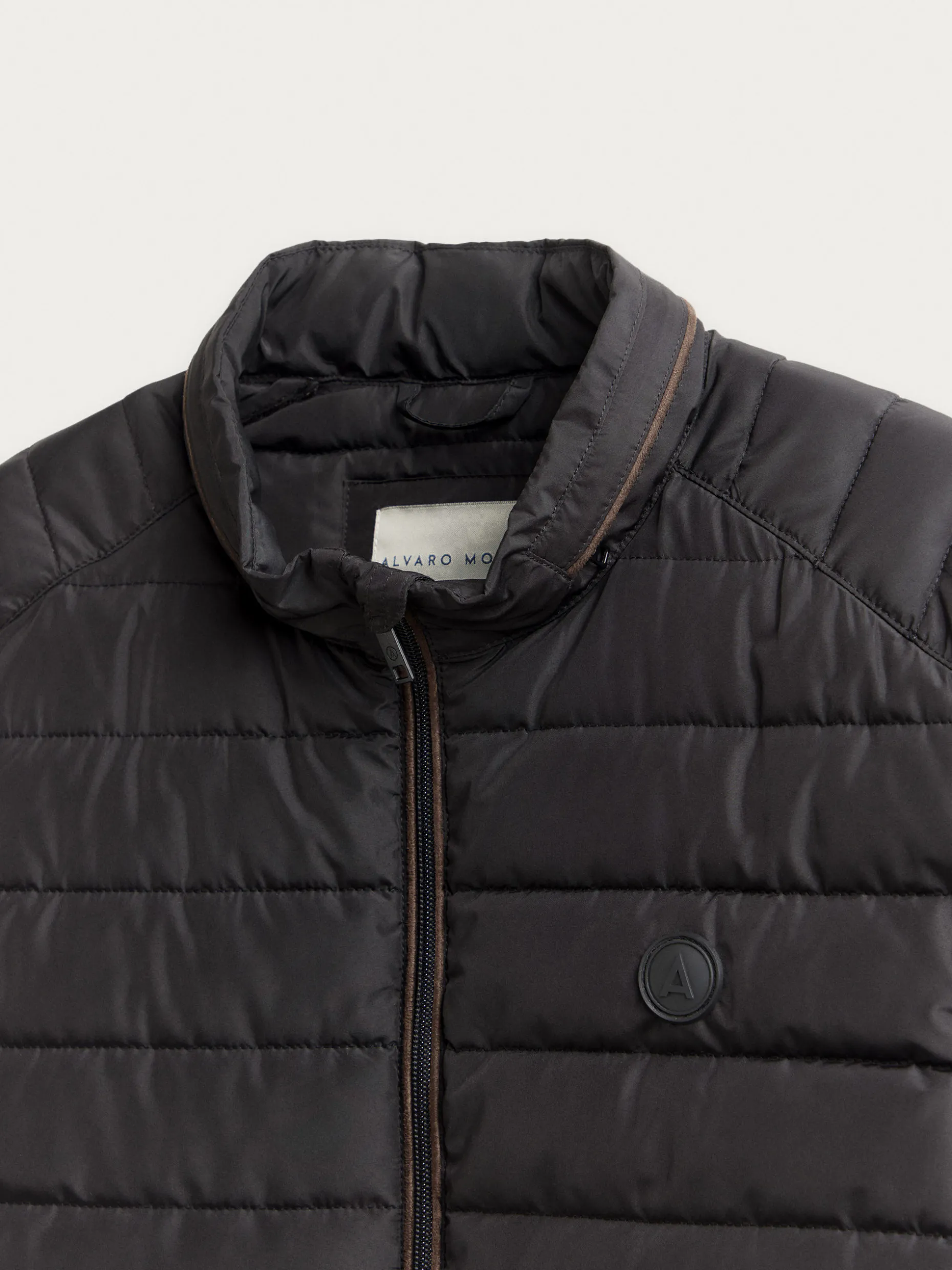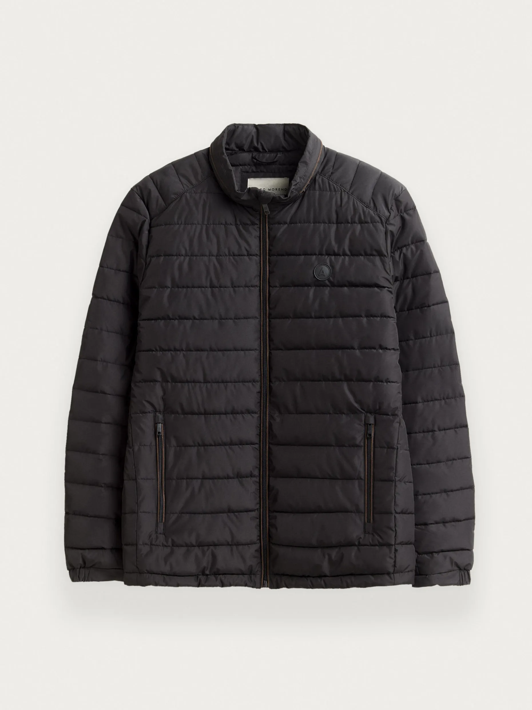 Cazadora acolchada con cuello subido y cremallera alrededor como detalle. Cierre central de cremallera, dos bolsillos en la cintura y logo grabado en el frontal. Interior forrado y viveado con bolsillo.