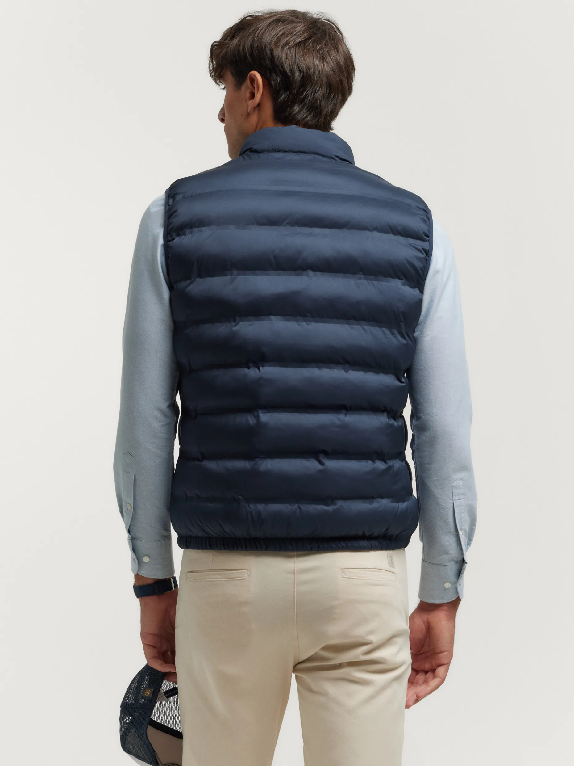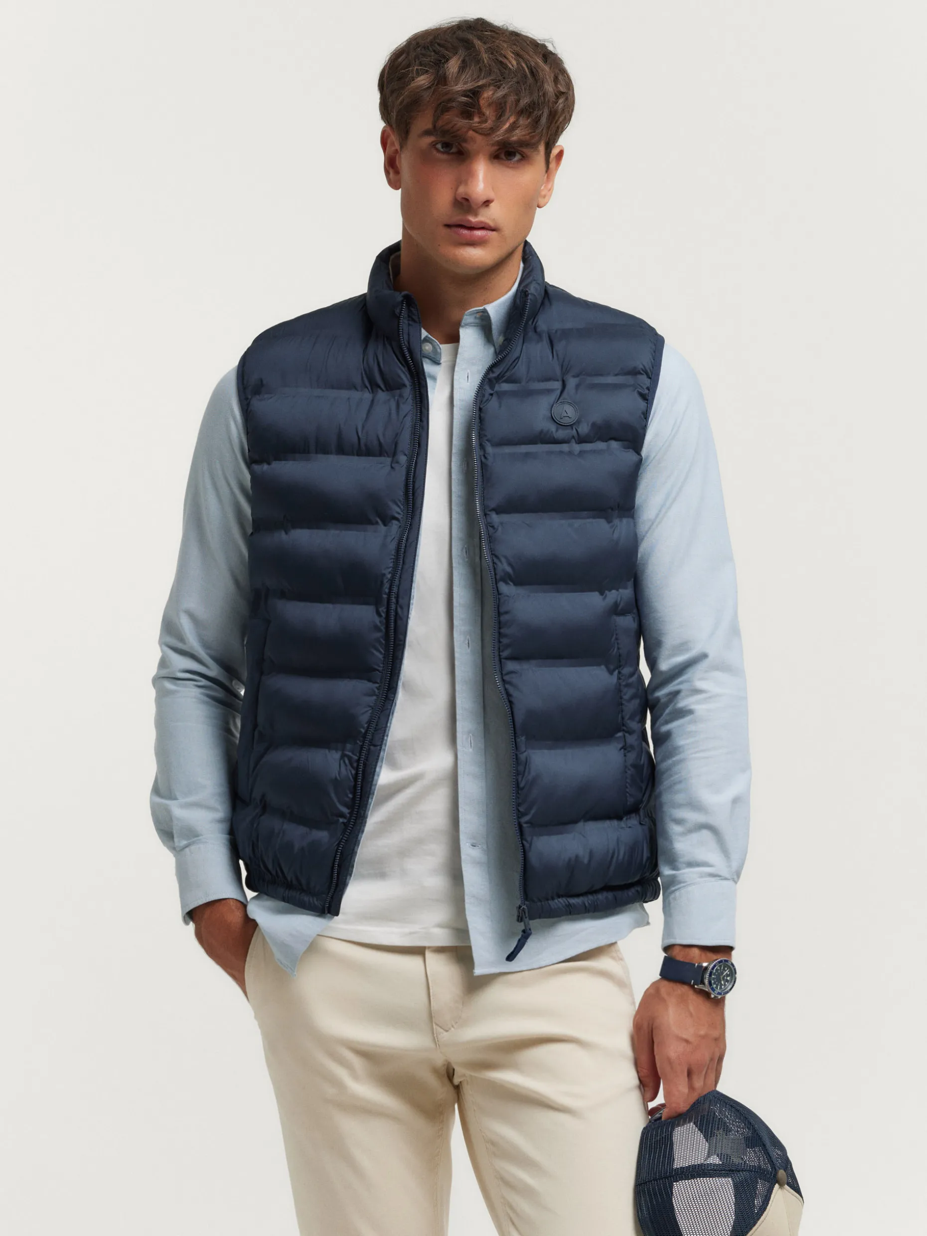 Chaleco acolchado con cuello subido y cierre central mediante cremallera, dos bolsillos a la altura de la cintura y logo de la marca grabado en el pecho al tono. Elástico en la sisa y cintura. Forro interior a contraste con bolsillos.