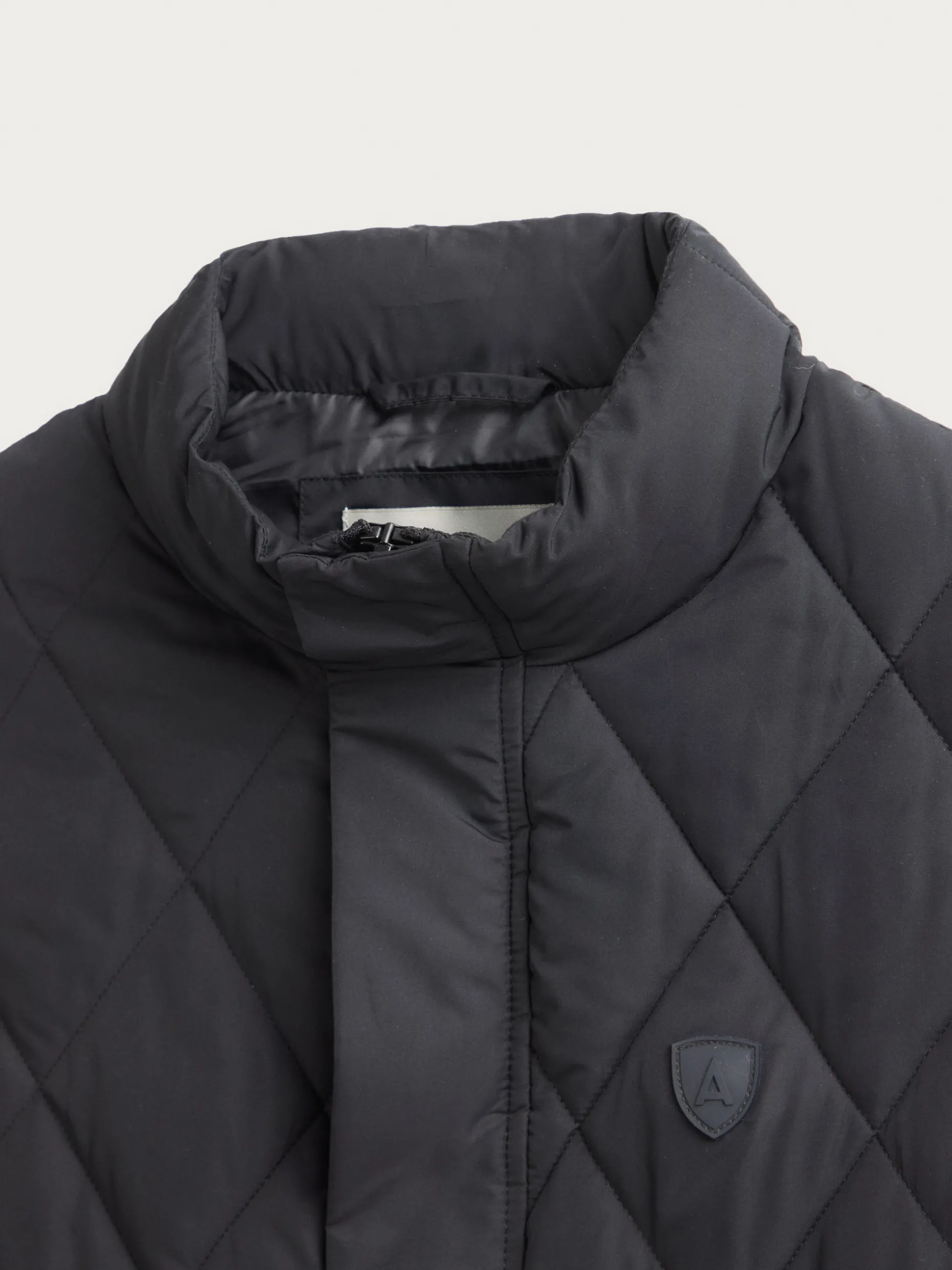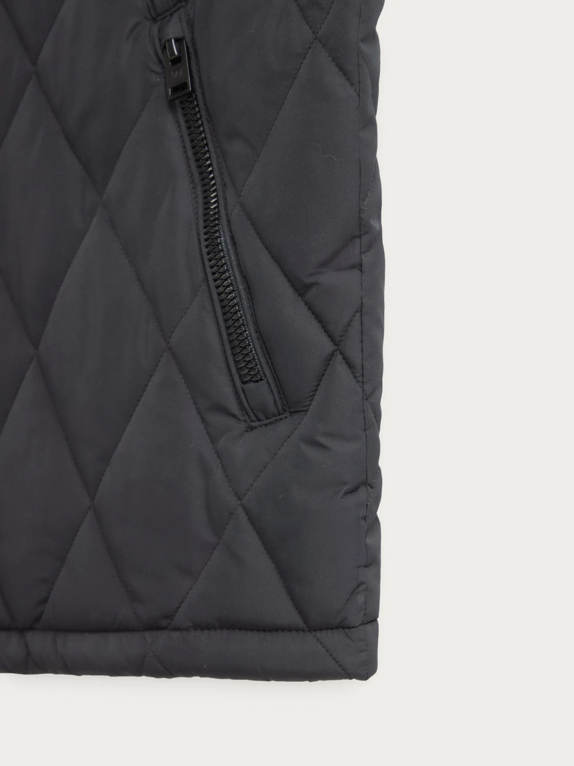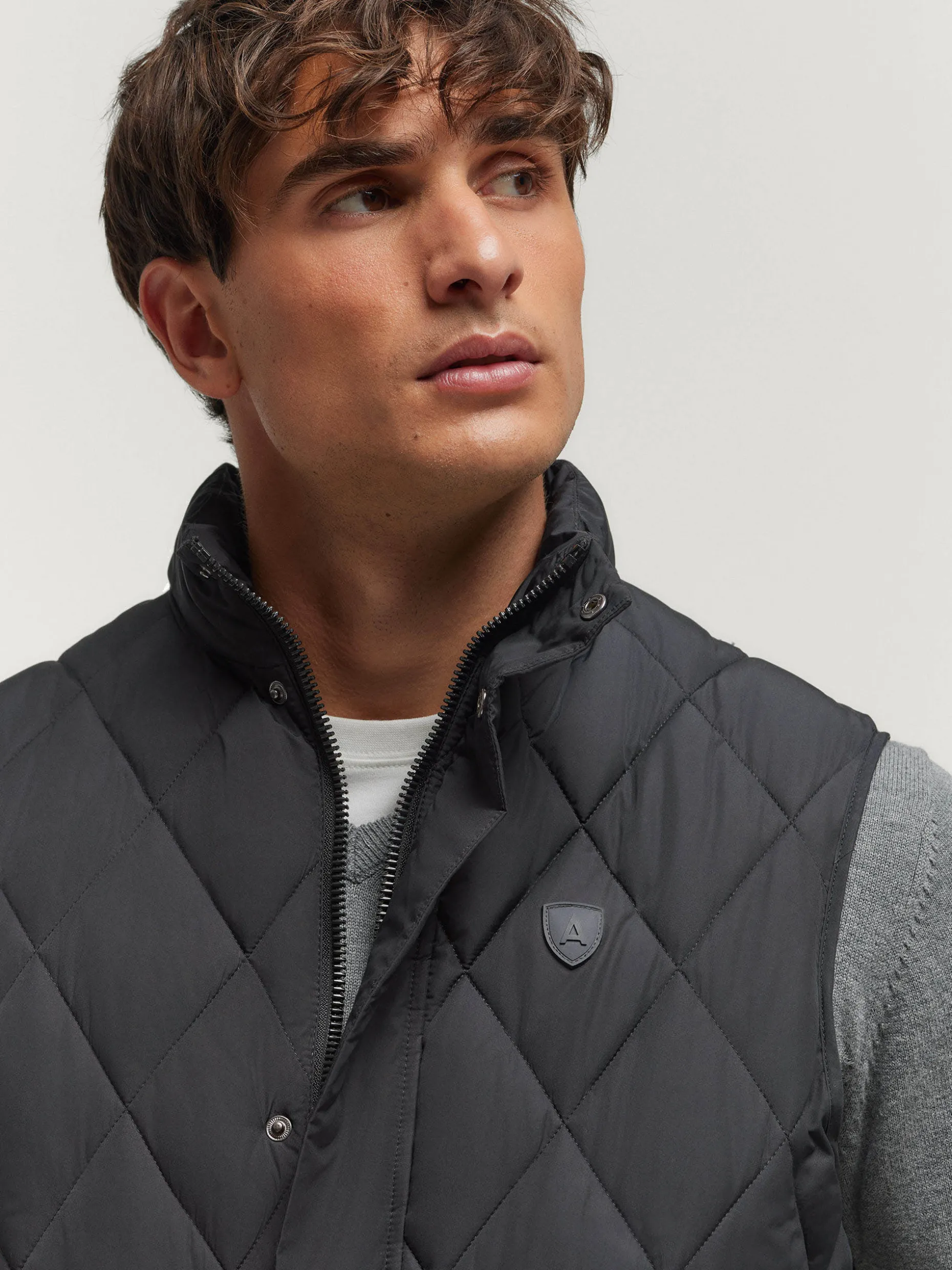 Chaleco con cuello alto y tejido en forma de rombos. Cuenta con cierre central mediante doble cremallera oculta por tapeta de botones a presión, logo de la marca grabado al tono en el frontal y dos bolsillos a la altura de la cintura. Corte regular fit.