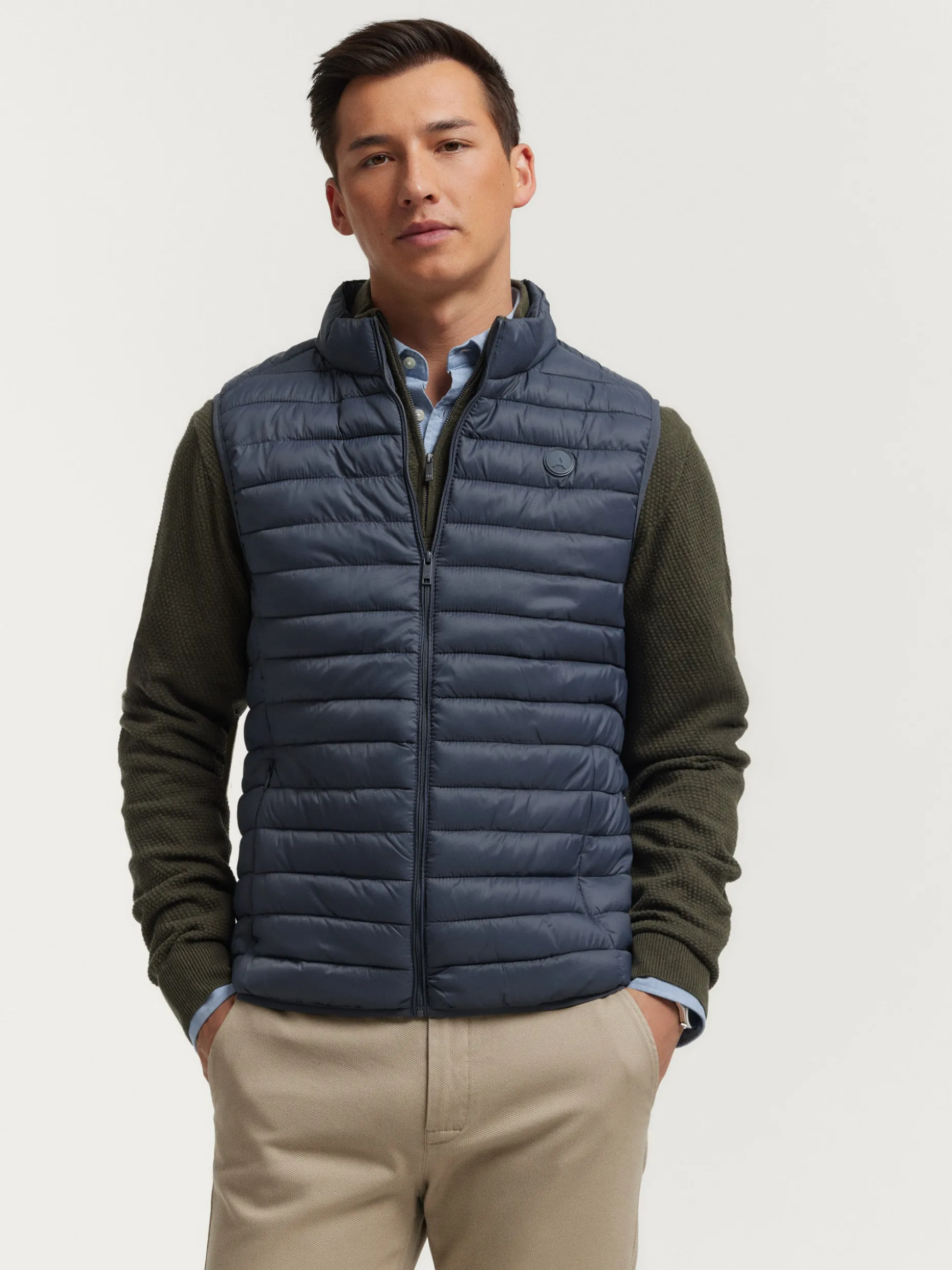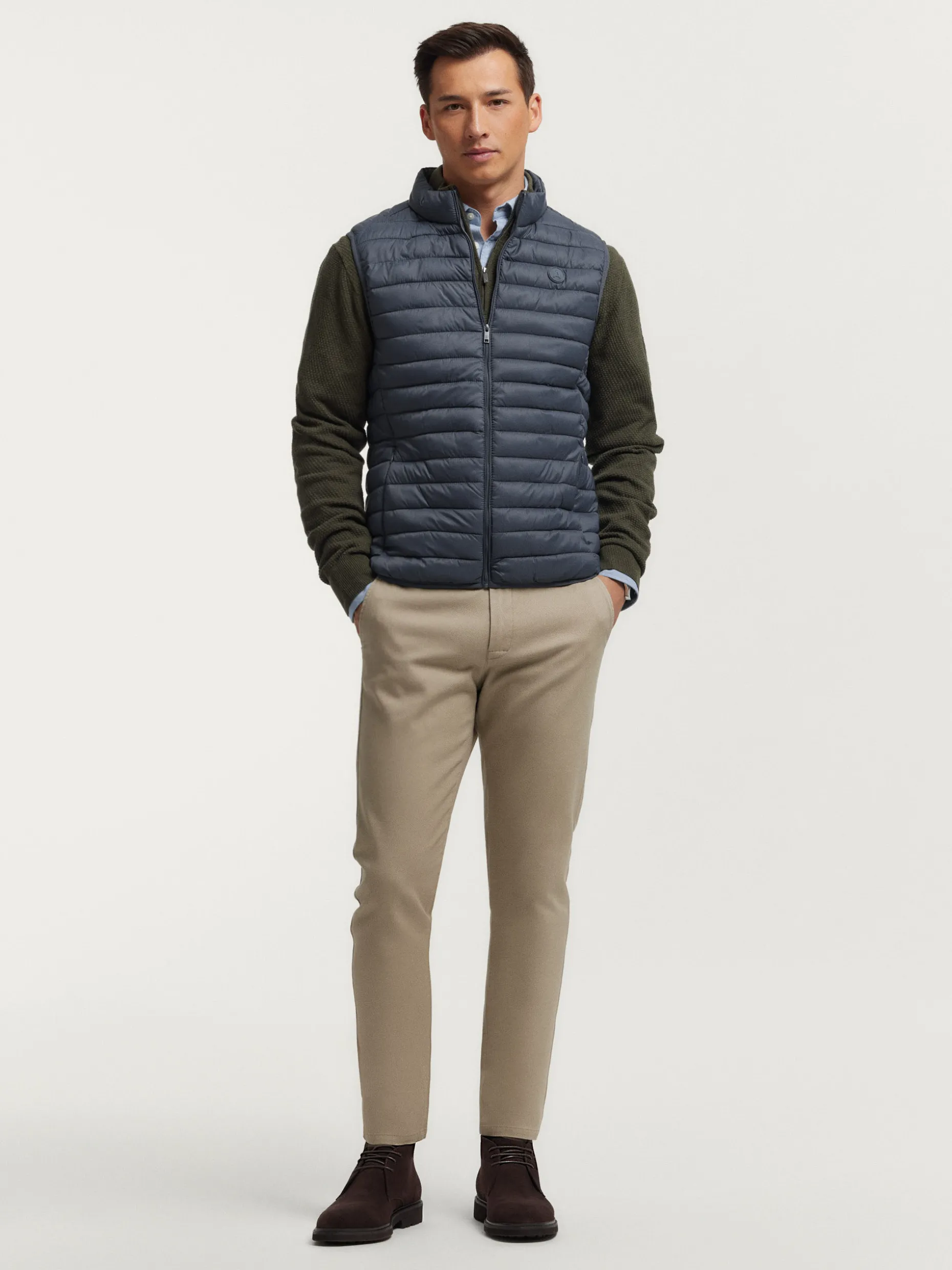 Chaleco acolchado con cuello subido y cierre central mediante cremallera, dos bolsillos a la altura de la cintura y logo de la marca grabado en el pecho. Elástico en la sisa y cintura. Forro interior a contraste con bolsillos.