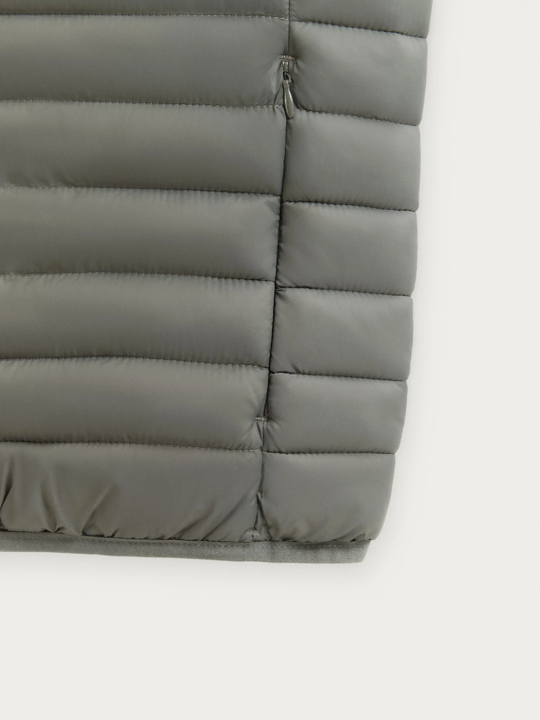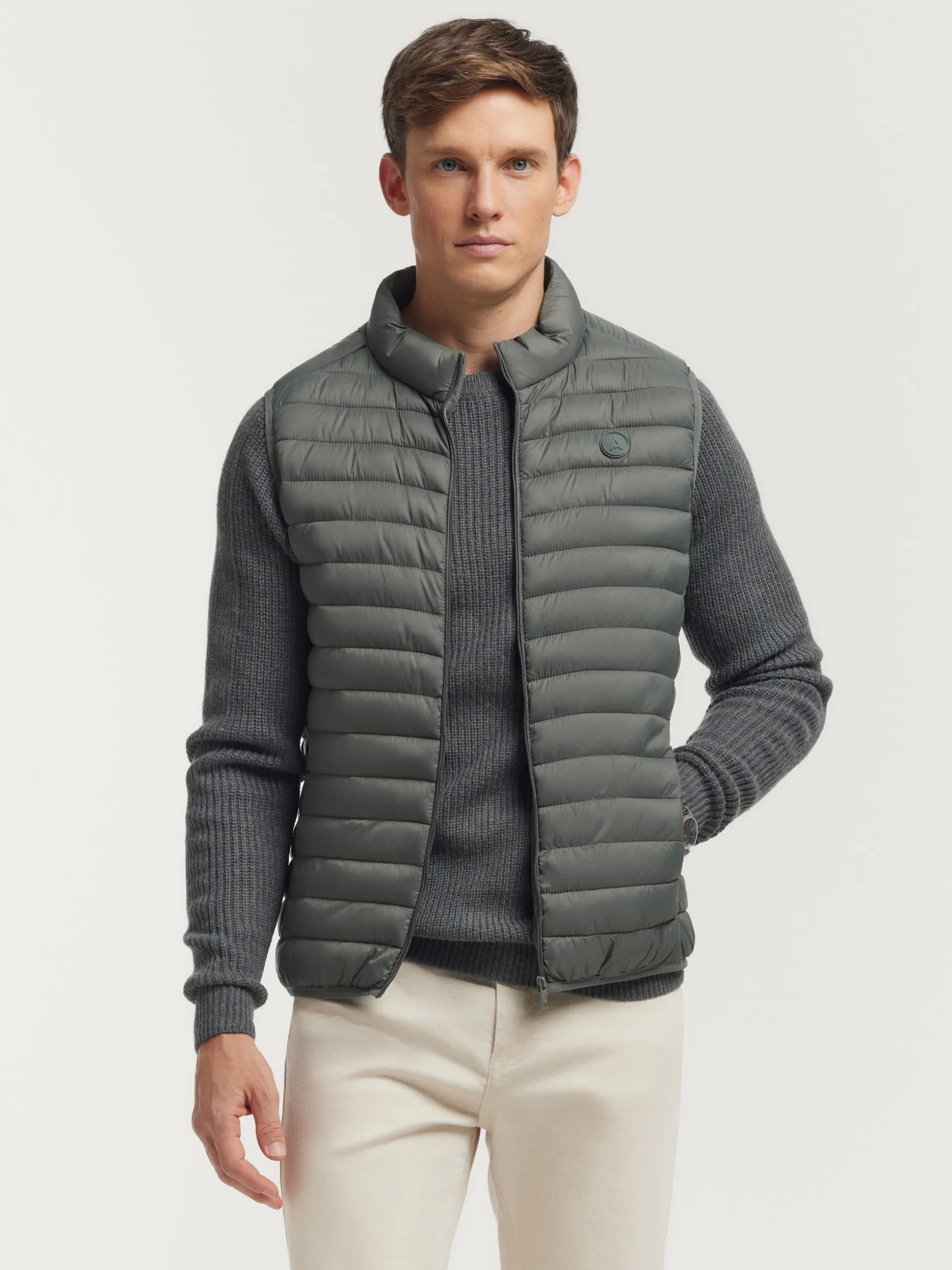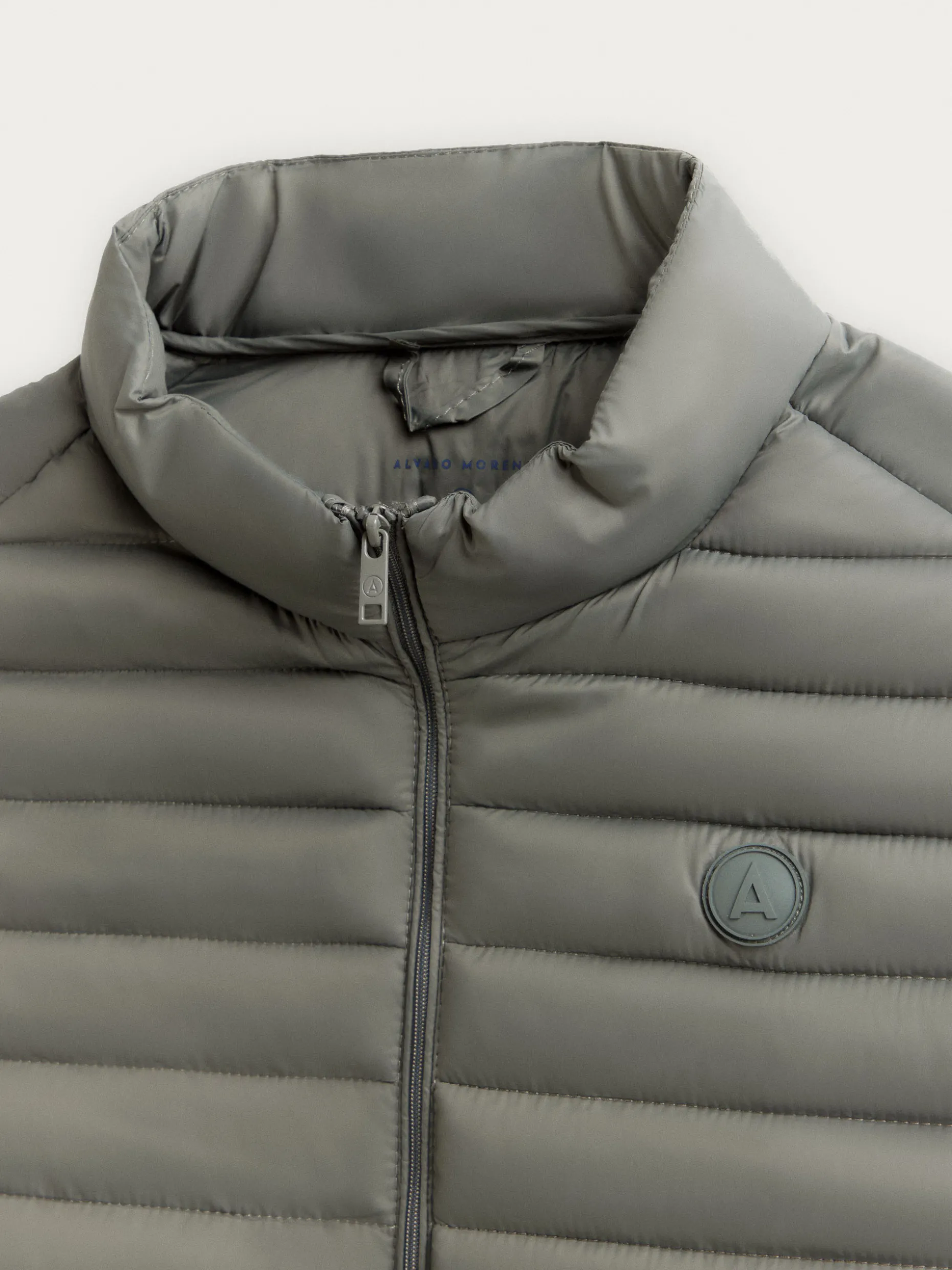 Chaleco acolchado con cuello subido y cierre central mediante cremallera, dos bolsillos a la altura de la cintura y logo de la marca grabado en el pecho. Elástico en la sisa y cintura. Forro interior a contraste con bolsillos.