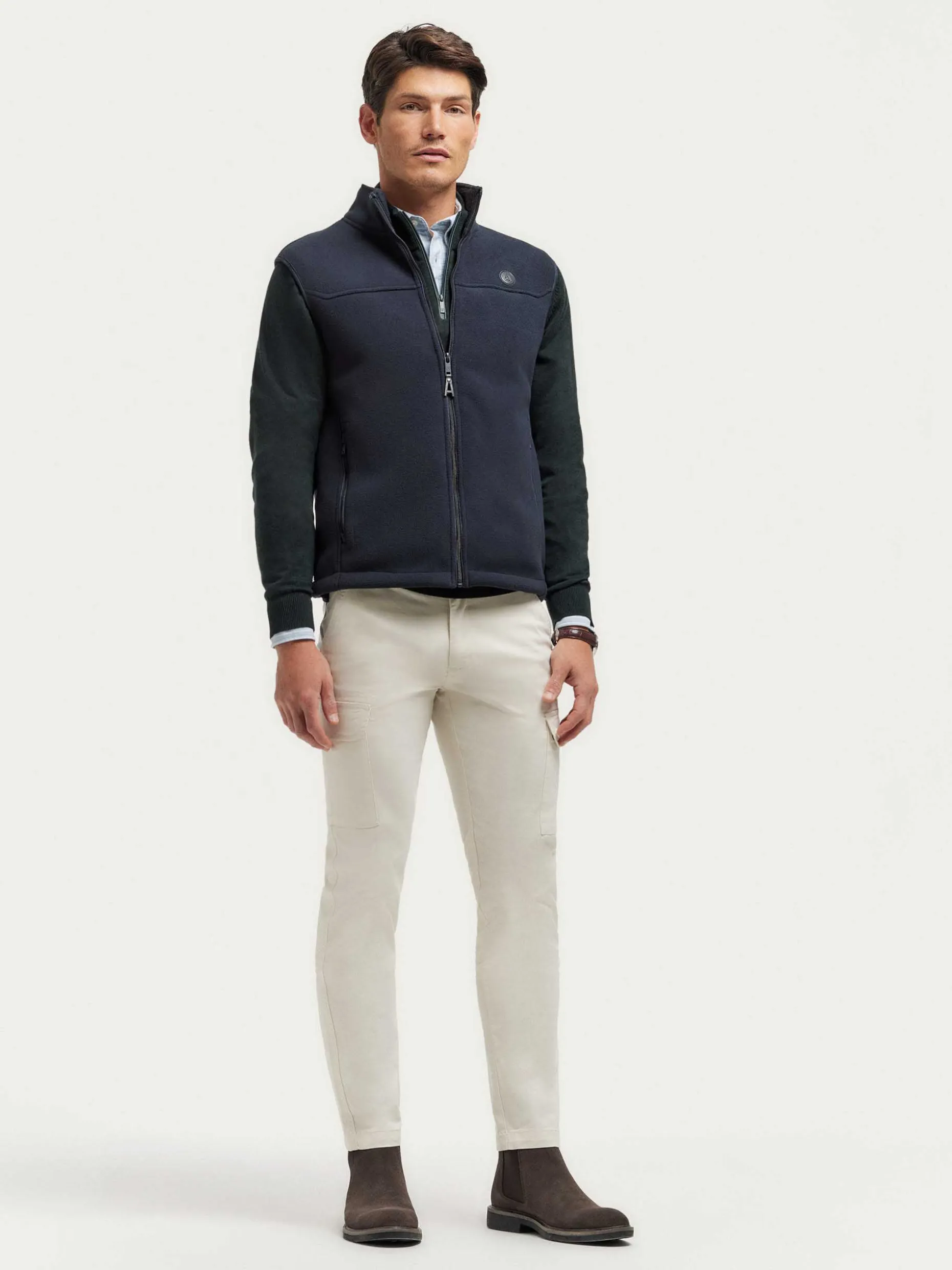 Chaleco confeccionado en tejido avivado en antelina en su exterior y forrado en su interior en borreguillo. Cuenta con cierre central mediante cremallera personalizada, dos bolsillos en su exterior y logo grabado en su frontal. Corte regular fit.
