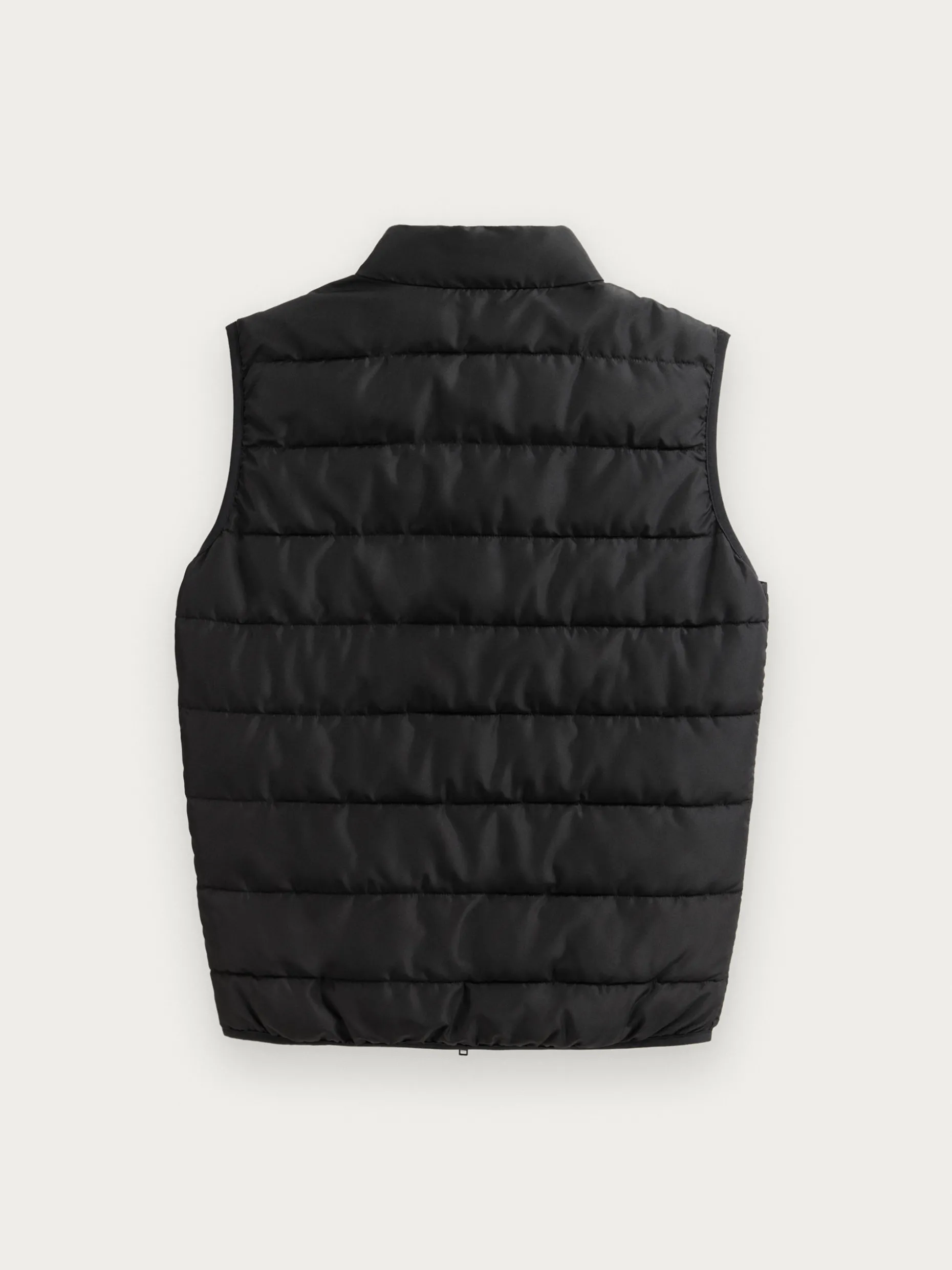 Chaleco acolchado con cuello subido y cierre central mediante doble cremallera, dos bolsillos a la altura de la cintura con cierre de cremallera y logo de la marca grabado en el frontal al tono. Elástico en la sisa y cintura. Cremalleras termoselladas. Interior con dos bolsillos y doble compartimento cada uno.