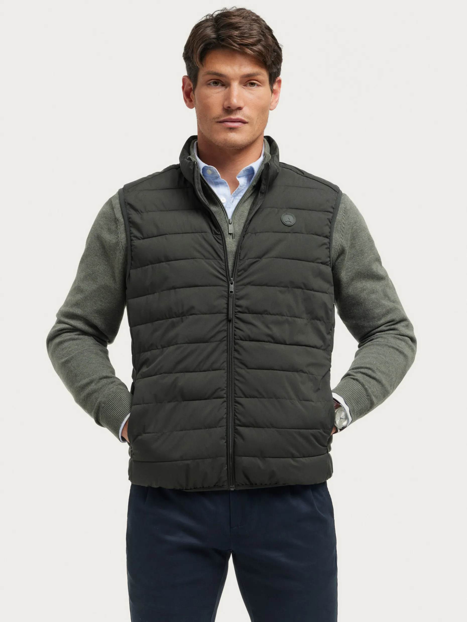 Chaleco con cierre central mediante cremallera y dos bolsillos en la cintura. Cuenta con cuello subido, logo grabado en el frontal y sisa y cintura en punto elástico. Corte regular fit.