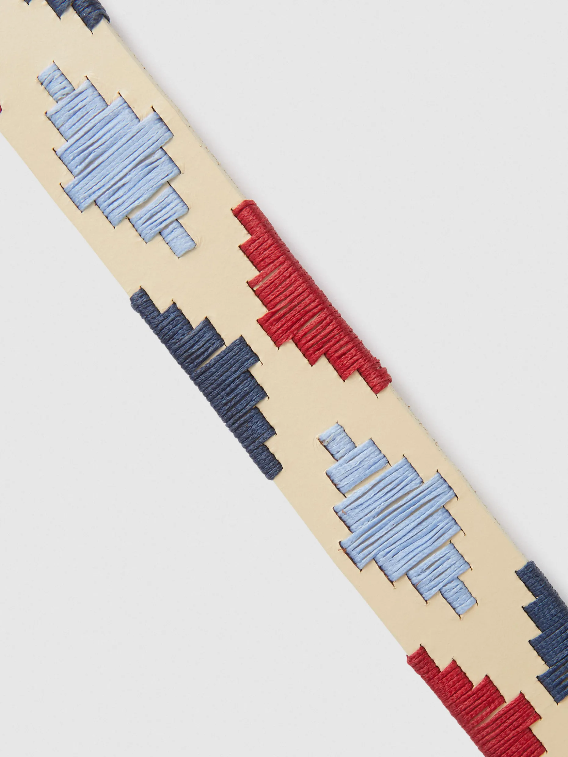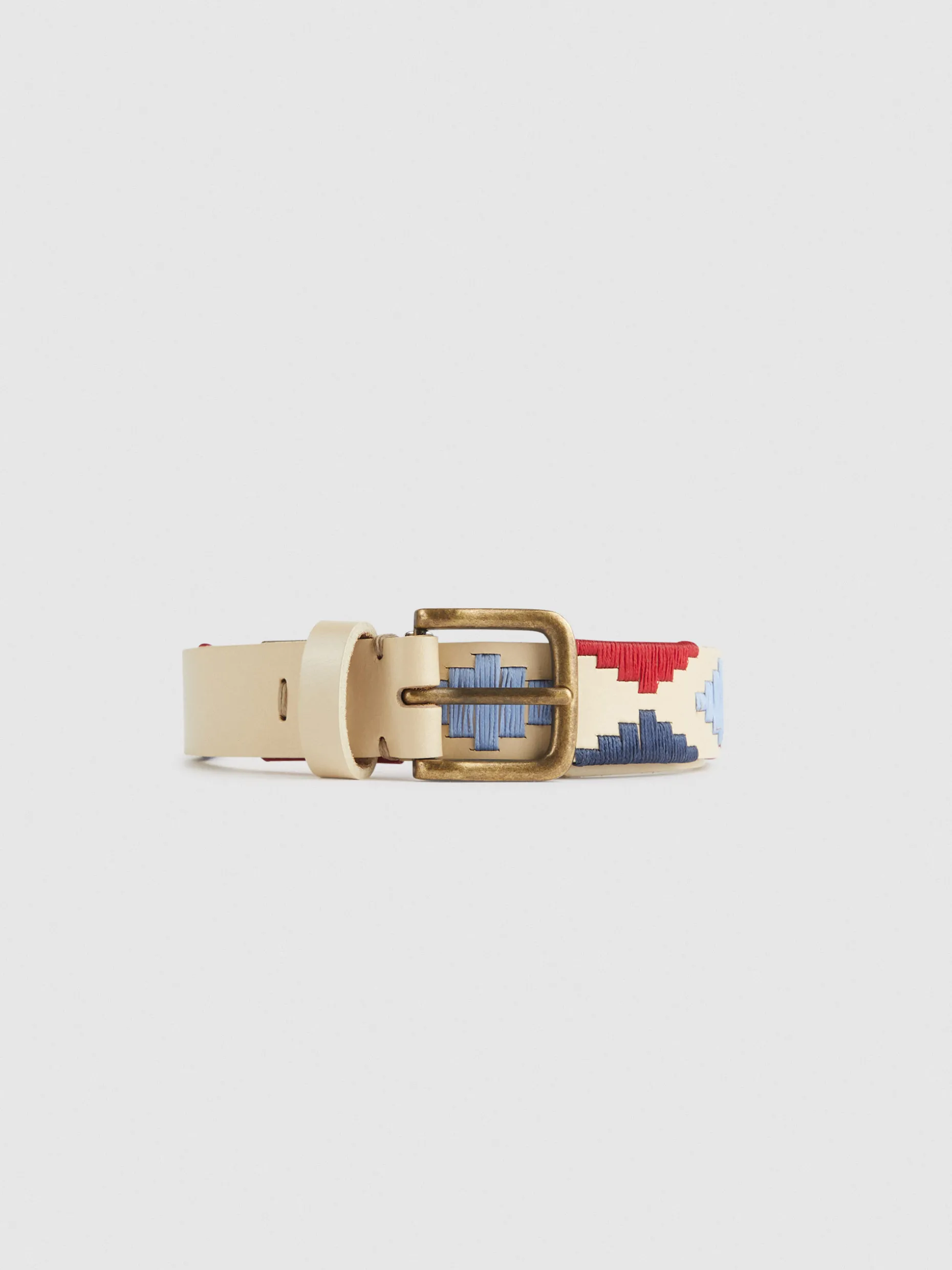 Cinturón con detalles personalizados estilo étnicos y cierre central mediante hebilla metálica y pasador al tono.