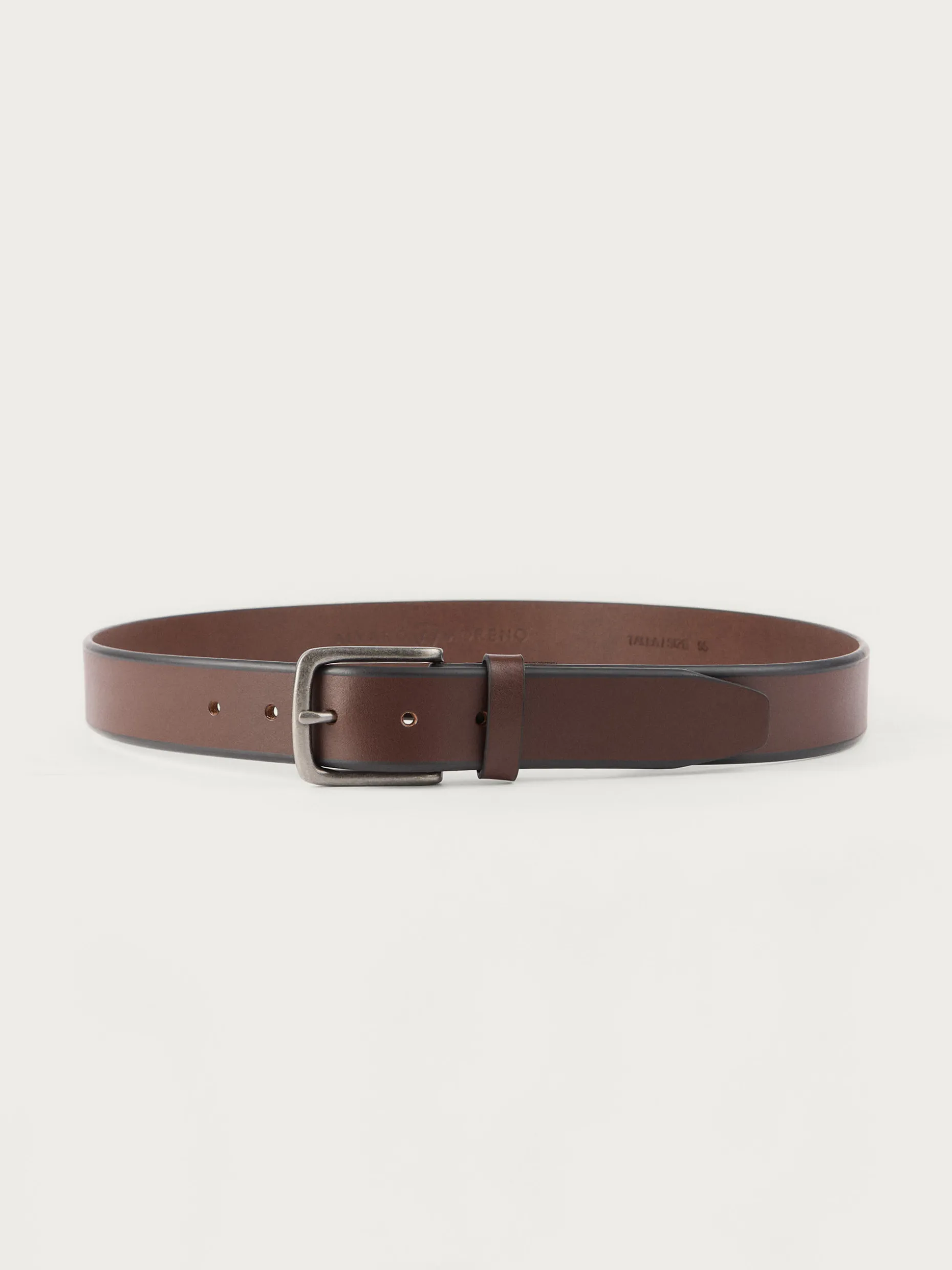 Cinturón confeccionado en piel con cierre central mediante hebilla metálica en color plata y pasador al tono del cinturón. Detalles de pespuntes a contraste.