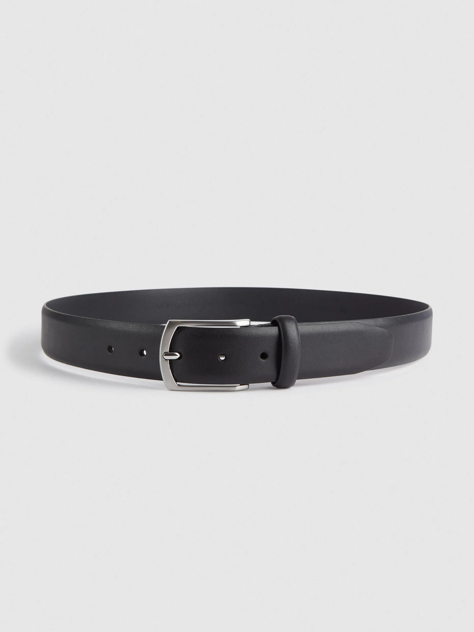 Cinturón de vestir confeccionado en piel con cierre central mediante hebilla metálica y pasador al tono.
