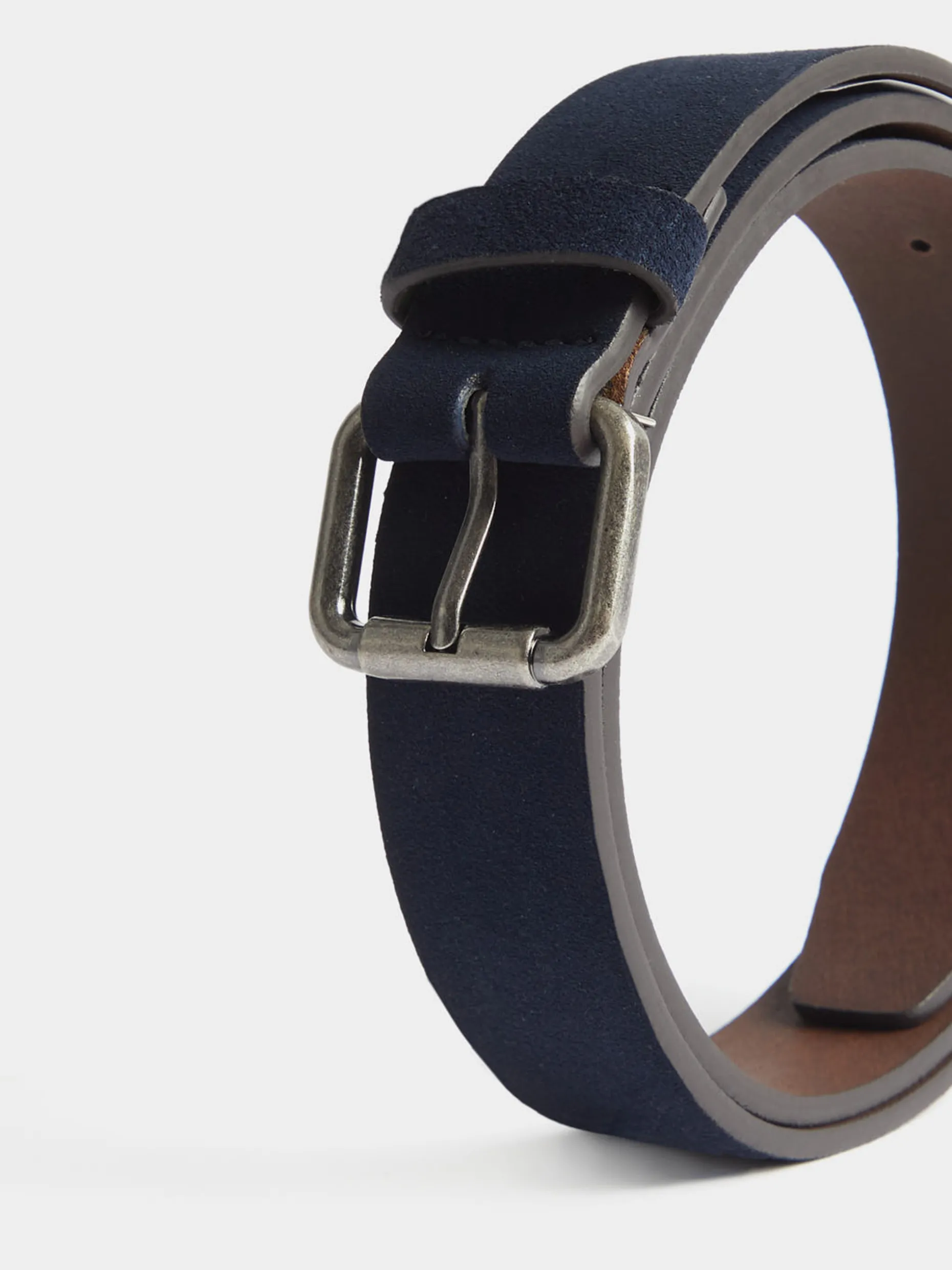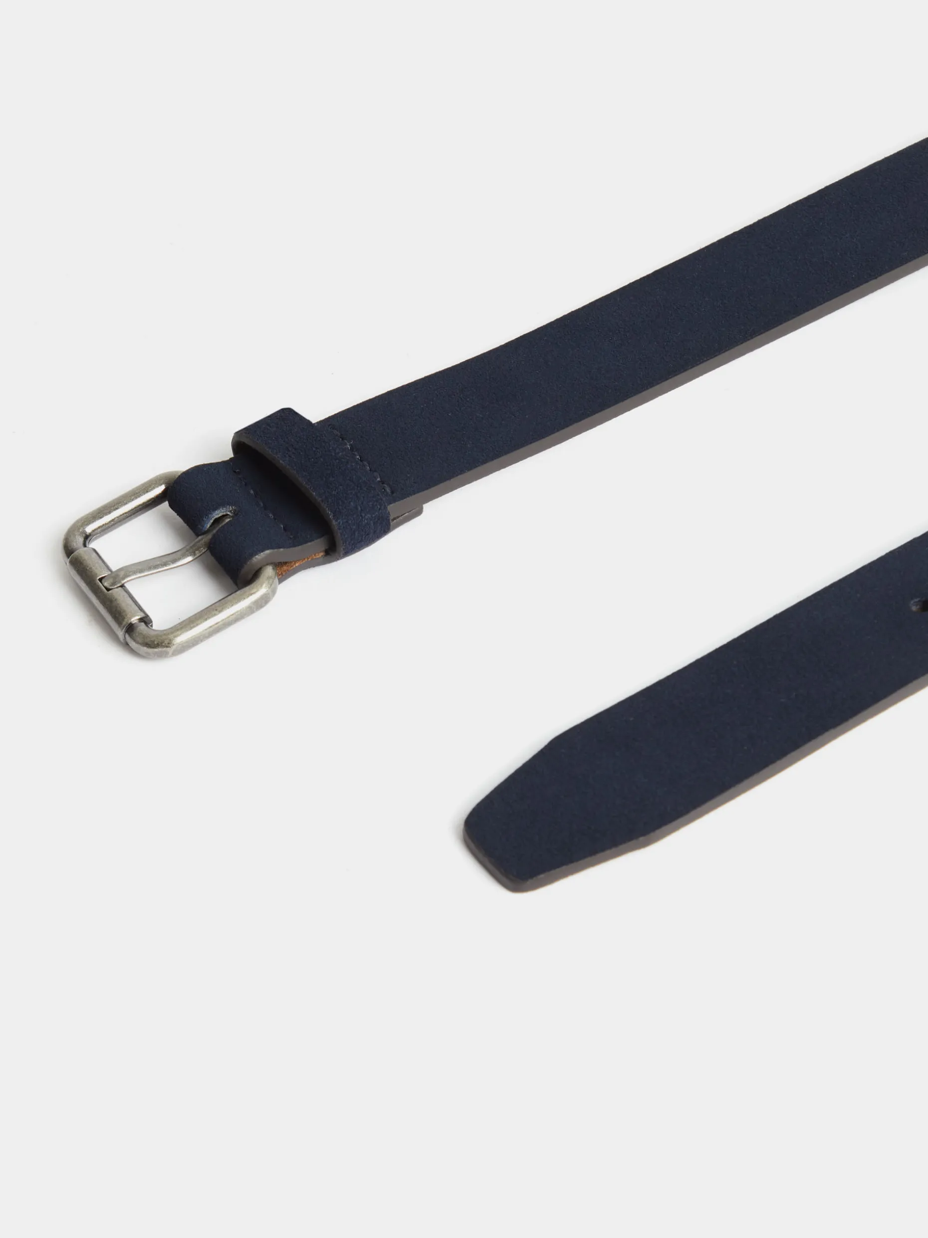 Cinturón listo estilo casual confeccionado en serraje con cierre mediante hebilla metálica a contraste y pasador al tono. Detalles y pespuntes al tono.