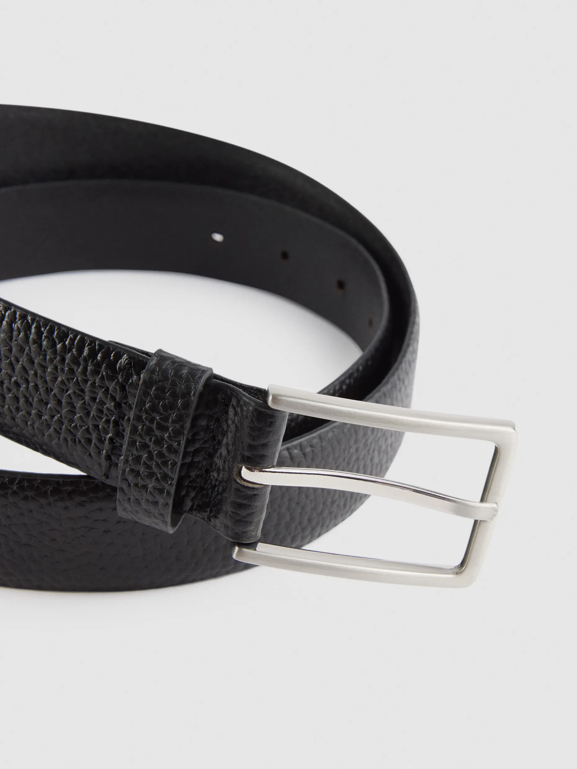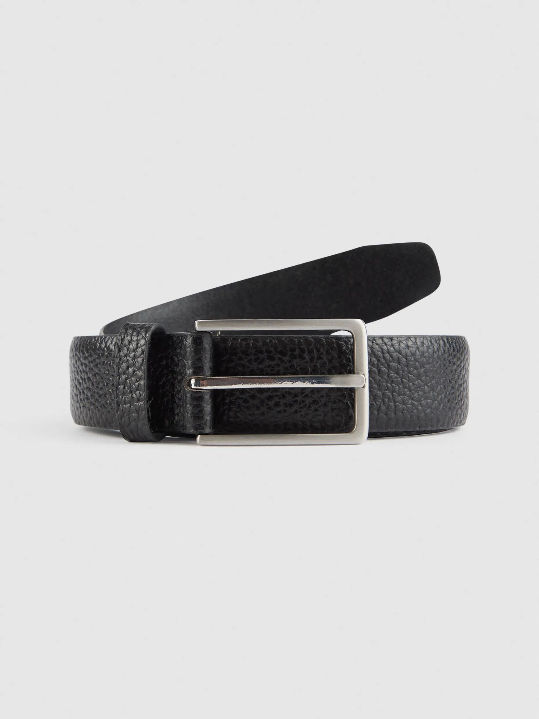 Cinturón confeccionado en piel con textura rugosa, cierre mediante hebilla metálica a contraste y pasador al tono. Detalles y pespuntes al tono.