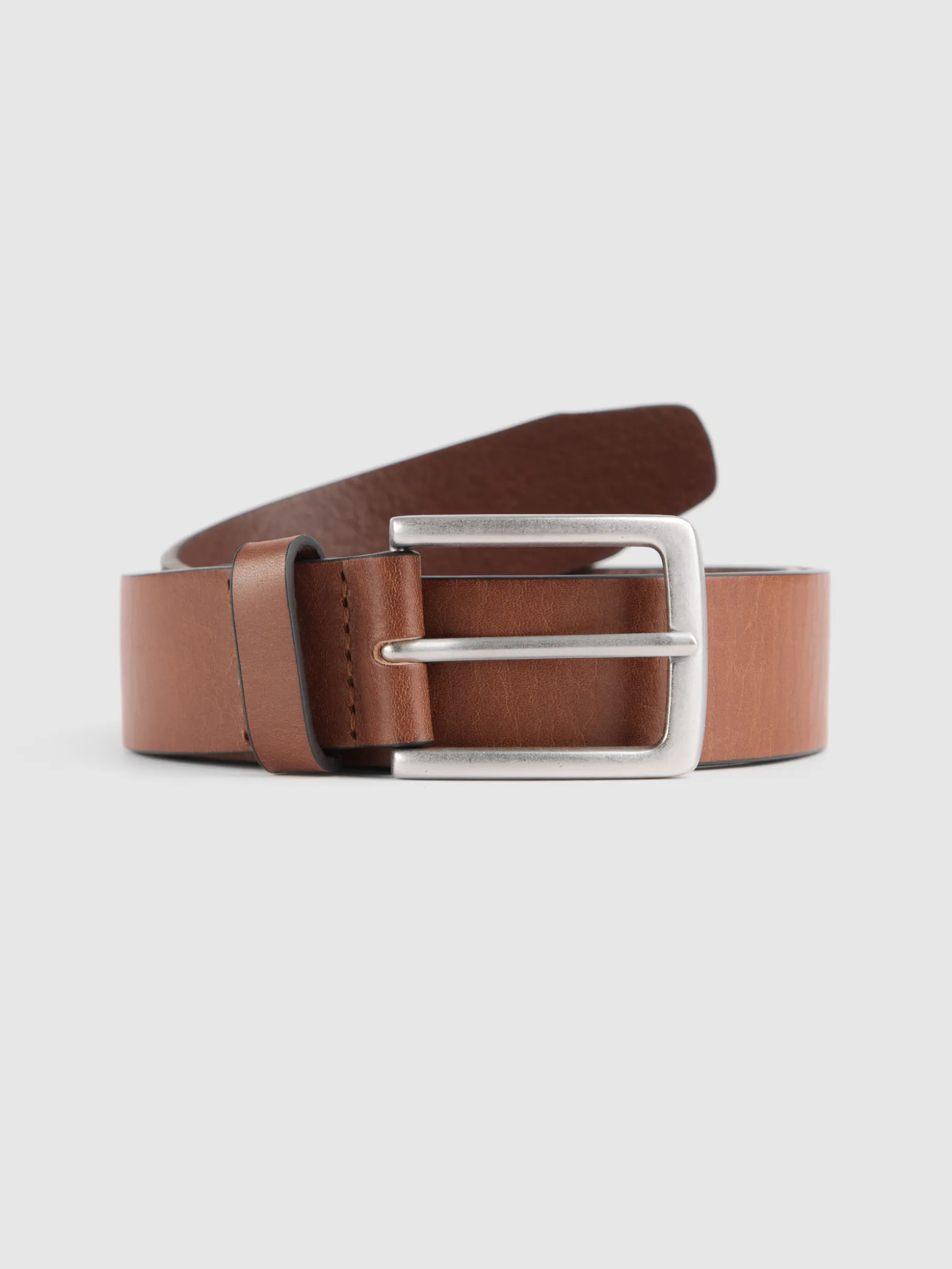 Cinturón listo estilo casual confeccionado en cuero con cierre mediante hebilla metálica a contraste y pasador al tono. Detalles y pespuntes al tono.