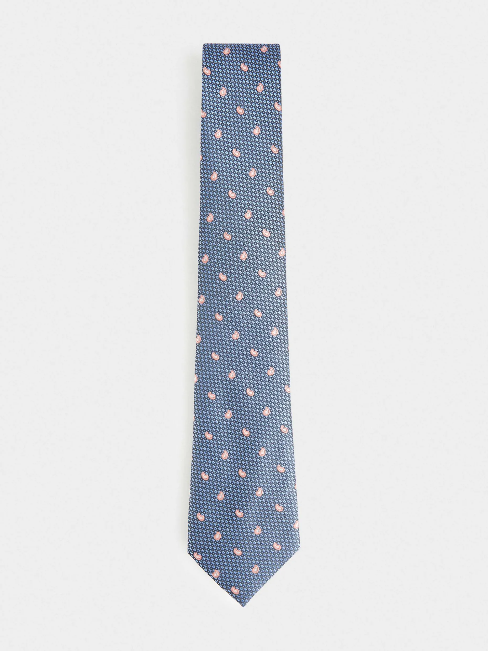 Corbata estilo jacquard con diseño estampado a contraste confeccionada en 100% poliéster. Cuenta con el logo de la marca grabado en el interior.