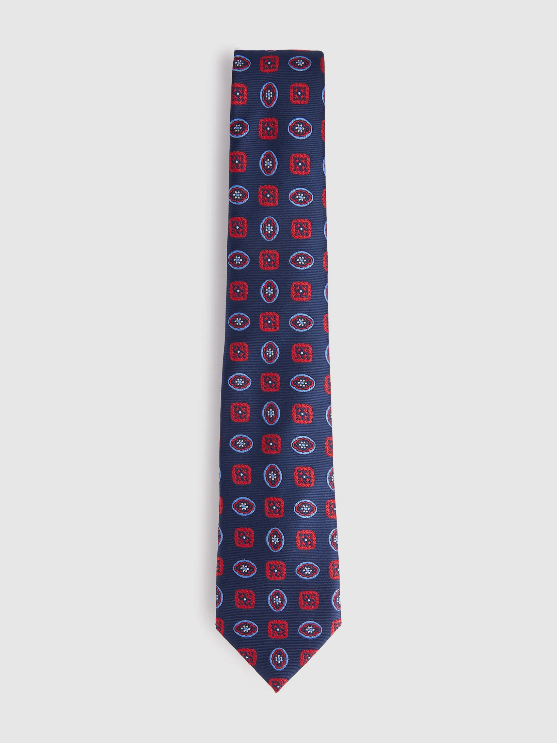 Corbata estilo jacquard con diseño estampado a contraste confeccionada en 100% poliéster. Cuenta con el logo de la marca grabado en el interior.