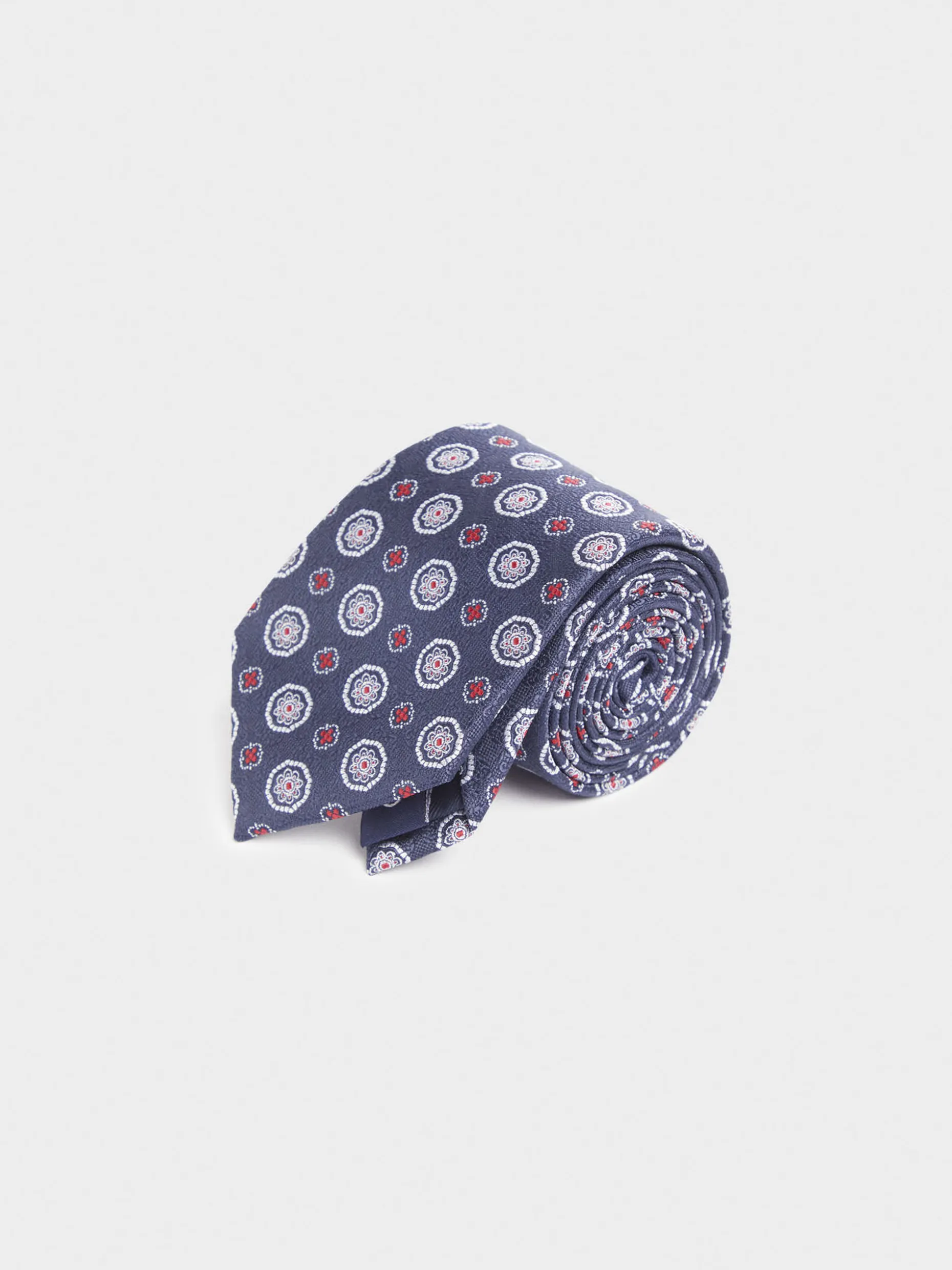 Corbata estilo jacquard con diseño estampado a contraste confeccionada en 100% poliéster. Cuenta con el logo de la marca grabado en el interior.