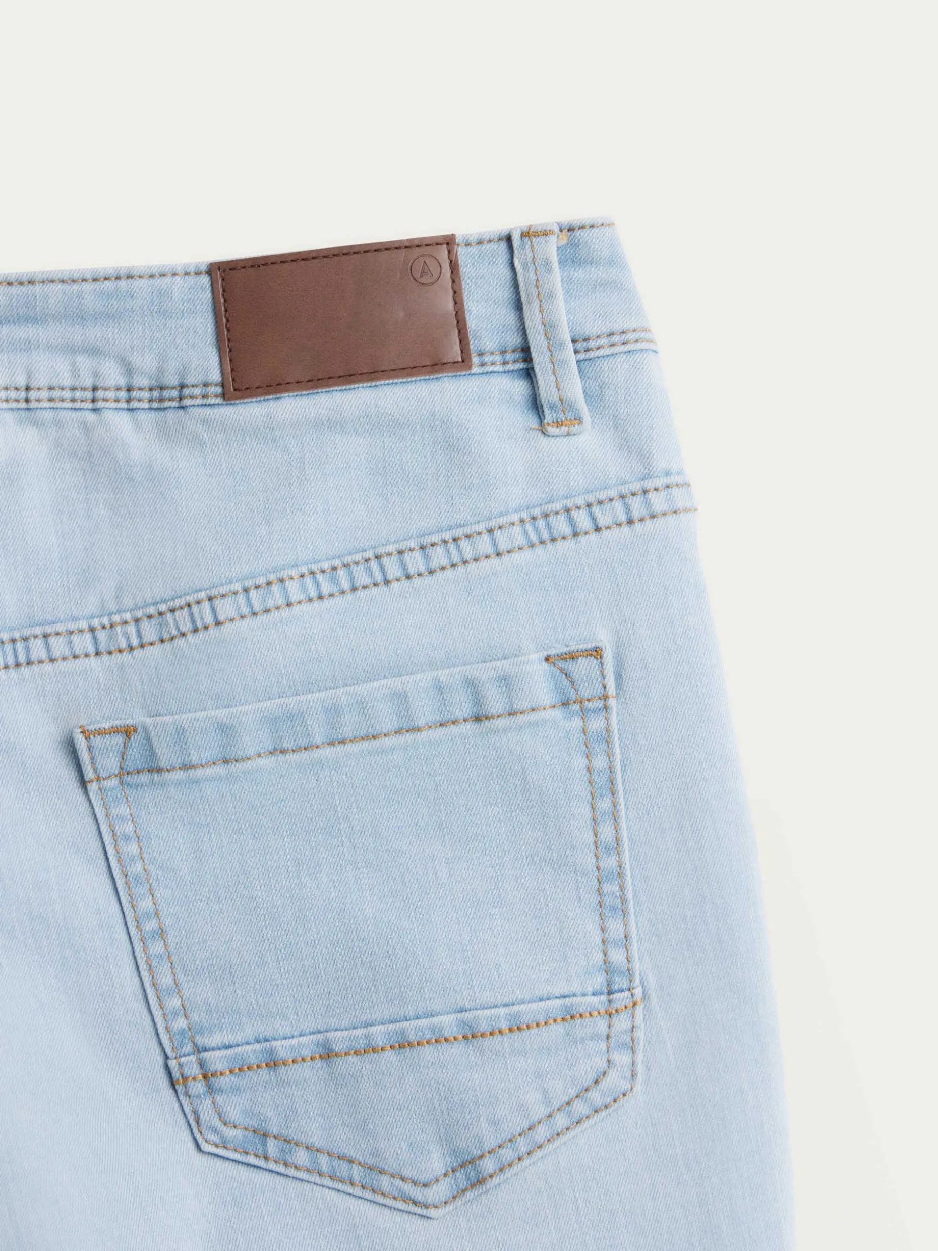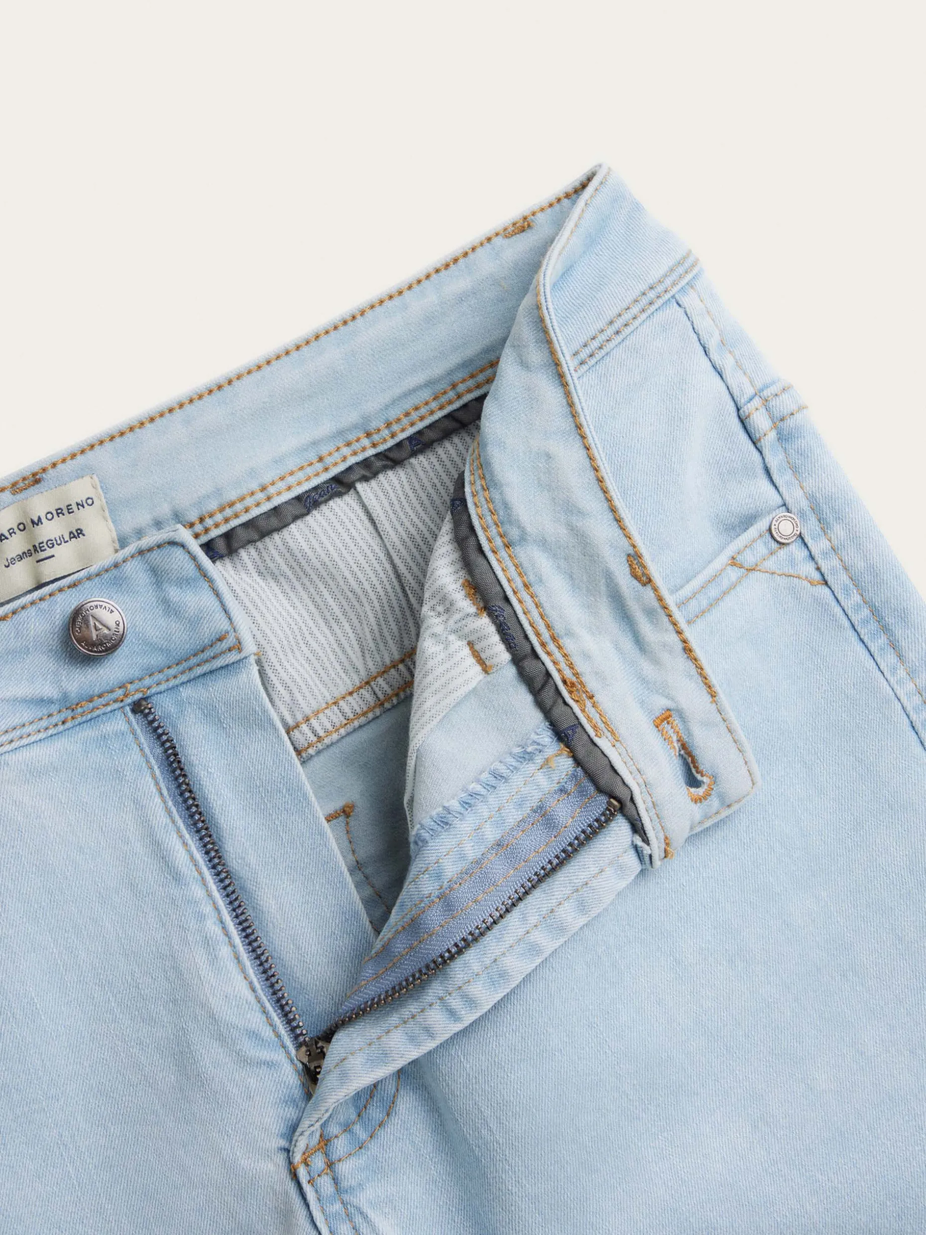 Pantalón denim de corte regular fit con cinco bolsillos y cierre central mediante botón y cremallera, pespuntes en color camel, fornituras personalizadas y etiqueta en efecto piel en la cinturilla.