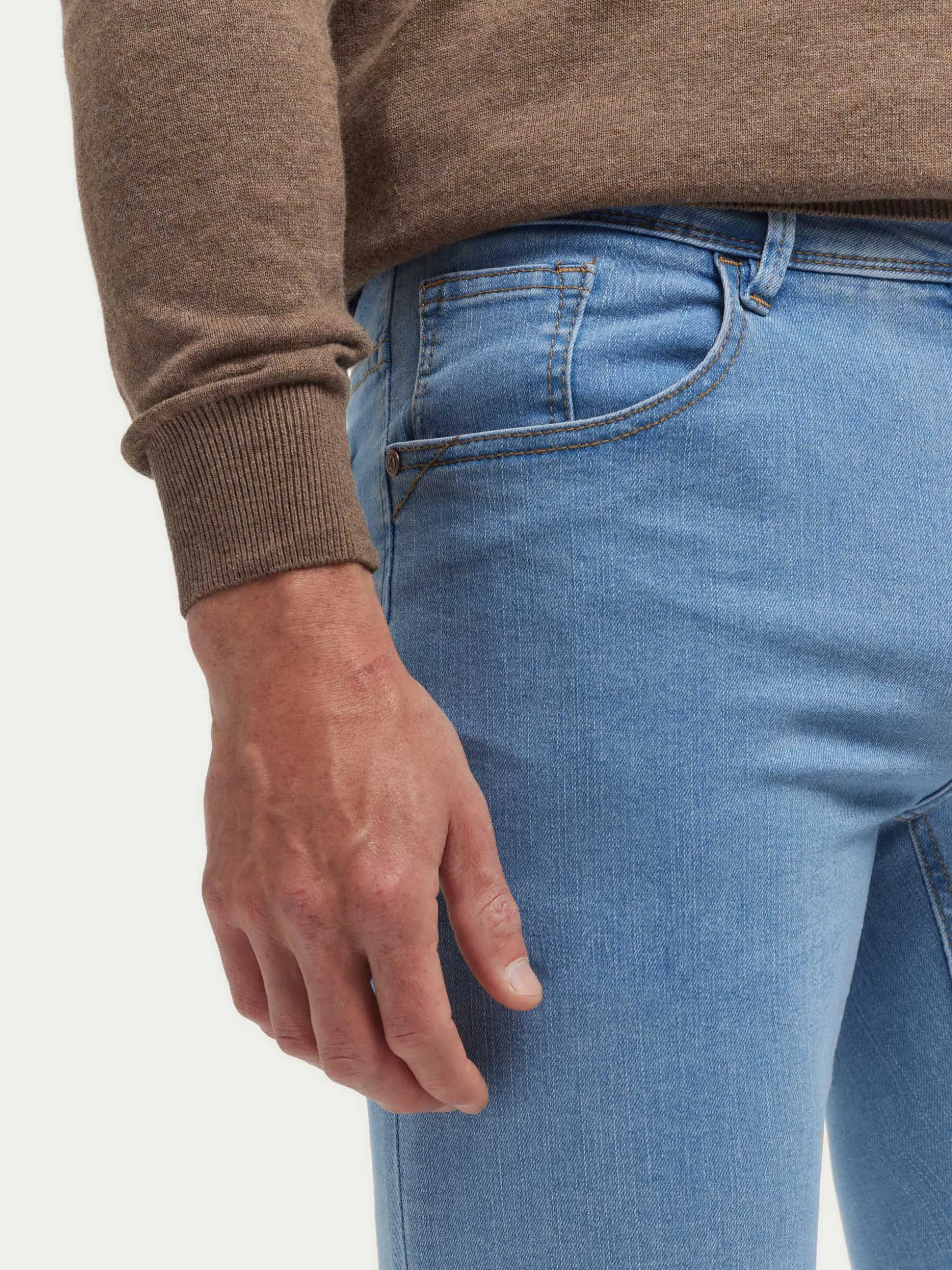 Pantalón denim de corte slim fit con cinco bolsillos y cierre central mediante botón y cremallera, pespuntes en color camel, fornituras personalizadas y etiqueta en efecto piel en la cinturilla.