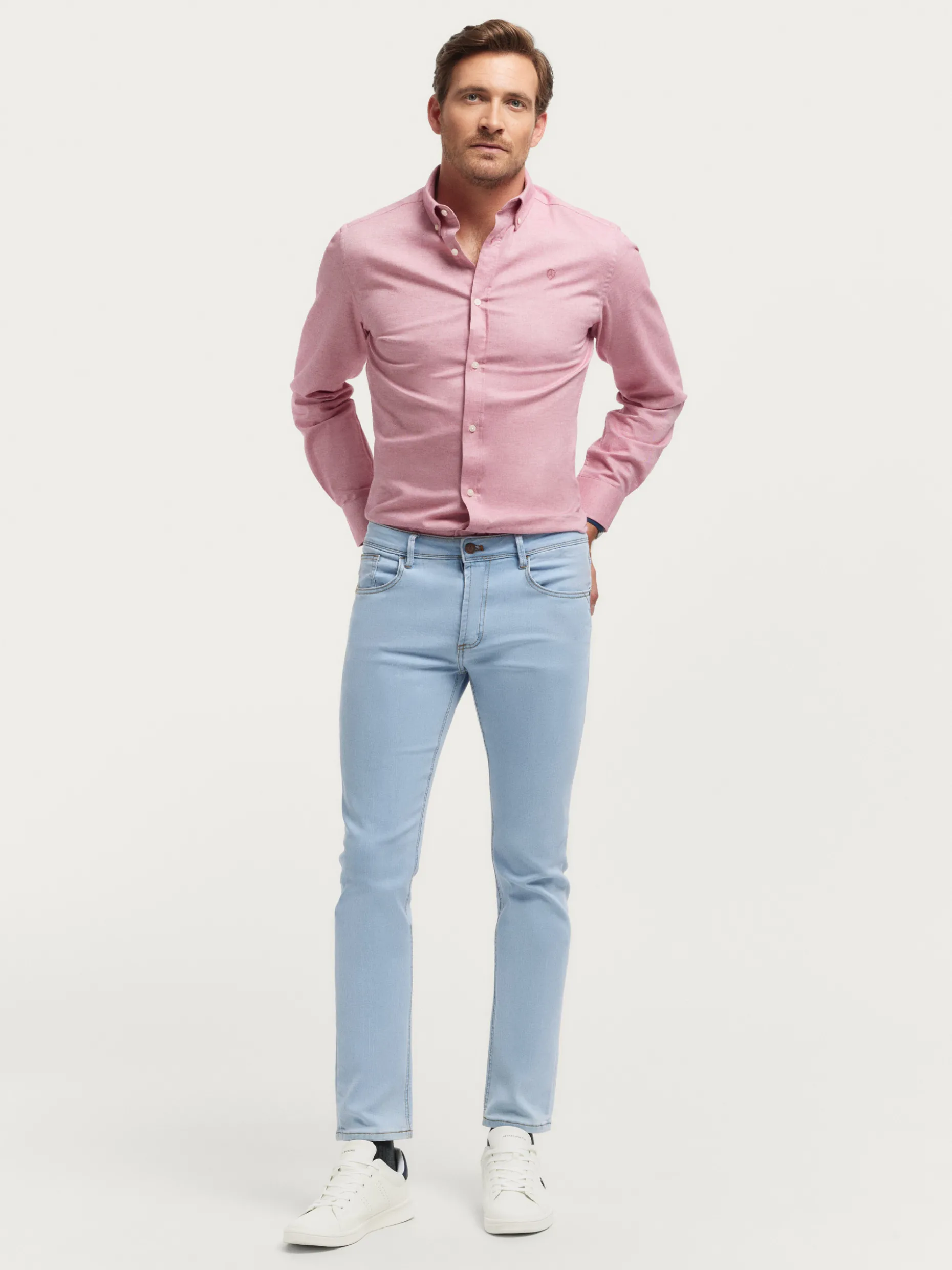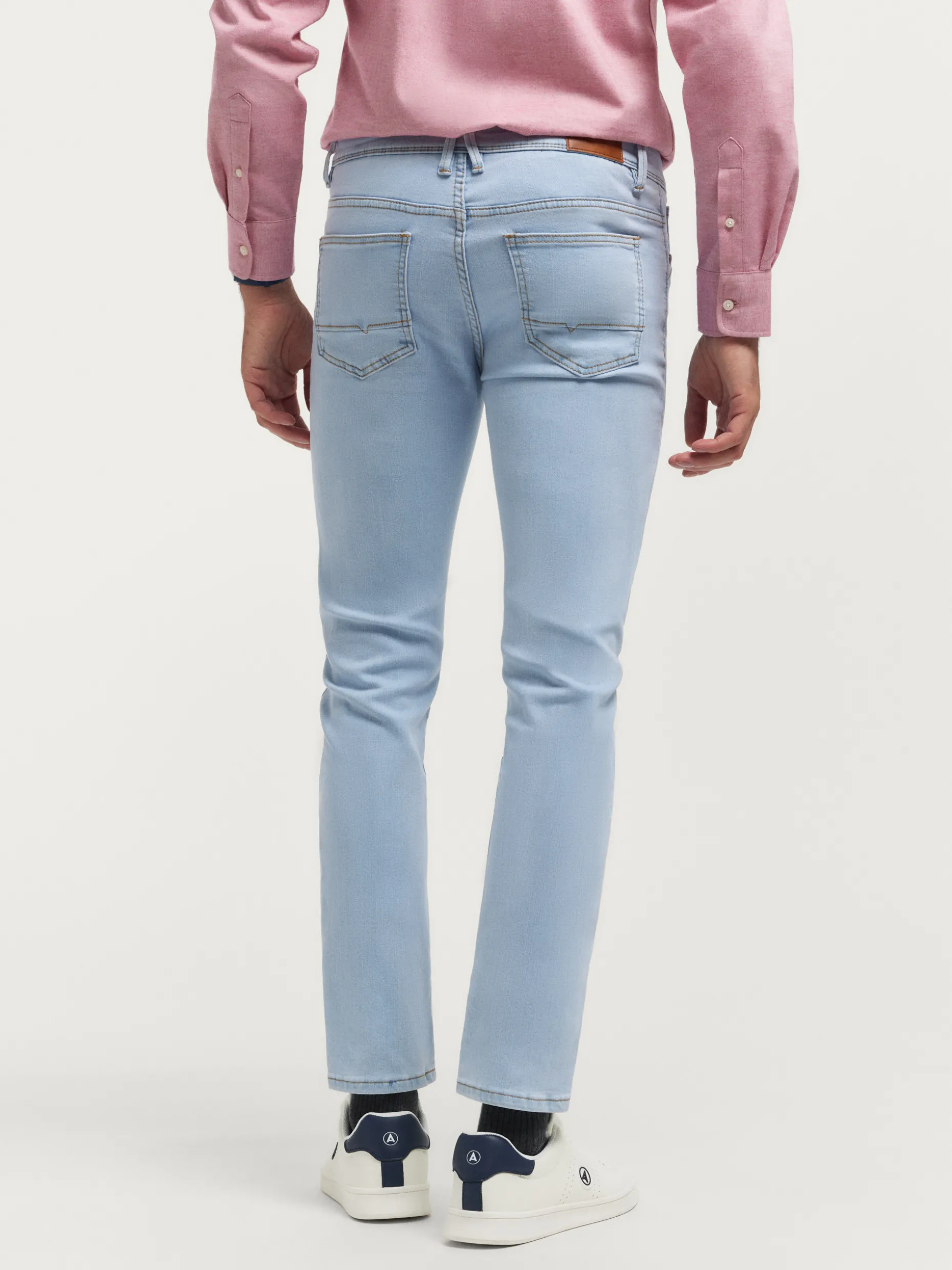 Pantalón denim de corte slim fit con cinco bolsillos y cierre central mediante botón y cremallera, pespuntes en color camel, fornituras personalizadas y etiqueta en efecto piel en la cinturilla.