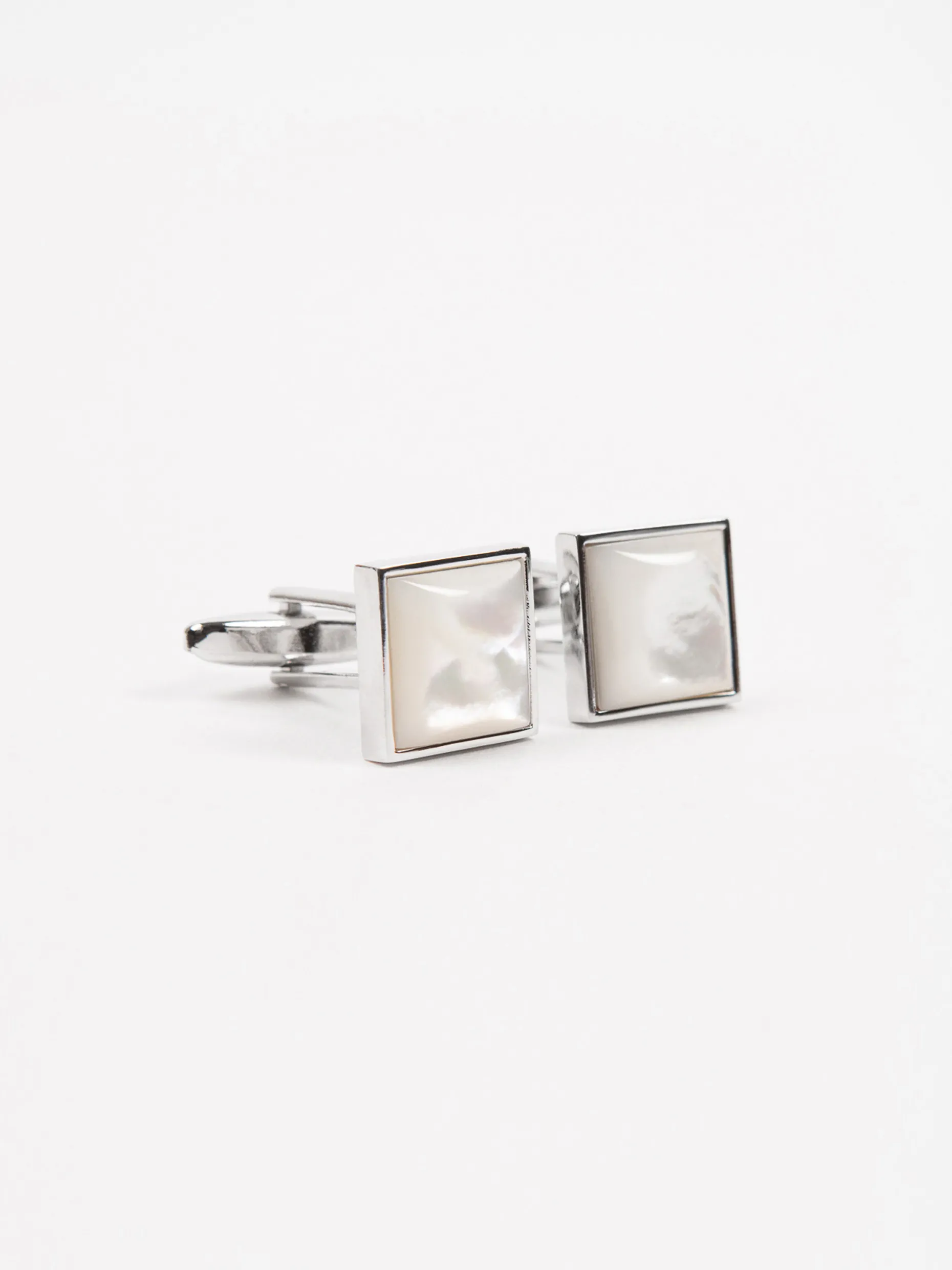 Gemelo metálico de forma cuadrada que cuenta con engarce de madre perla.