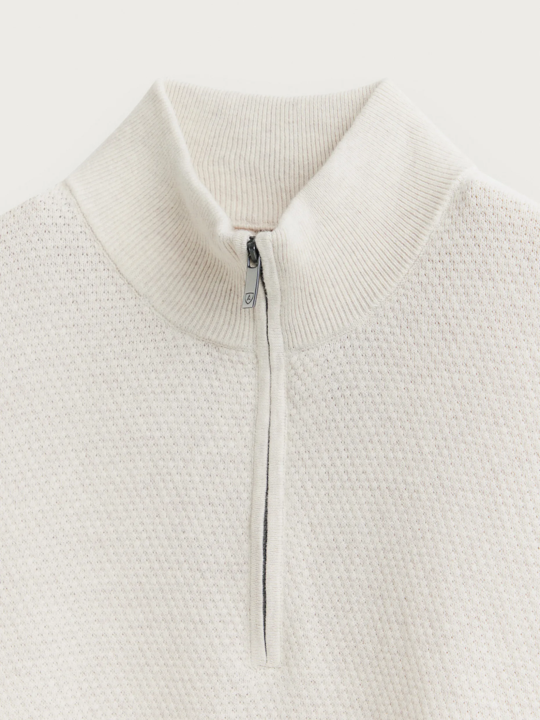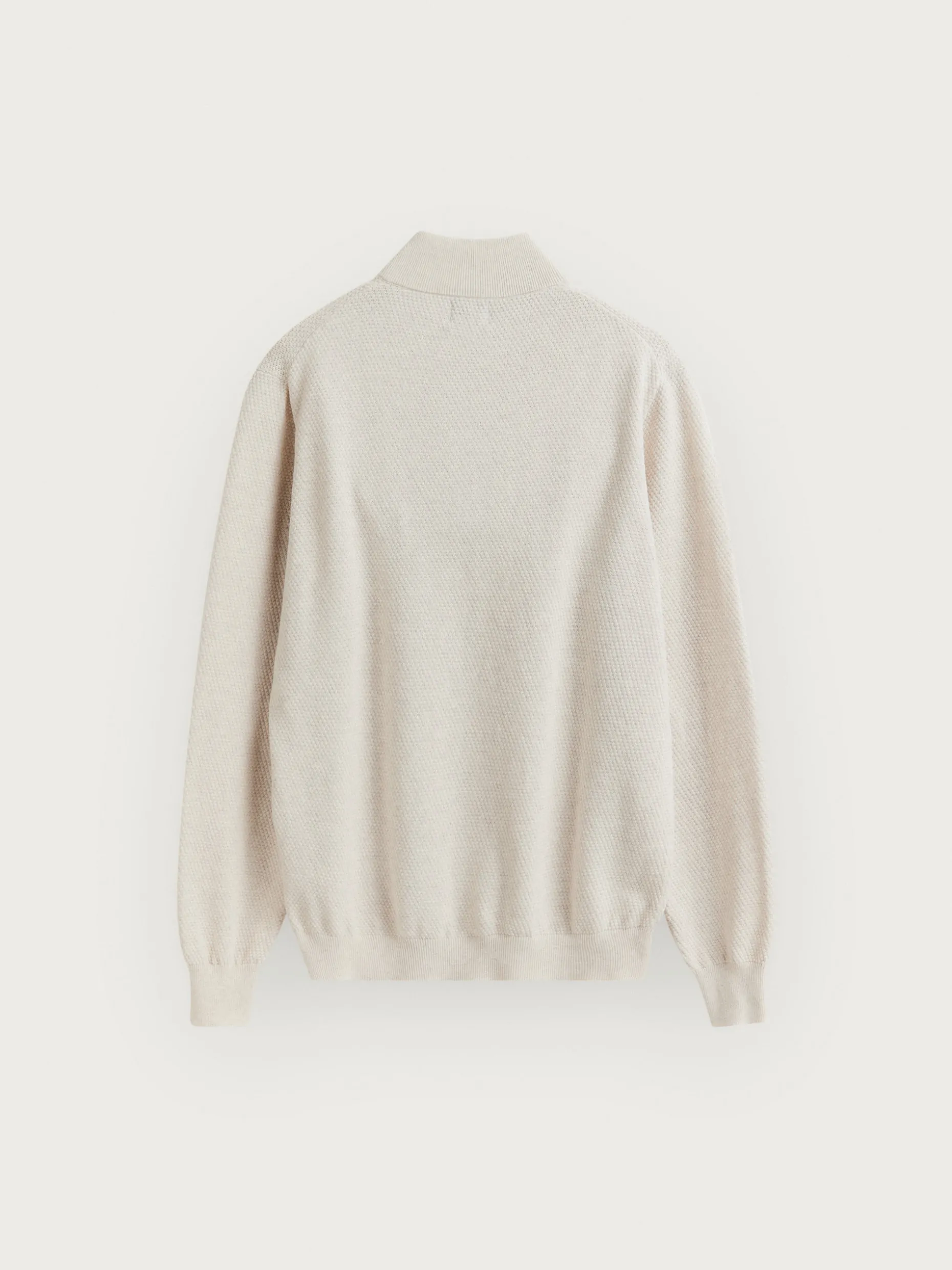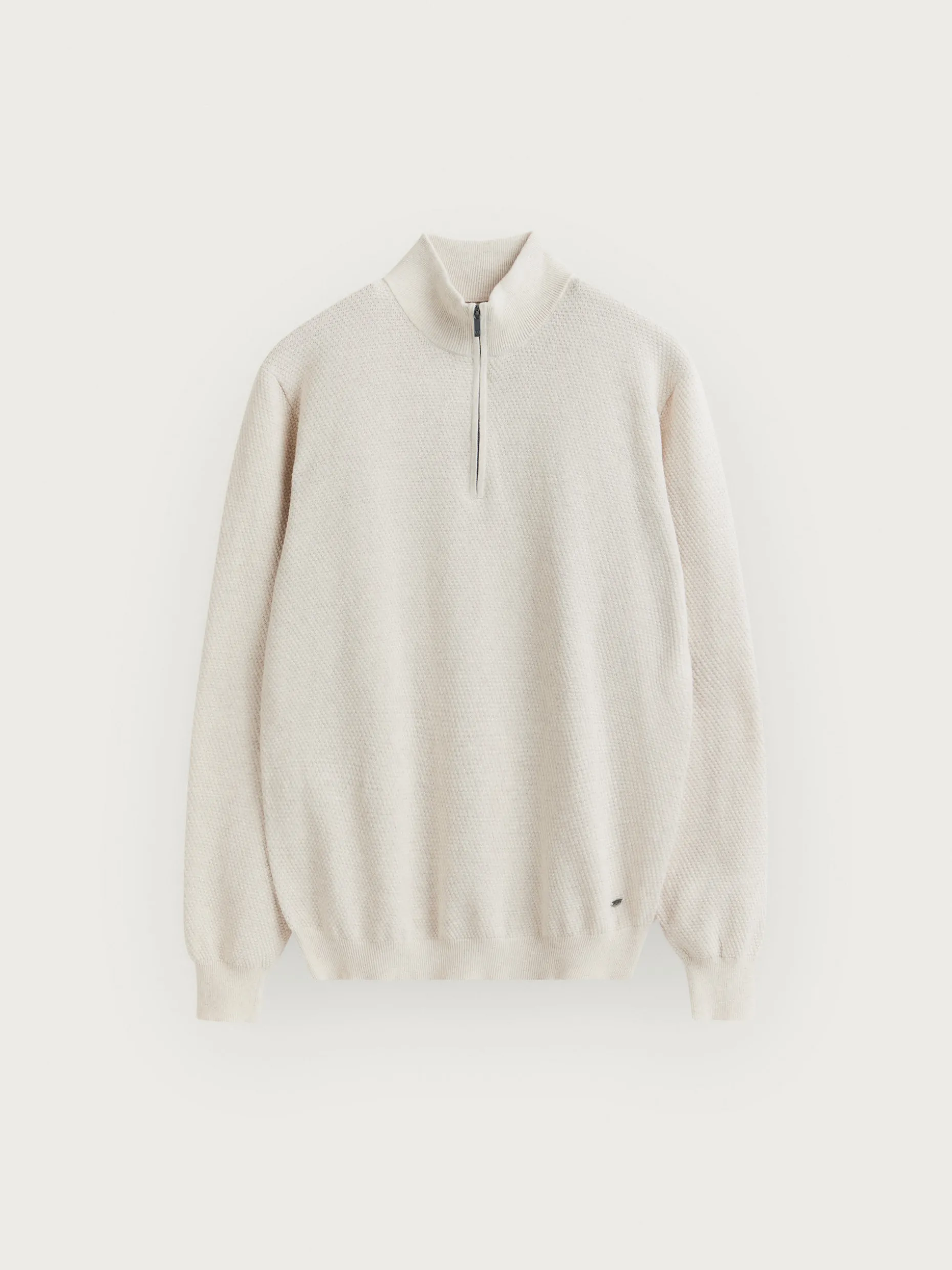 Jersey confeccionado en algodón con estructura en su tejido. Cuenta con cuello alto con medio cierre de cremallera y cuello, puños y bajo en acabado elástico. Corte regular fit.