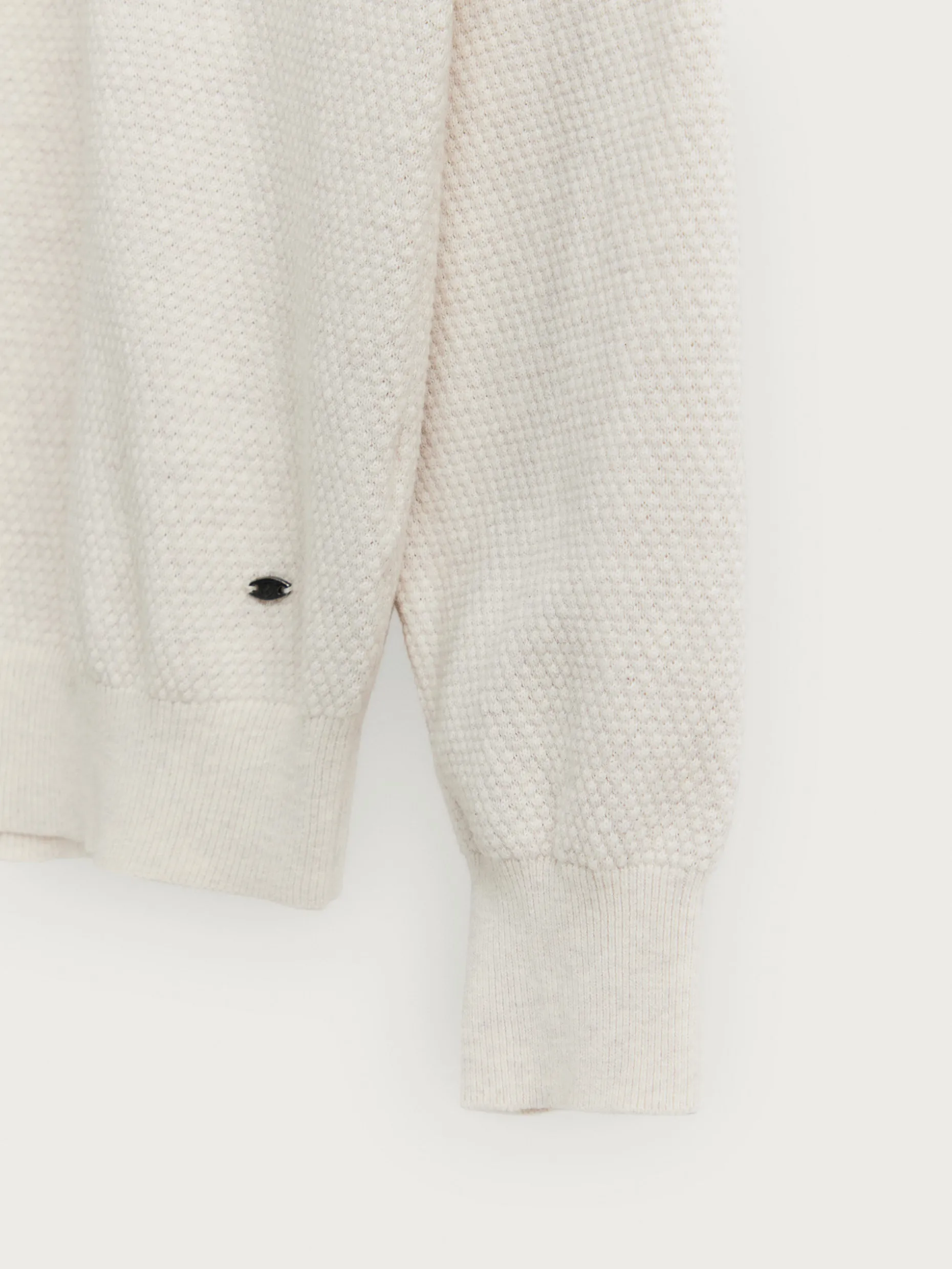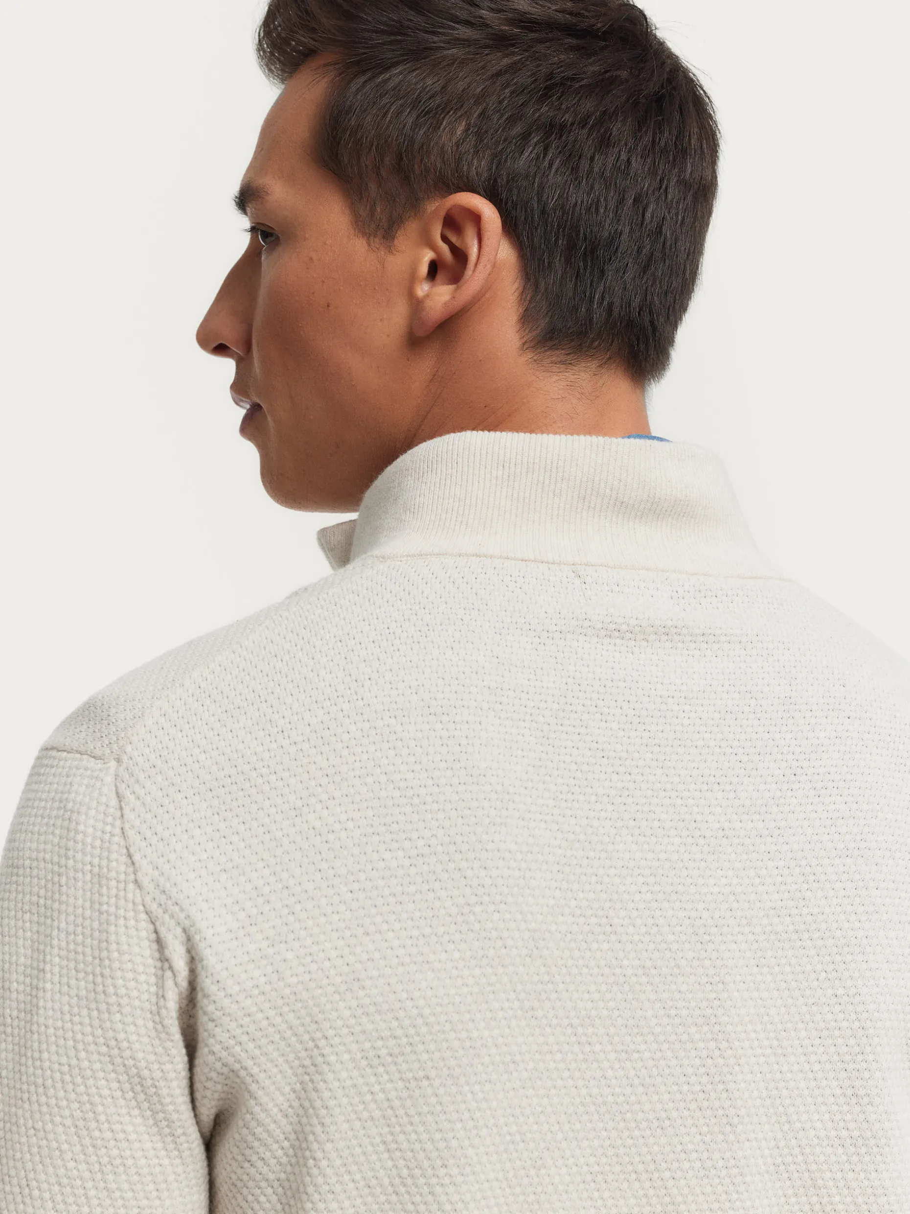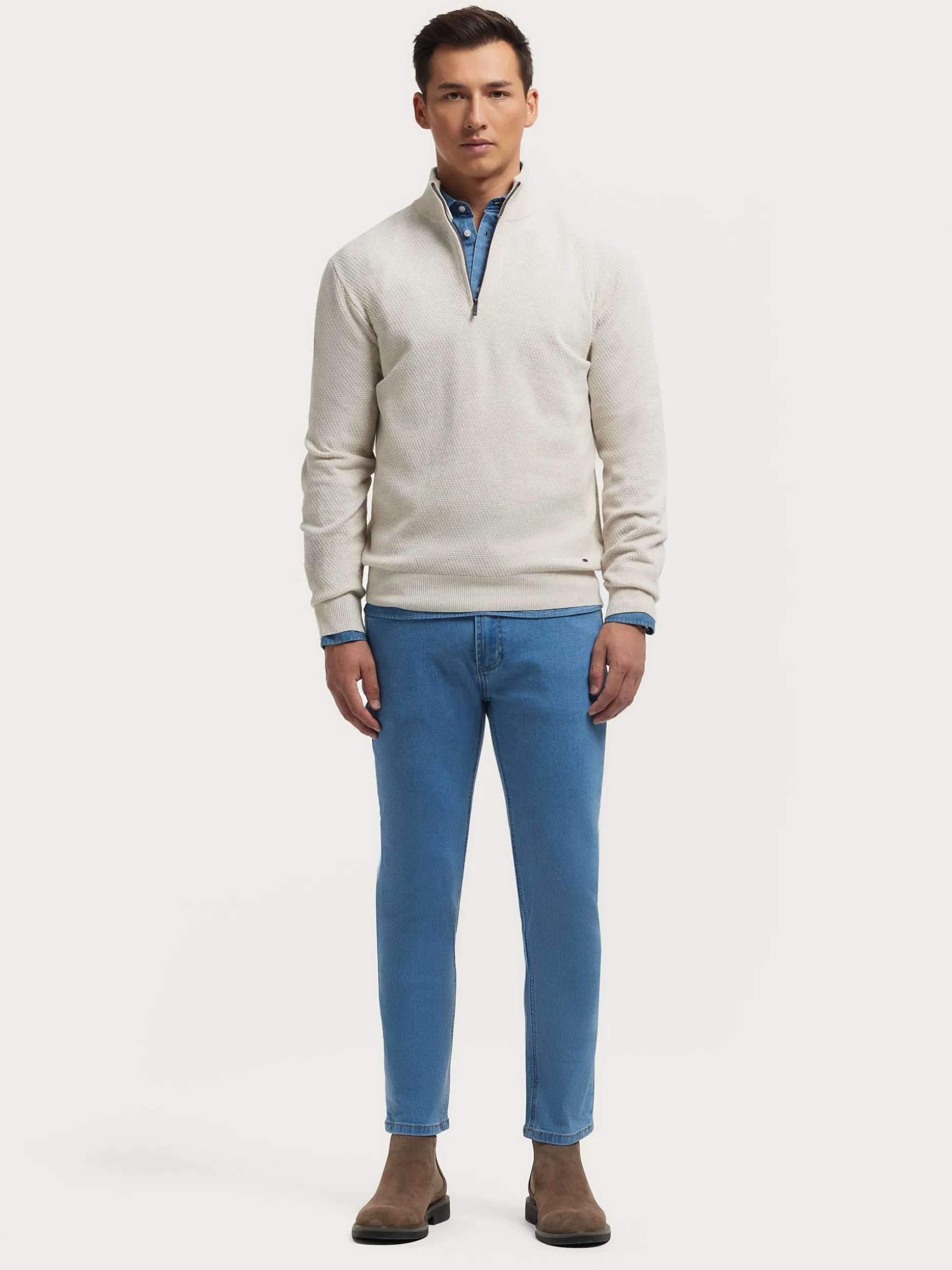 Jersey confeccionado en algodón con estructura en su tejido. Cuenta con cuello alto con medio cierre de cremallera y cuello, puños y bajo en acabado elástico. Corte regular fit.