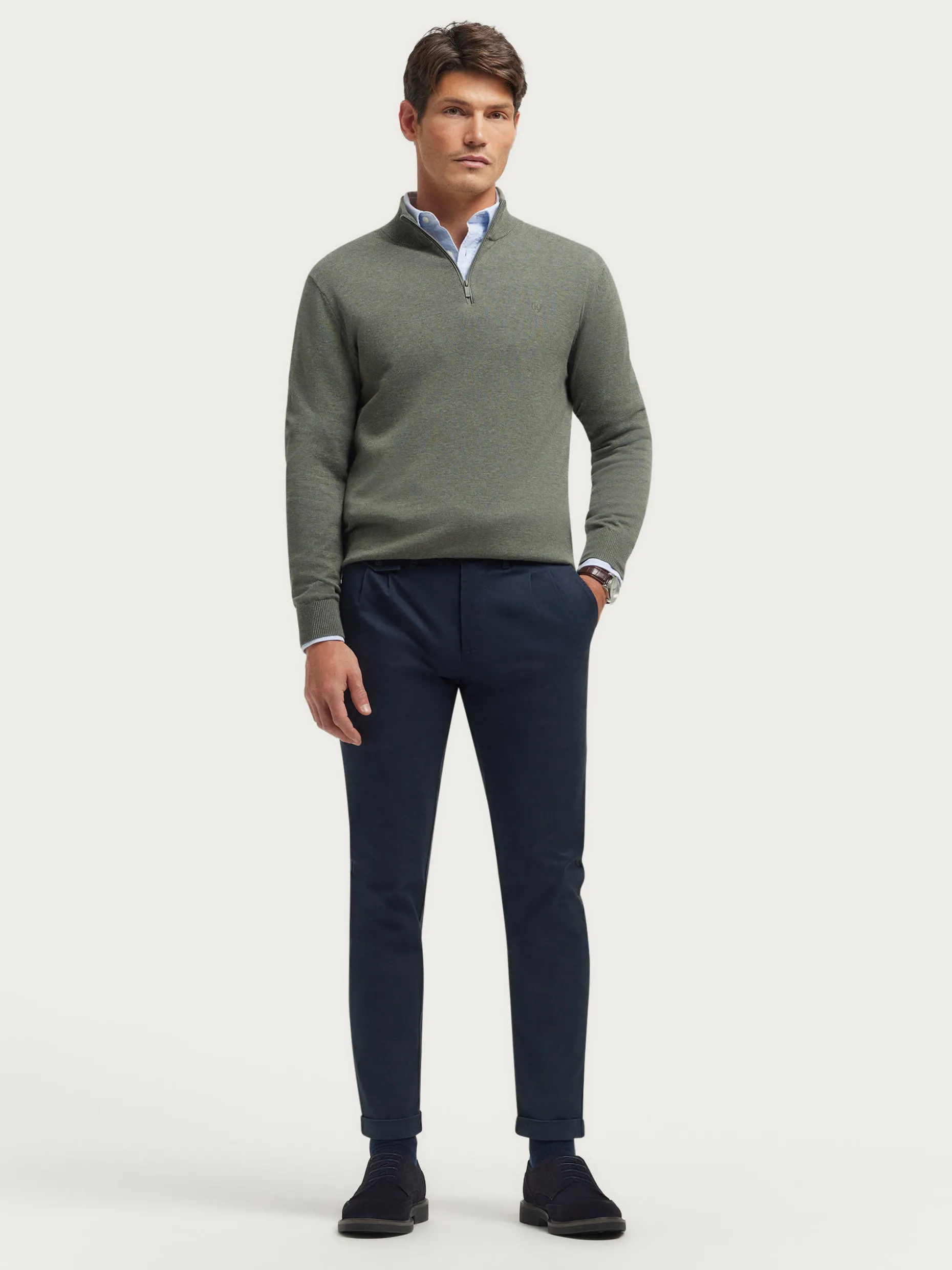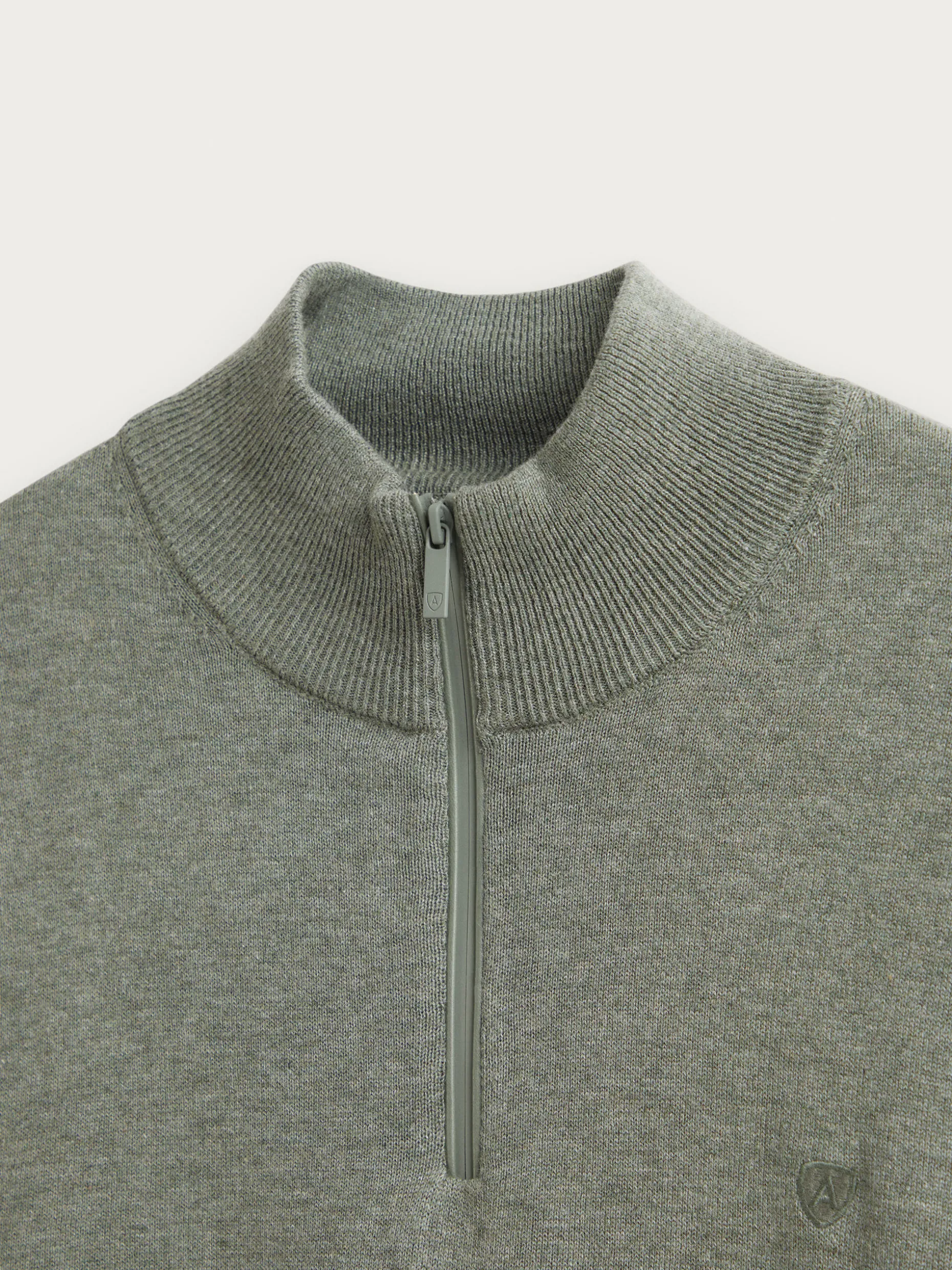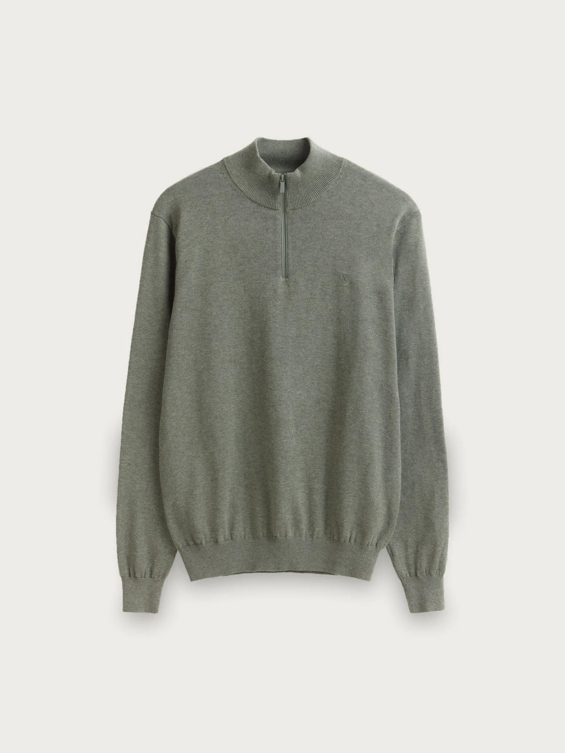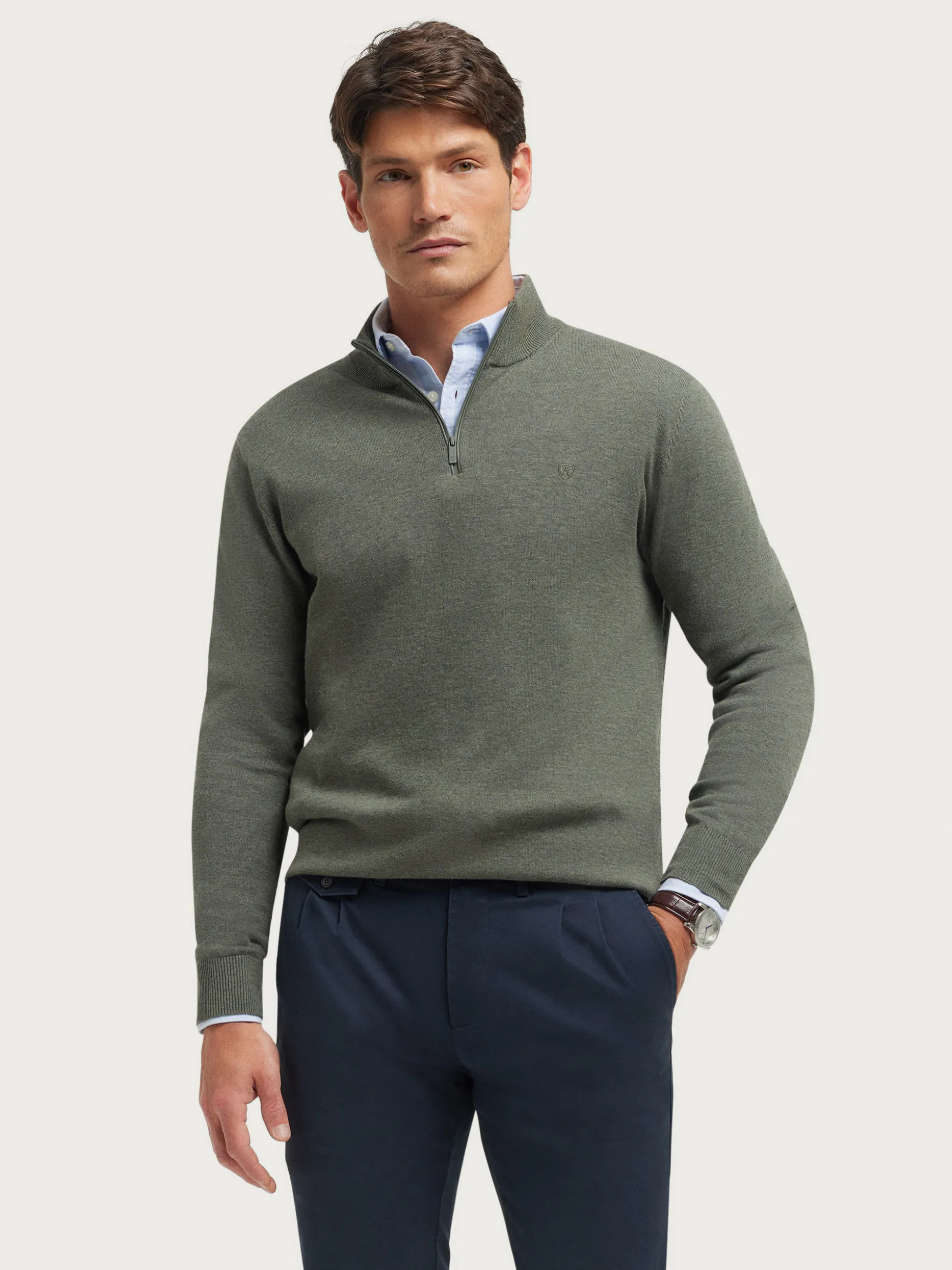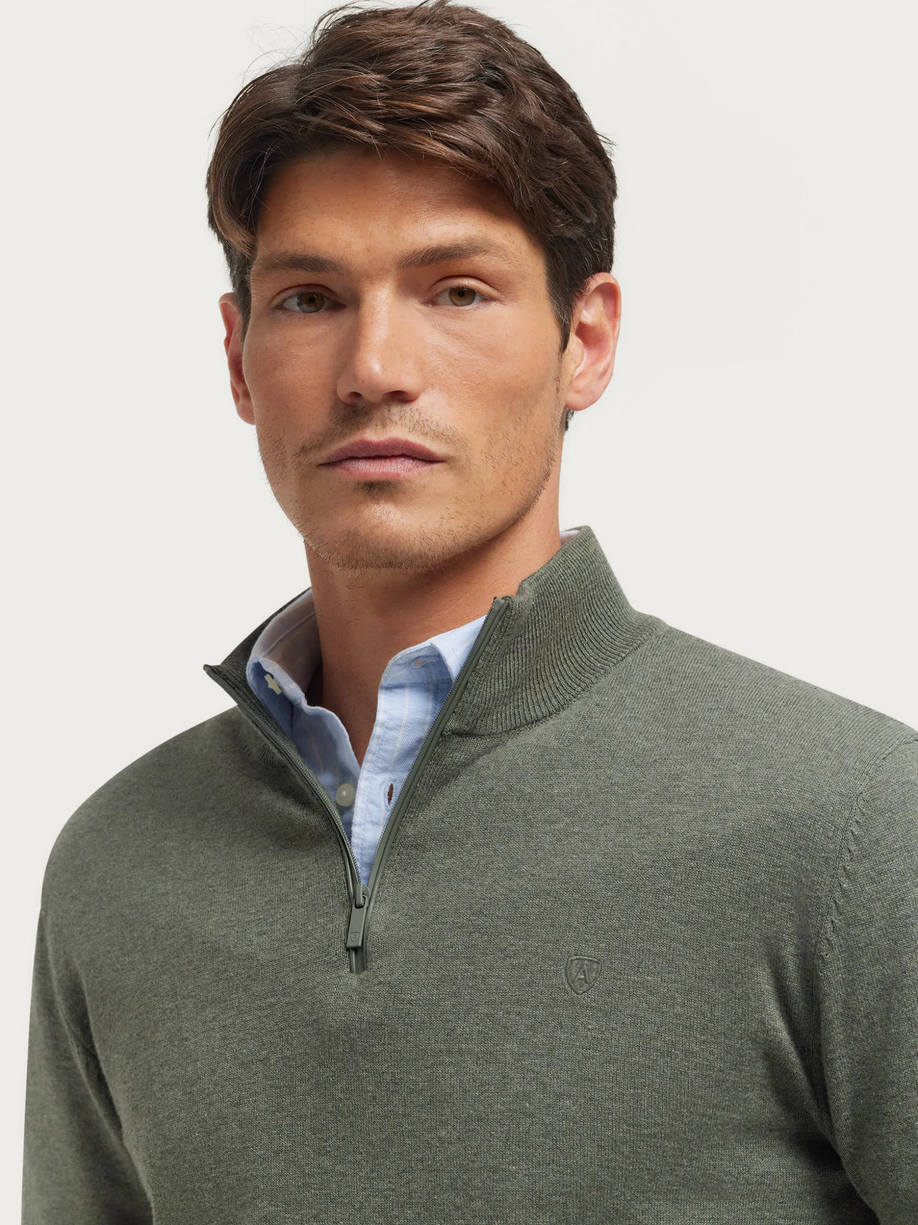 Jersey de corte regular confeccionado en algodón. Cuello alto con medio cierre de cremallera. Logo bordado en el frontal al tono. Cuello, puños y bajo en acabado elástico.