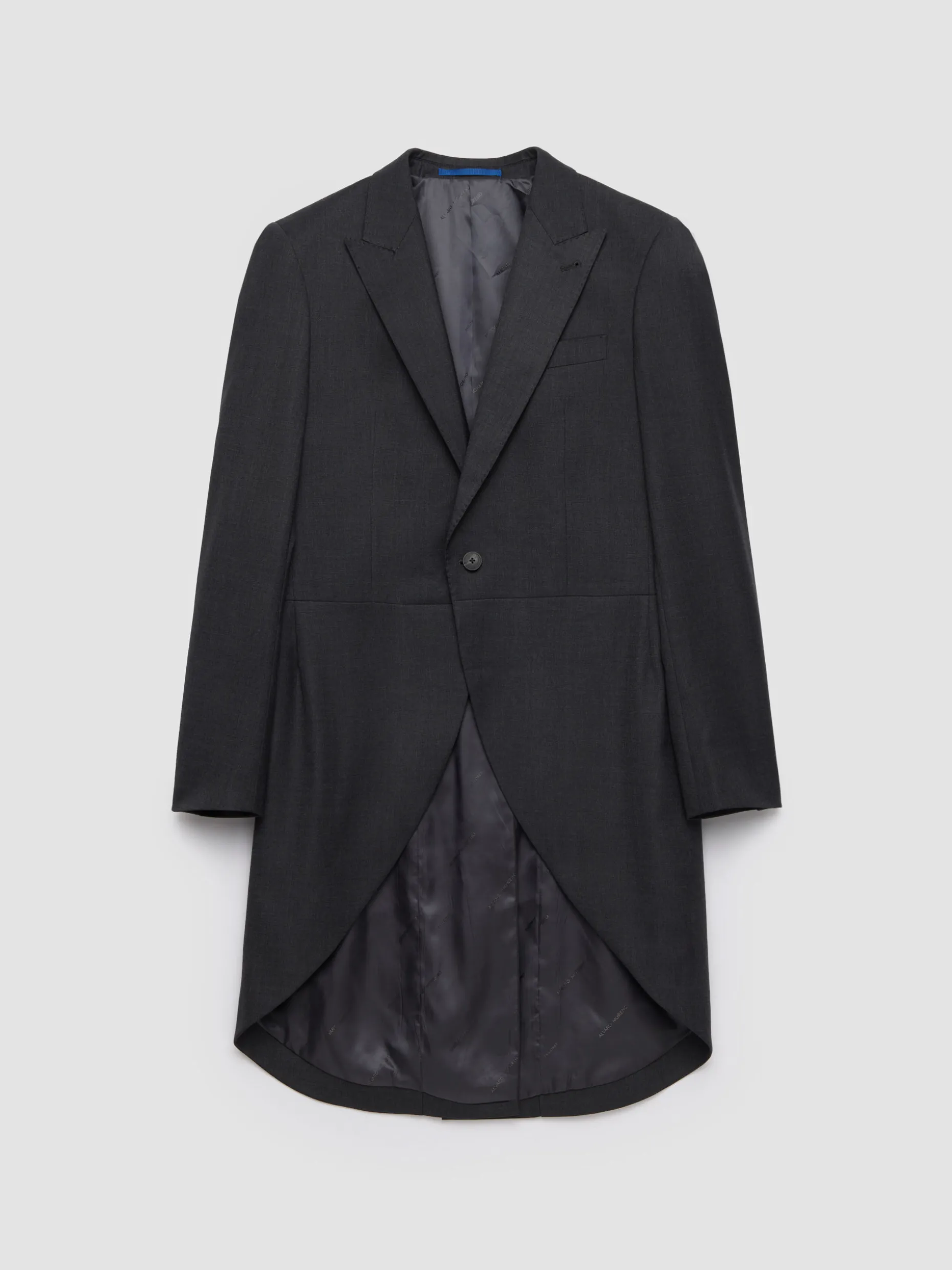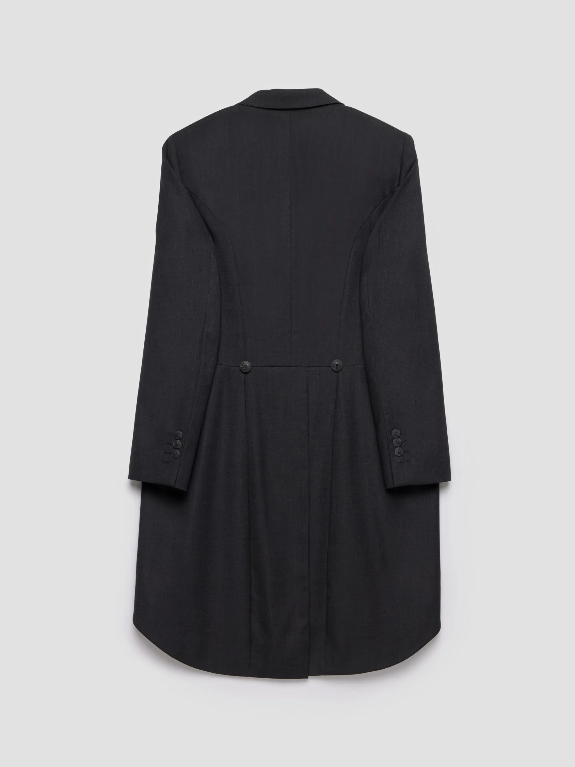 Levita clásico de un conjunto de dos piezas. Cuenta con cuello y solapa, cierre central mediante botonadura, bolsillo de ojal en el pecho, manga larga con botones en los puños, abertura en la espalda y forrada en su interior con bolsillos.