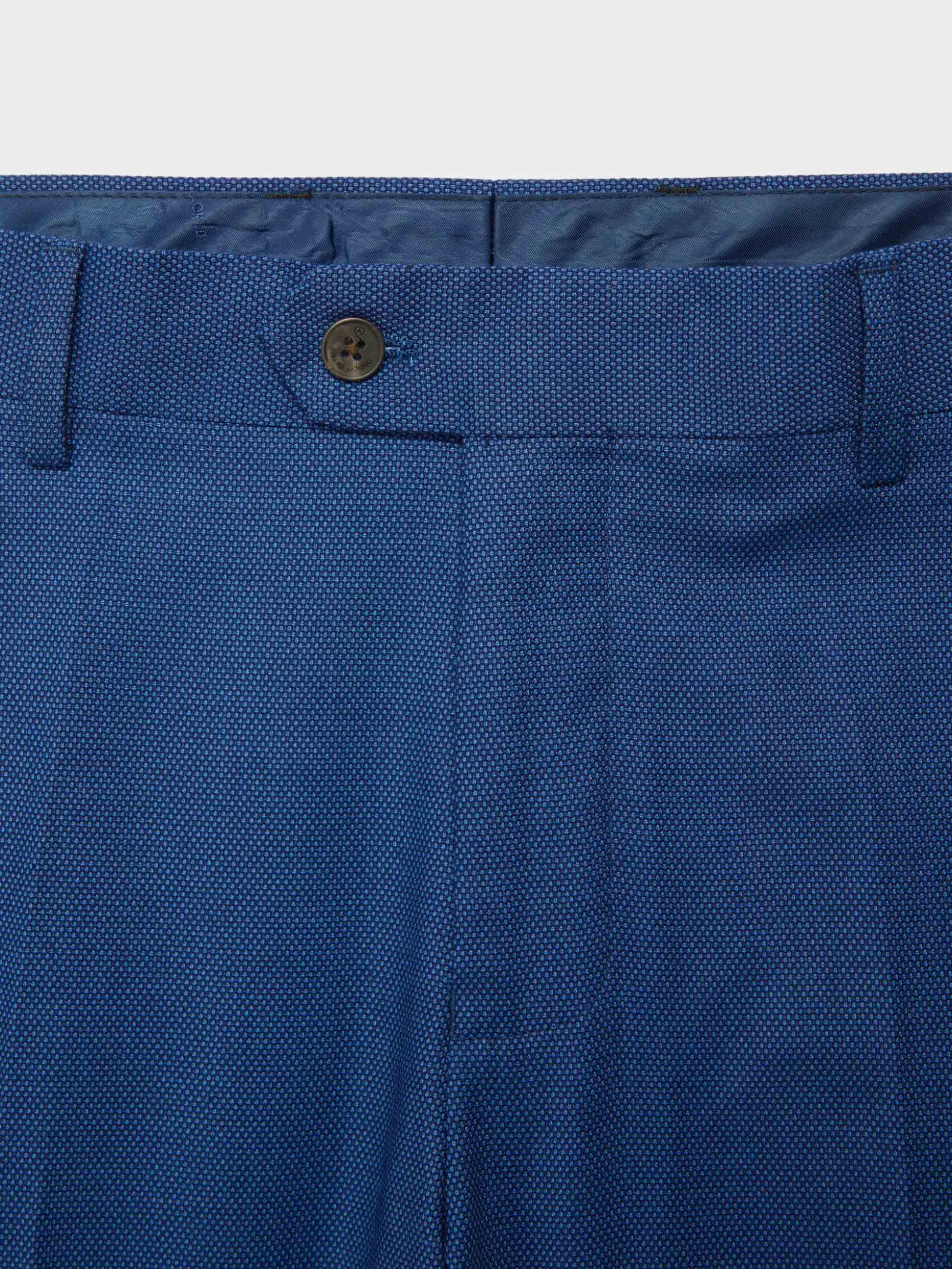 Pantalón de traje en tejido de ojo de perdiz que cuenta con cierre frontal de cremallera y botones, dos bolsillos abiertos en la parte delantera y dos bolsillos traseros con cierre mediante botón. Forrado en su interior.