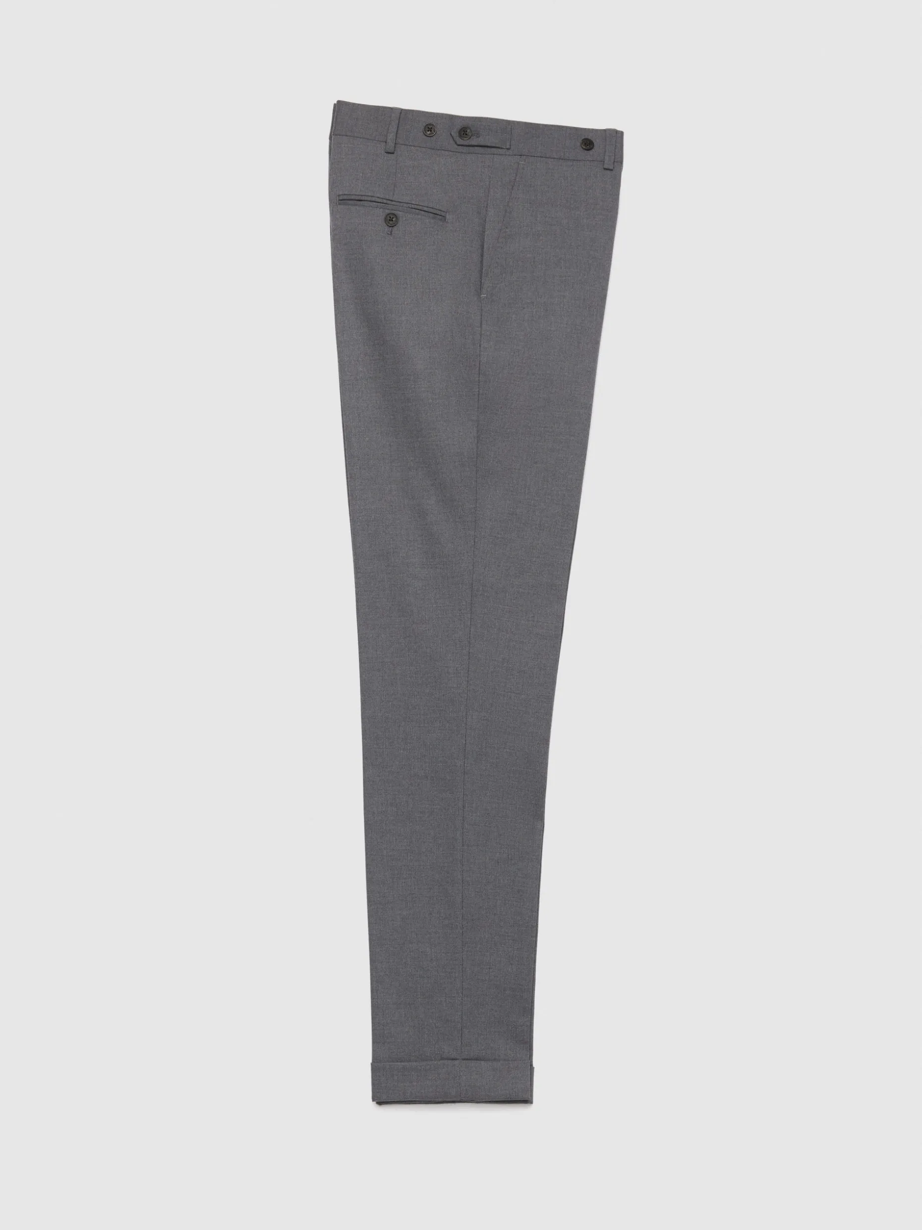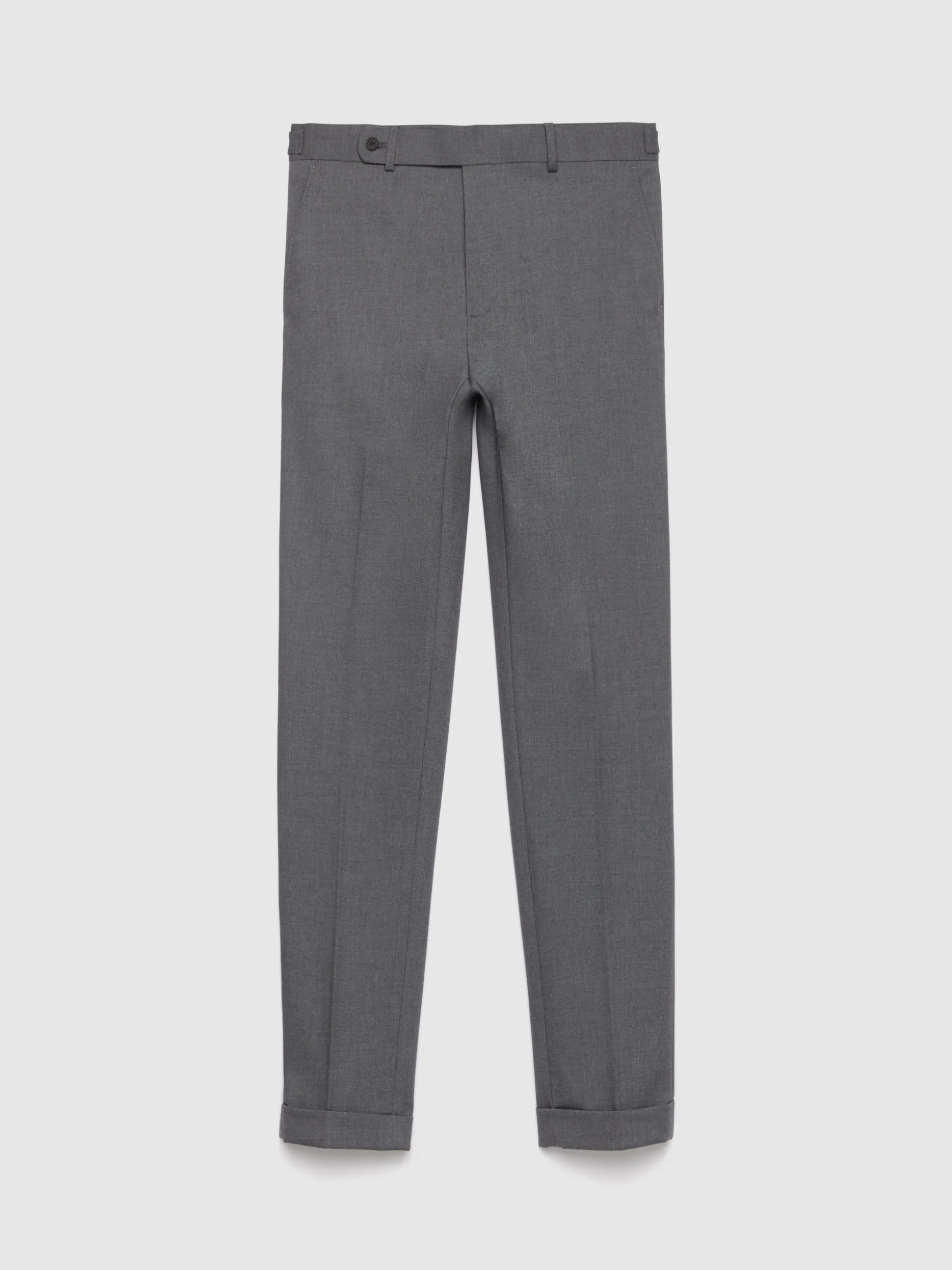 Pantalón de traje en tejido fil a fil que cuenta con cierre frontal con prolonga de botón desplazado y cremallera, dos bolsillos en el frontal y un bolsillo con cierre de botón en la parte trasera. Bajo con vuelta y detalle ajustable en la cintura. Forrado en su interior.