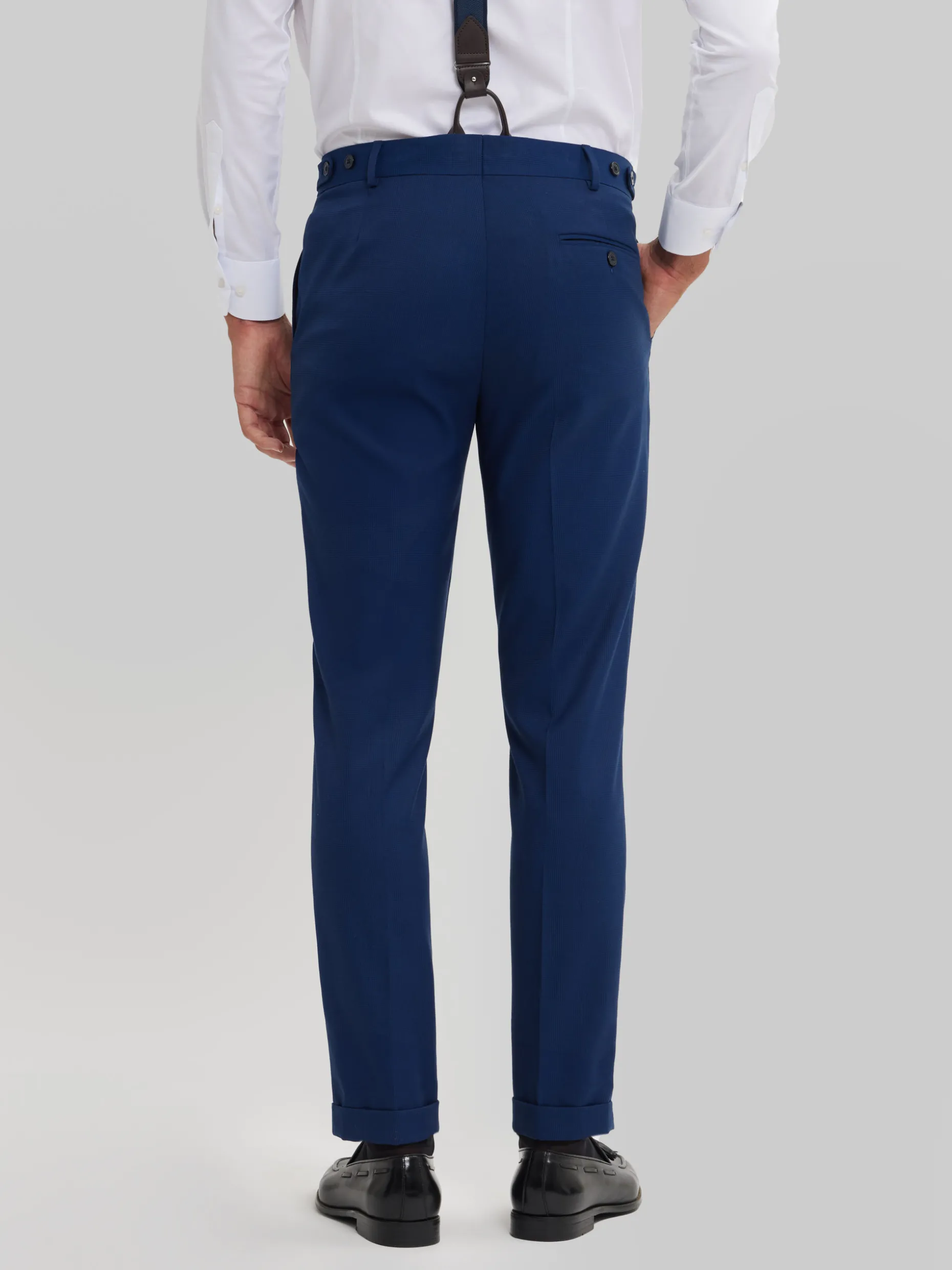 Pantalón de traje con tejido de ojo de perdiz que cuenta con cierre frontal con prolonga de botón desplazado y cremallera, dos bolsillos en el frontal y un bolsillo con cierre de botón en la parte trasera. Bajo con vuelta y detalle ajustable en la cintura. Forrado en su interior.