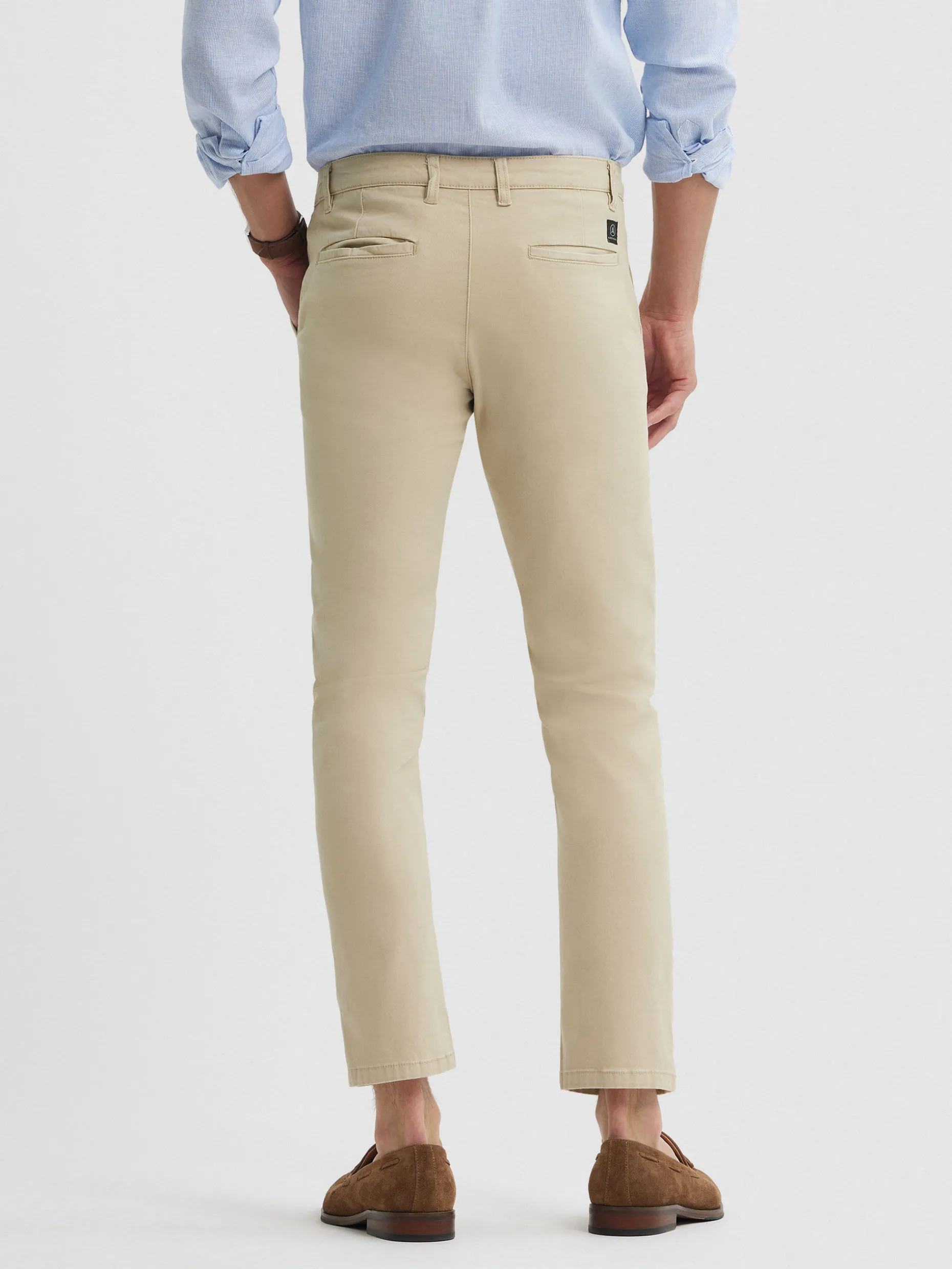Pantalón de corte slim fit de estilo chino con cierre central mediante botón y cremallera, dos bolsillos en el frontal y dos en la parte trasera con detalle personalizado a contraste sobre uno de ellos.