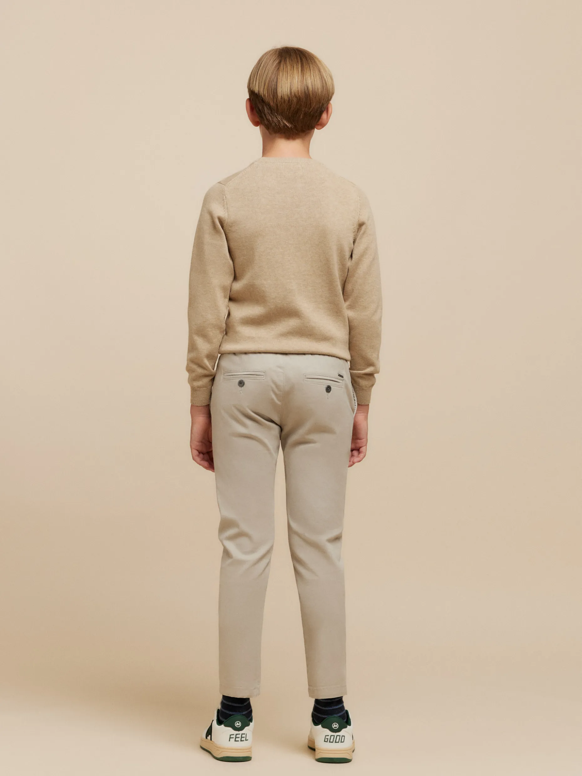 Pantalón con cordones ajustables al tono, cinturilla elástica y cierre mediante botón y cremallera. Tres bolsillos en la parte delantera y dos en la parte trasera con detalle personalizado sobre uno de ellos.