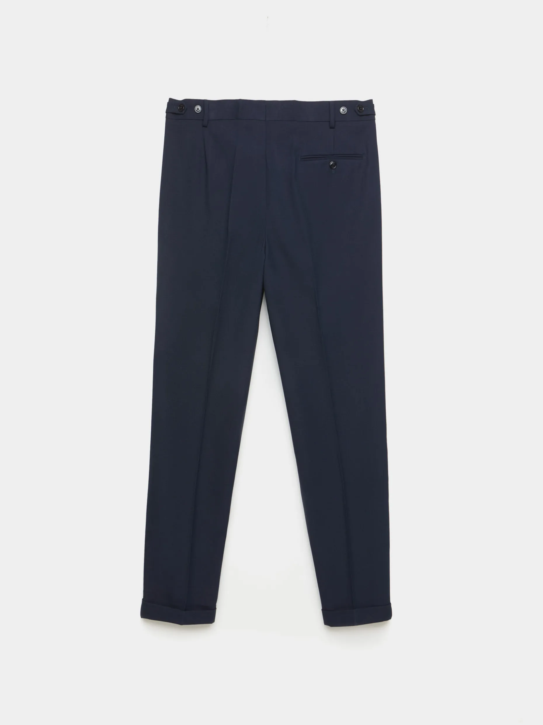 Pantalón de traje que cuenta con la cintura más alta, pinzas en el frontal y cierre mediante cremallera y botones con una pletina prolongada. Dos bolsillos en la parte delantera, dos bolsillos traseros con cierre mediante botón y bajo que termina con una vuelta. Presenta en la cinturilla un ajustador con botones. Forrado en su interior con botones para tirantes.
