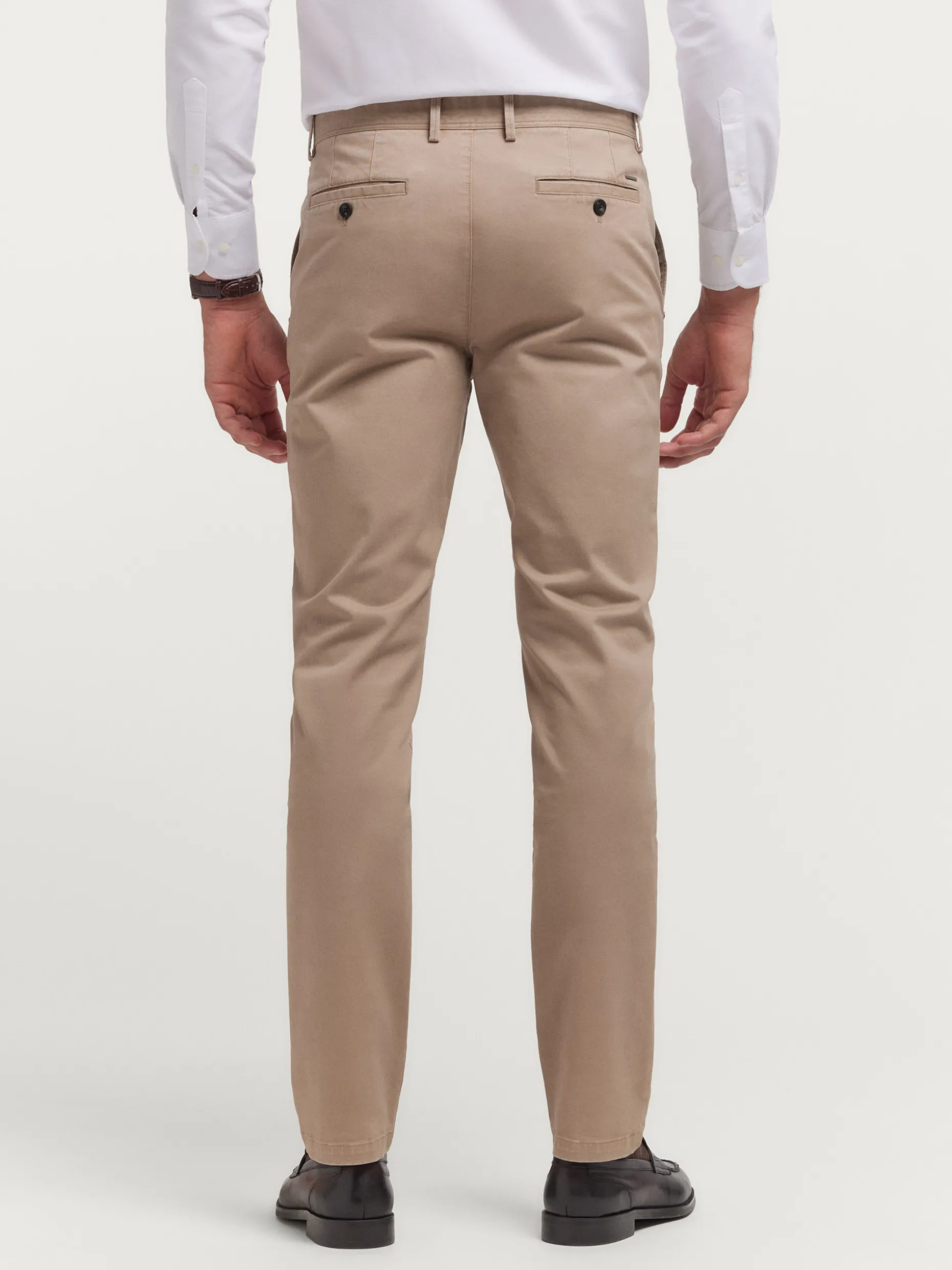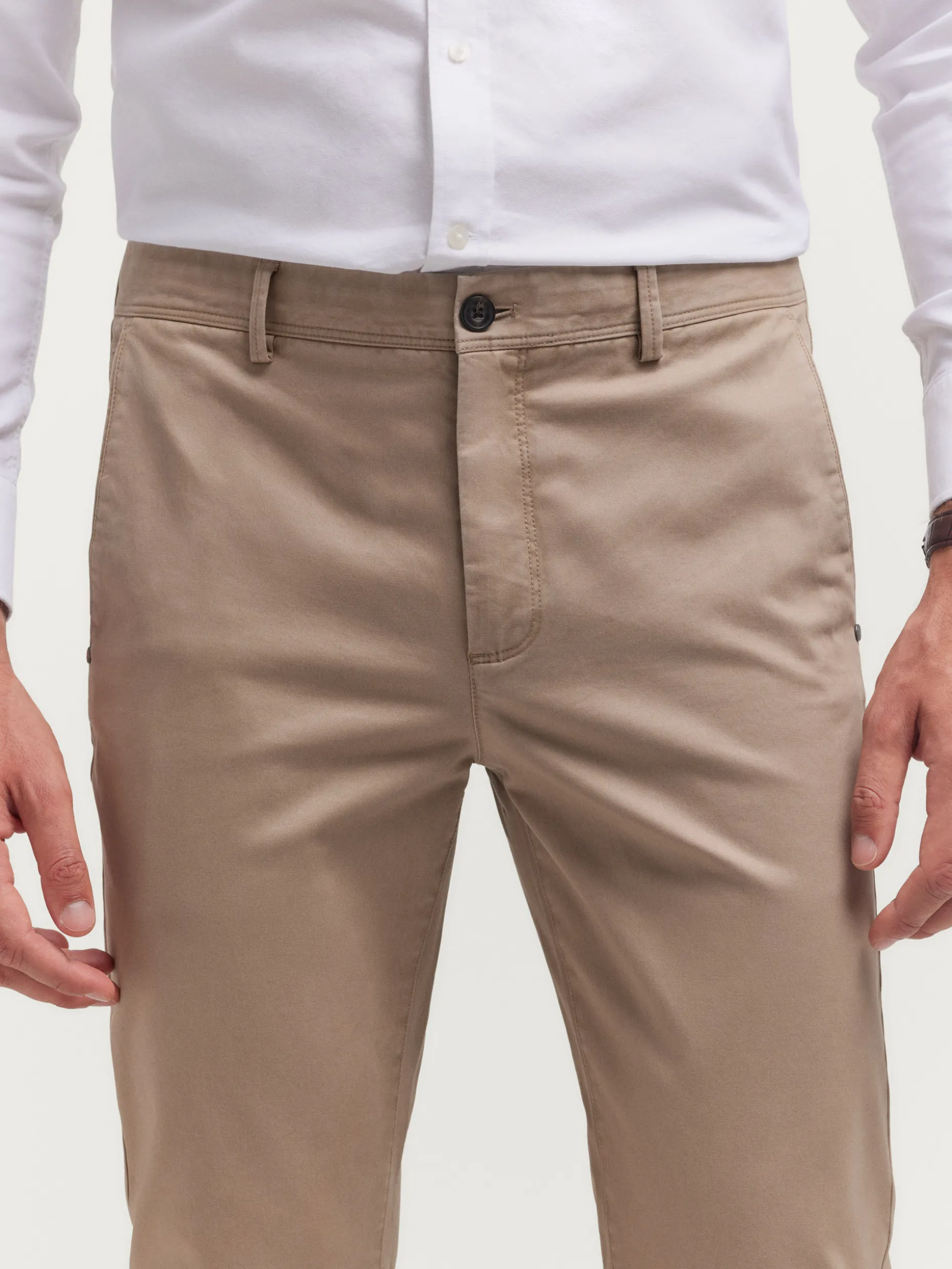 Pantalón estilo chino con cierre central de botón y cremallera, bolsillos tipo chino y detalle personalizado sobre uno de los bolsillos. Corte slim fit.