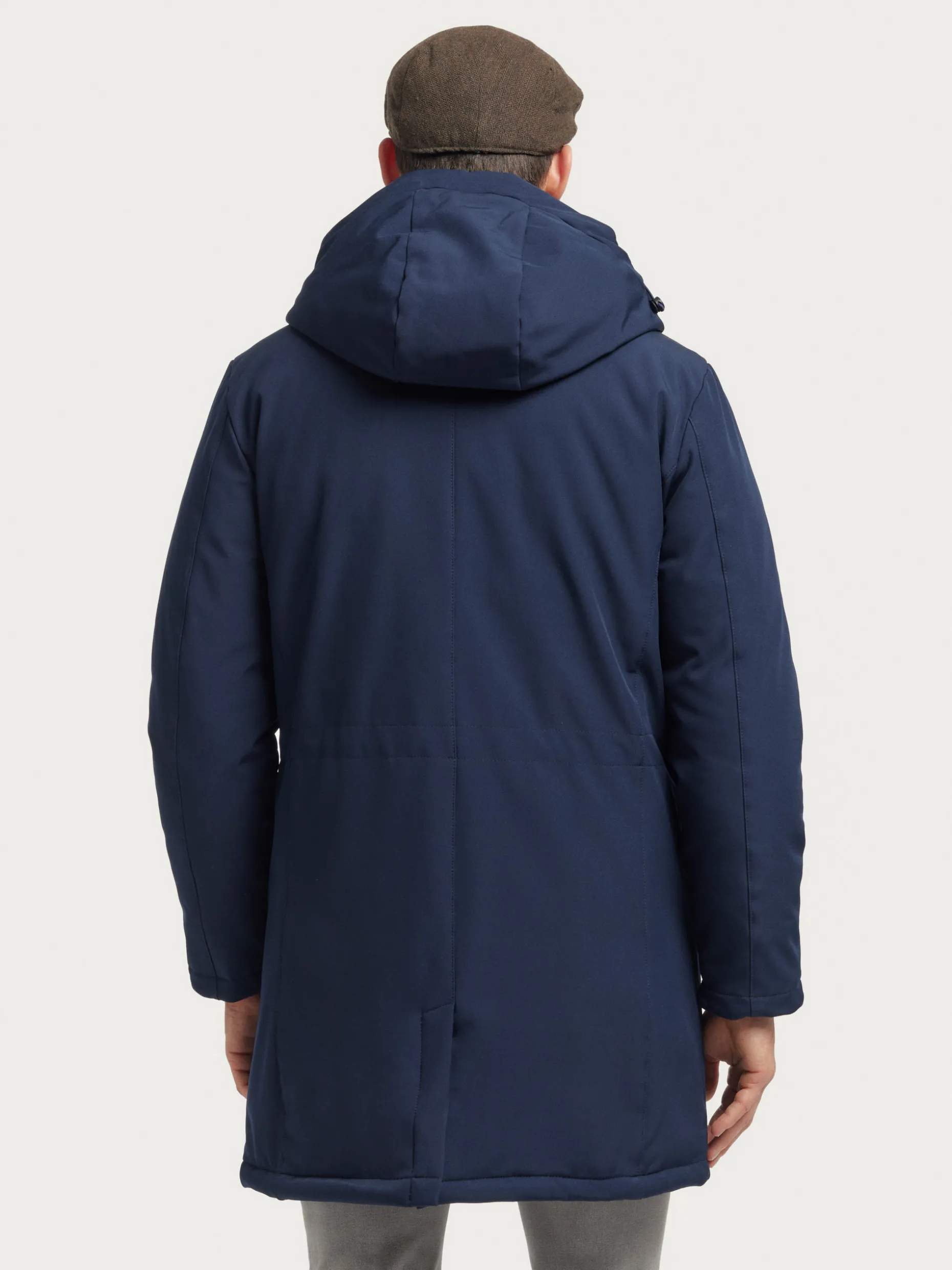 Parka larga con gorro ajustable y cierre central mediante doble cremallera oculta por tapeta de botones a presión. Dos bolsillos a la altura del pecho y dos bolsillos en la cintura. Detalle personalizado en una de sus mangas. Corte regular fit.