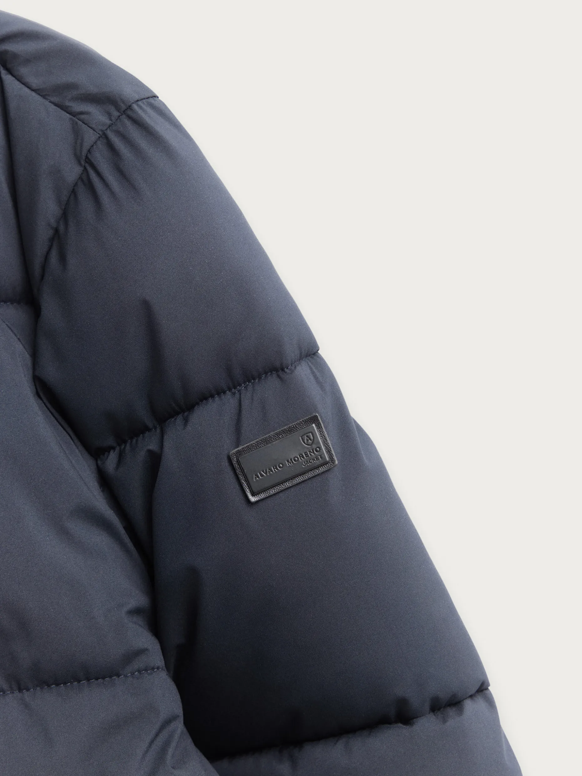 Parka acolchada con cuello subido y cierre central mediante doble cremallera. Dos bolsillos en la cintura, detalle personalizado en una de sus mangas y detalle ajustable en el bajo. Corte regular fit.