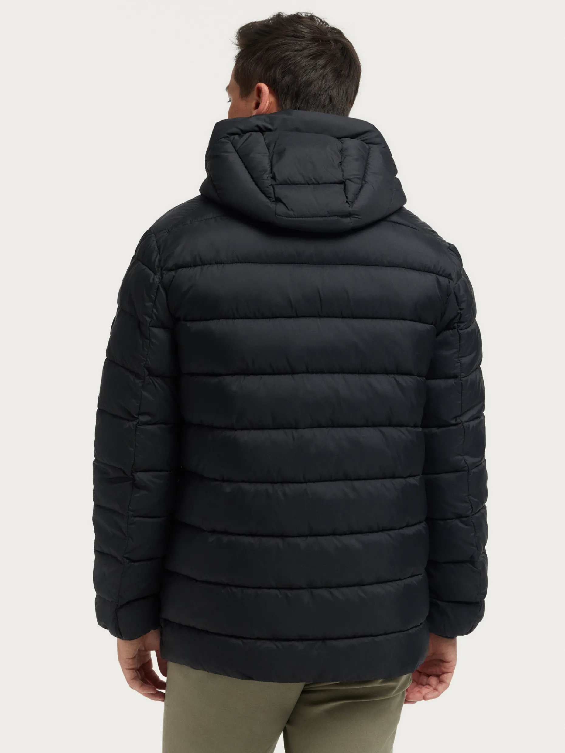 Parka acolchada de corte regular fit. Cuenta con gorro, cierre central mediante cremallera y detalle personalizado en una de las mangas. Interior con bolsillo.